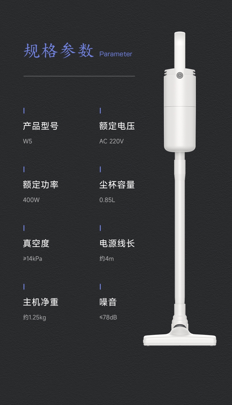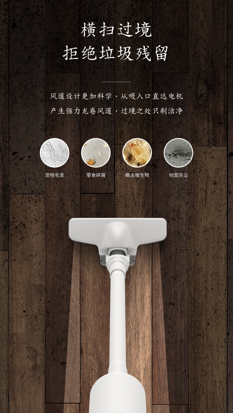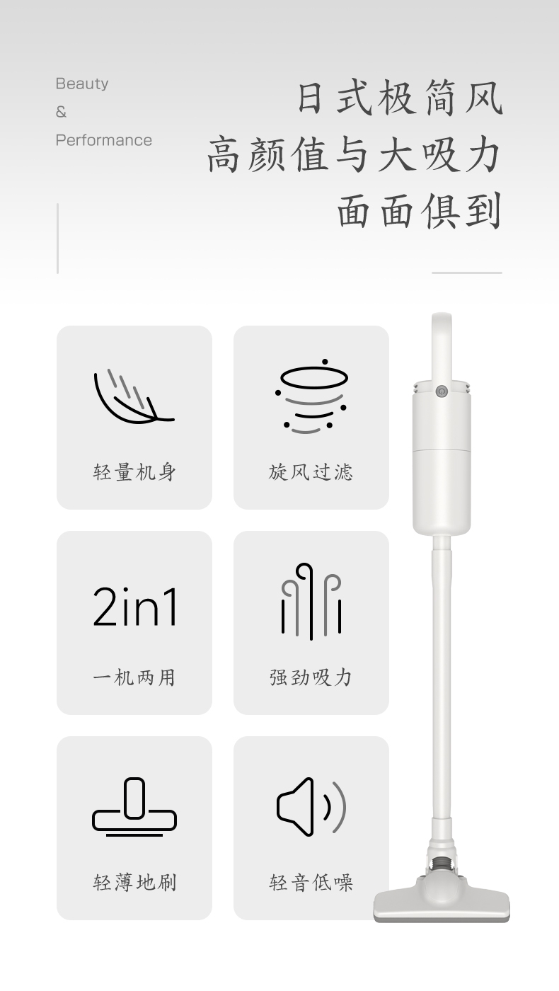 极简风轻量化机身让清洁更轻松;高效智能电机强劲吸力;推杆/手持多功能
