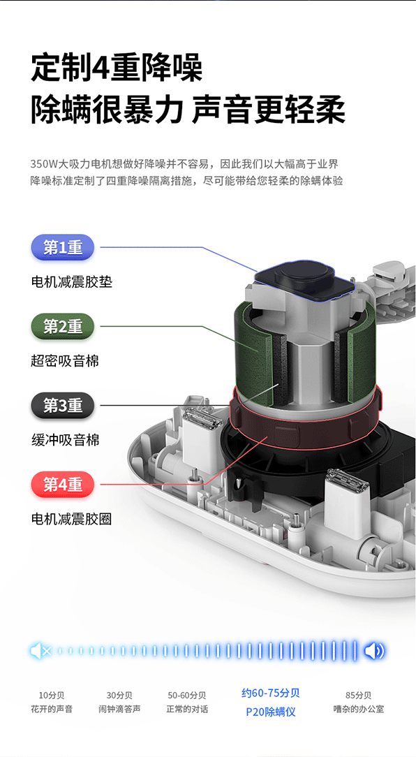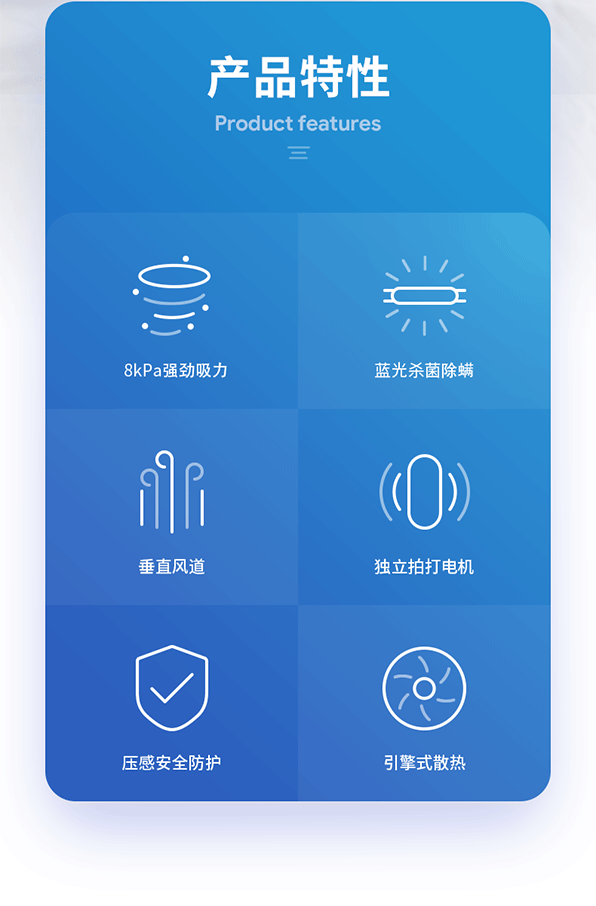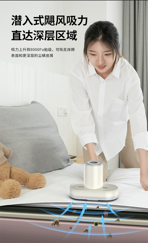 无线设计 使用无束缚 轻便易收纳;加宽蓝光灯深层穿透 清洁除螨更高效;独立电机仿生高频拍打 拍出来的 才杀的干净
