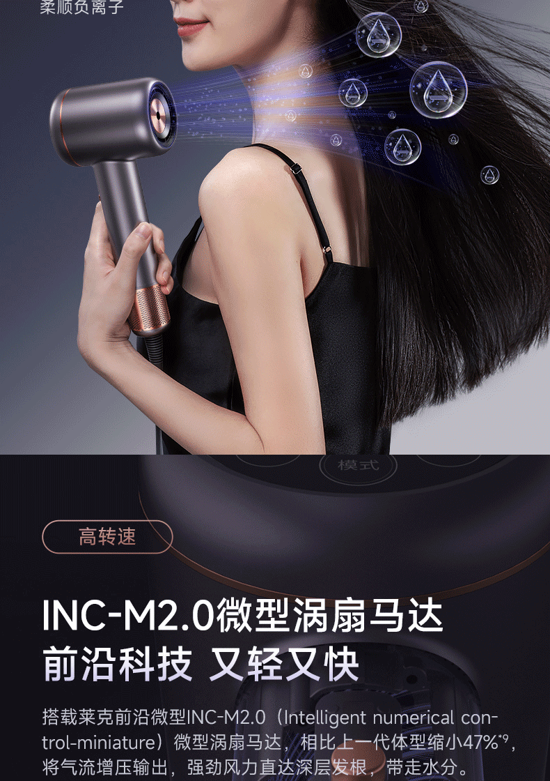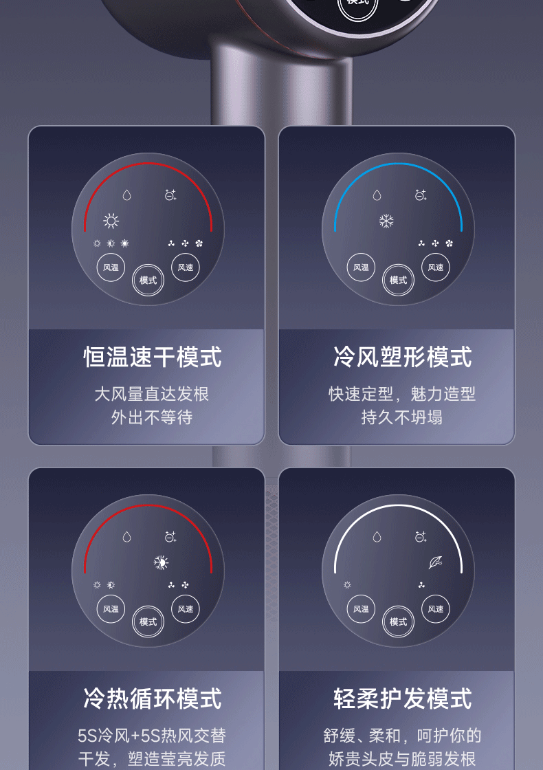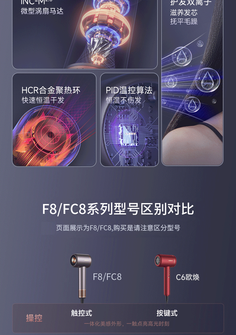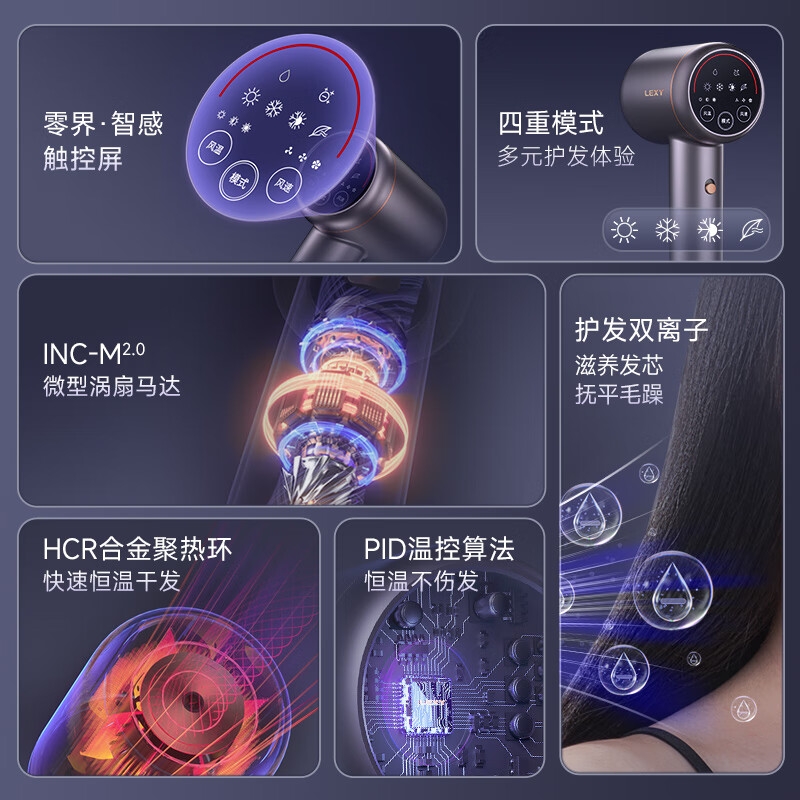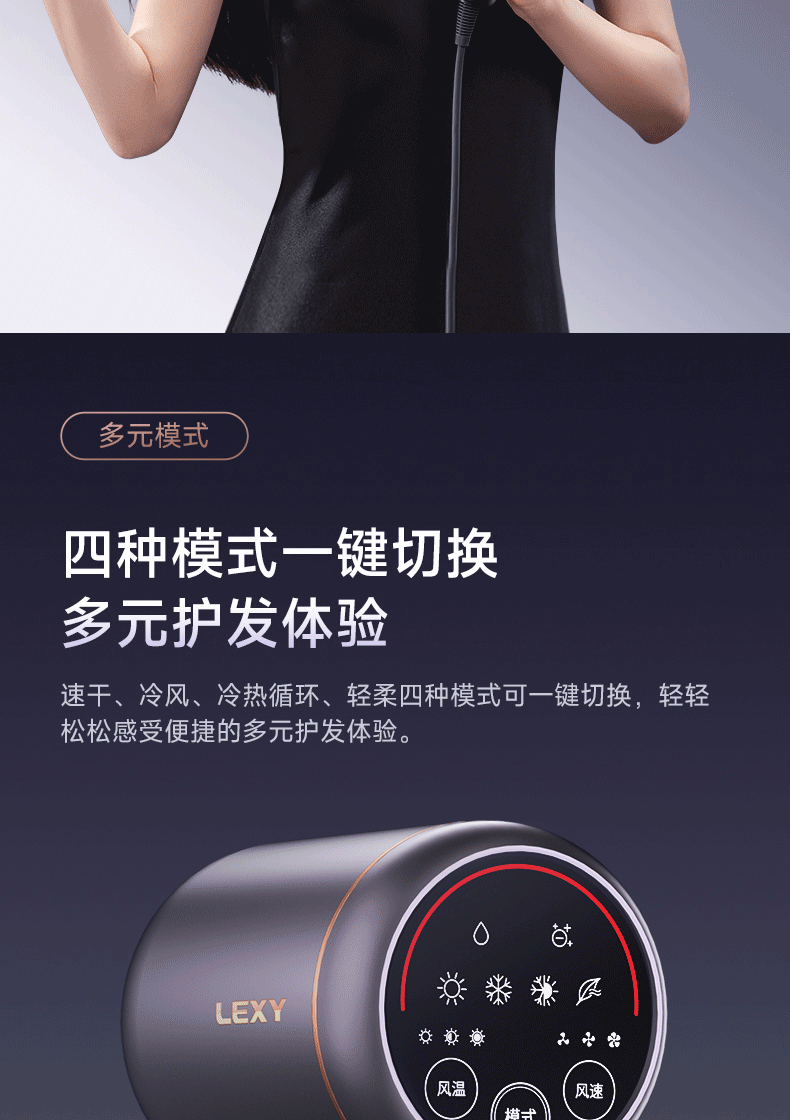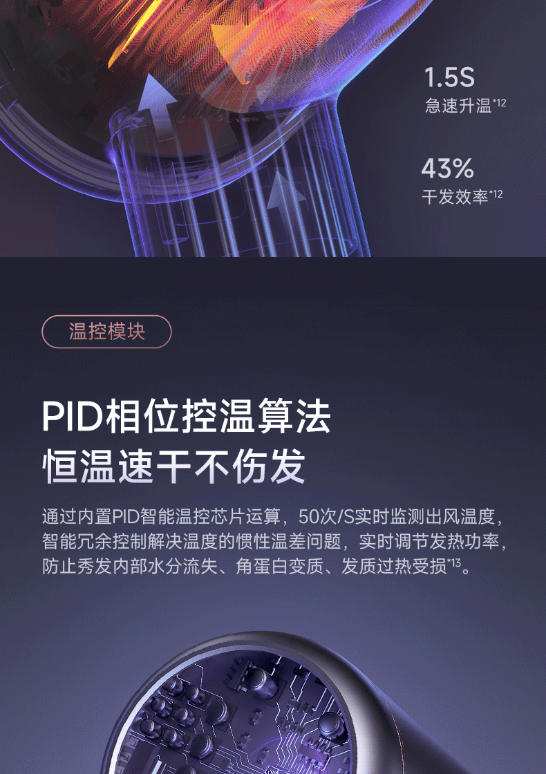 PID控温技术 恒温不伤发;冷热循环模式;负离子除静电去毛躁
