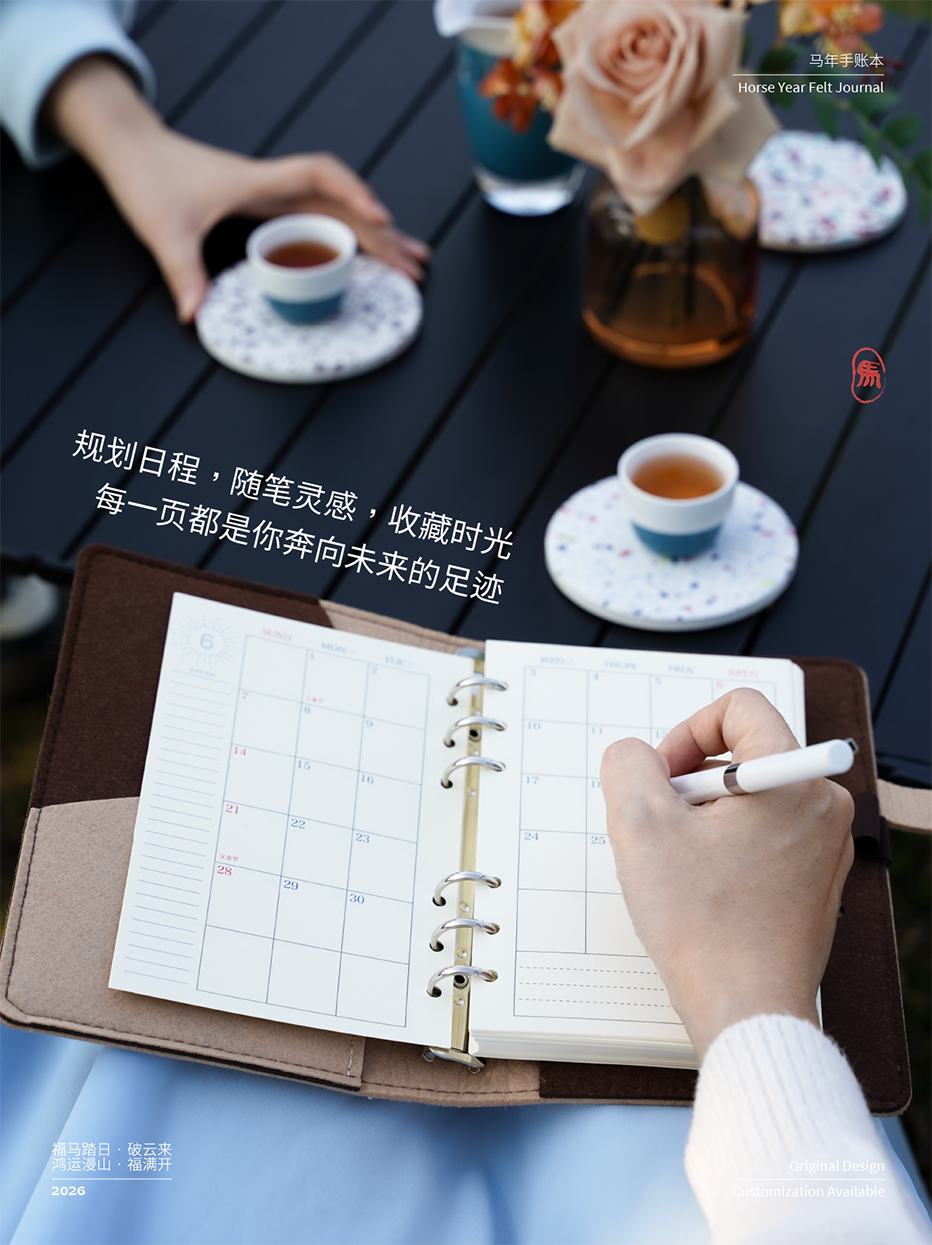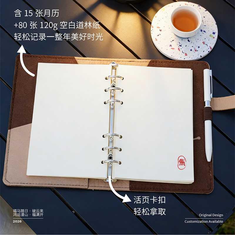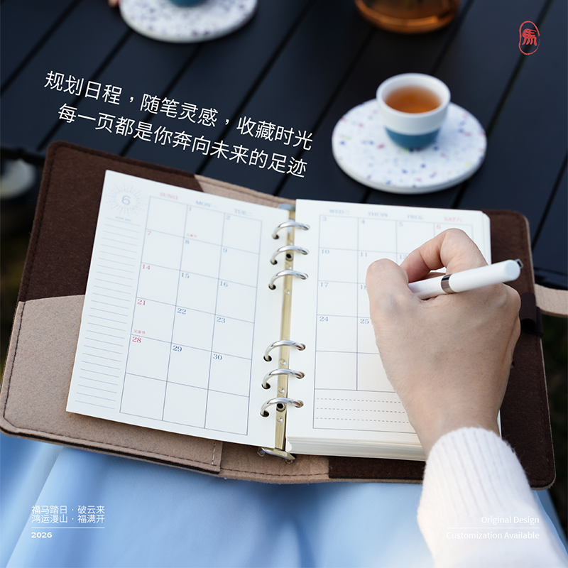 功能:内含垫板、记事月历、内格收纳、固定笔位