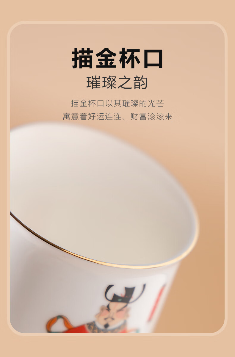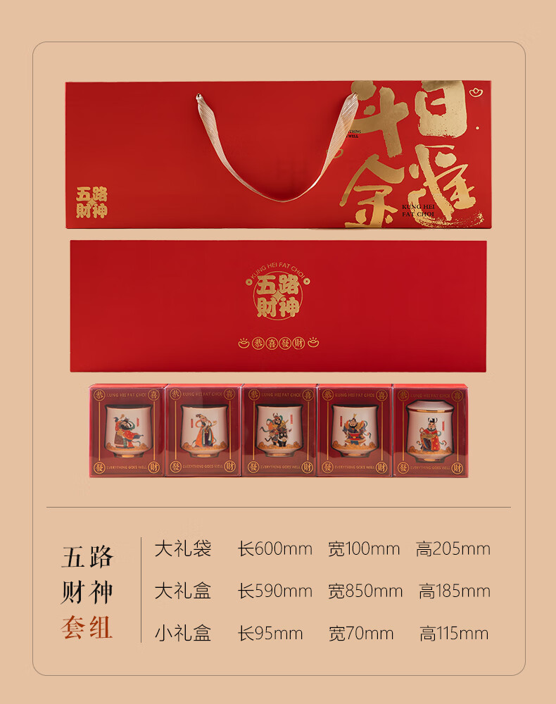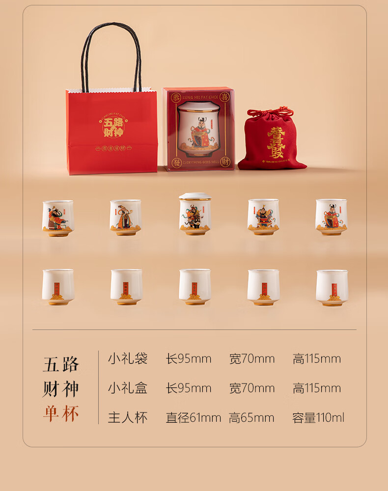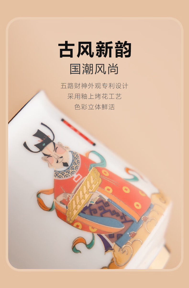五路财神:将中国神话人物萌化后融入茶器的设计元素中;通过原创画师一笔一划的勾勒将传统国风文化展现眼前。;随身携带走哪都发财