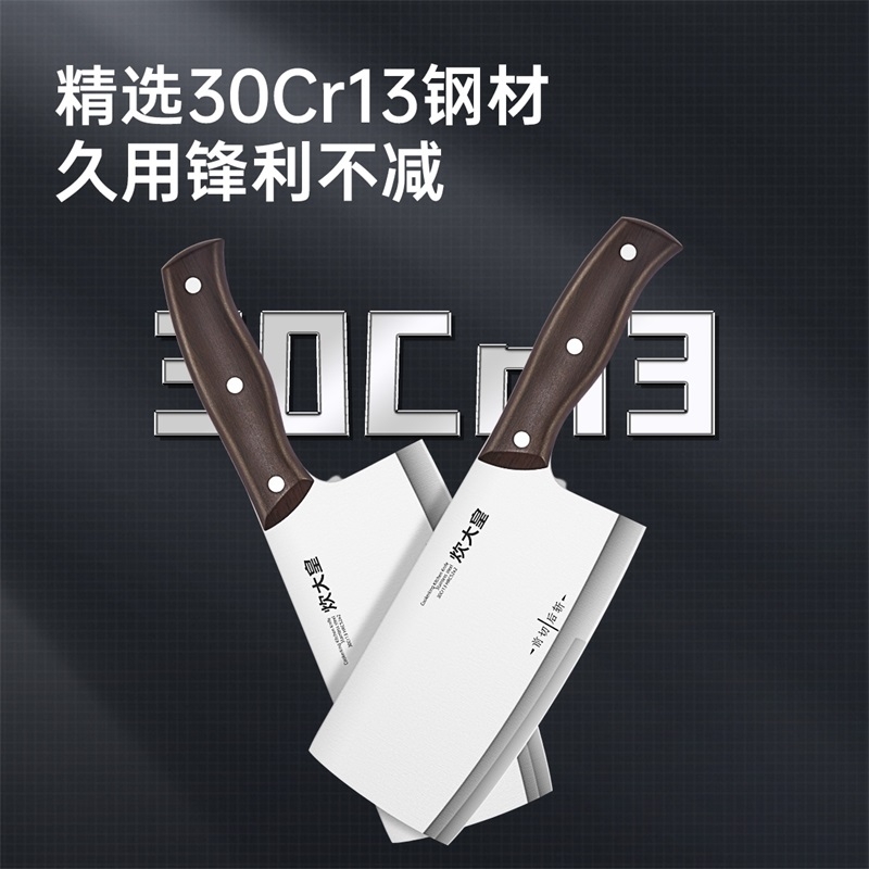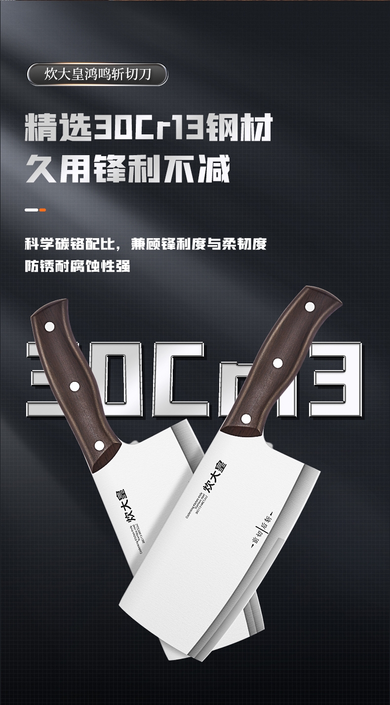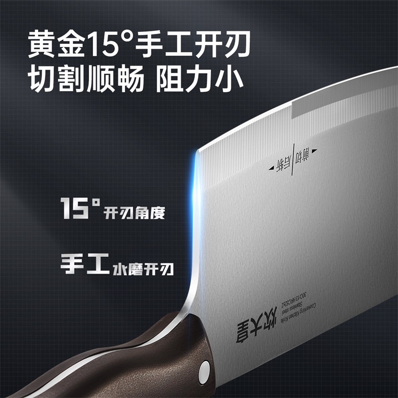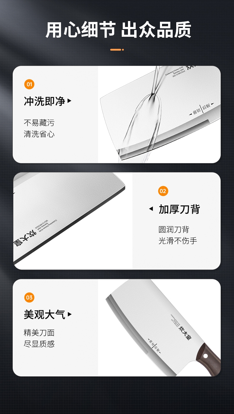 精钢锻造,锋利持久;采用30Cr13高碳不锈钢刀;2.5mm加厚刀背设计,平衡性与支撑力更强