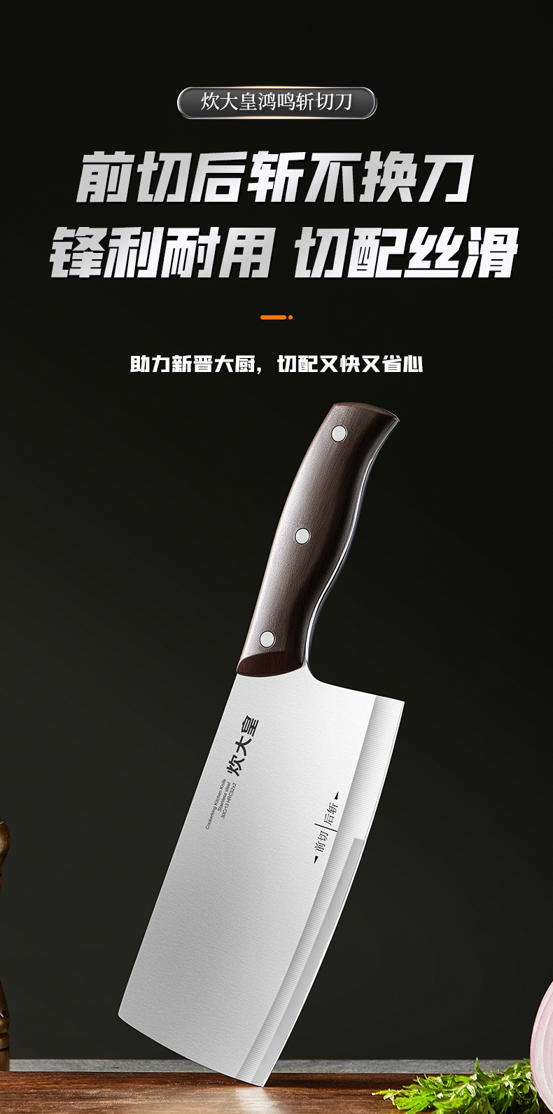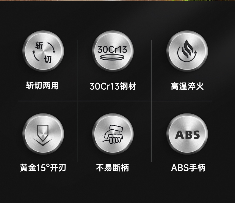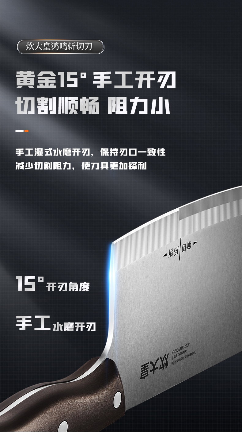 精钢锻造,锋利持久;采用30Cr13高碳不锈钢刀;2.5mm加厚刀背设计,平衡性与支撑力更强