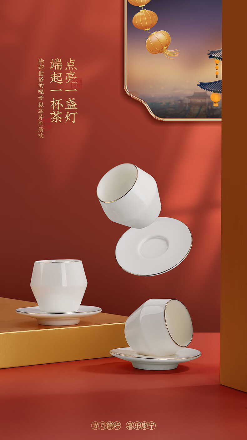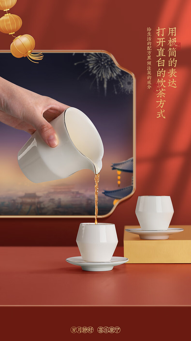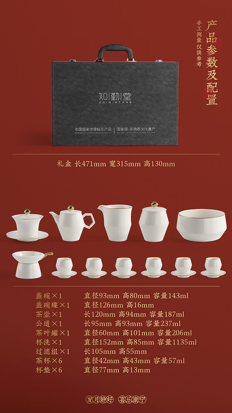 配置:三才盖碗*1、茶壶*1、杯子*6、杯垫*6、茶海*1、茶叶罐*1、过滤*1、过滤底托*1、茶洗*1、