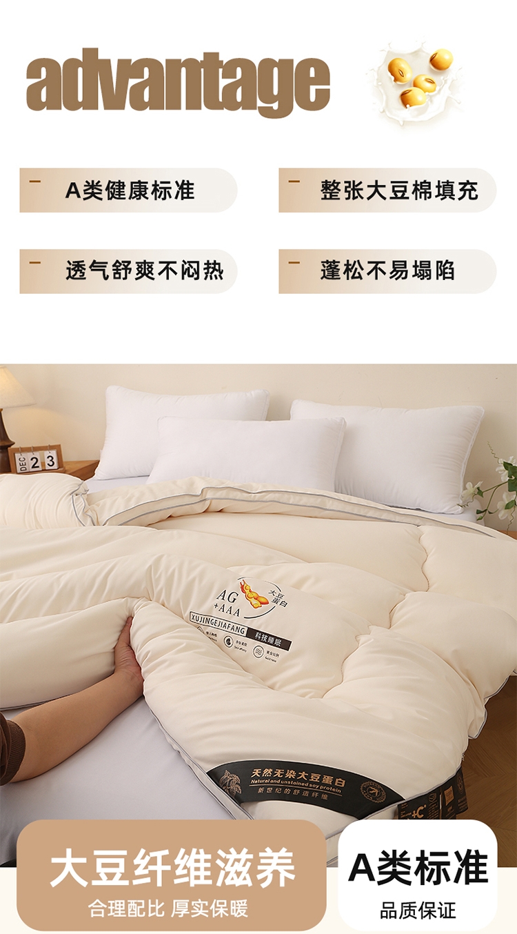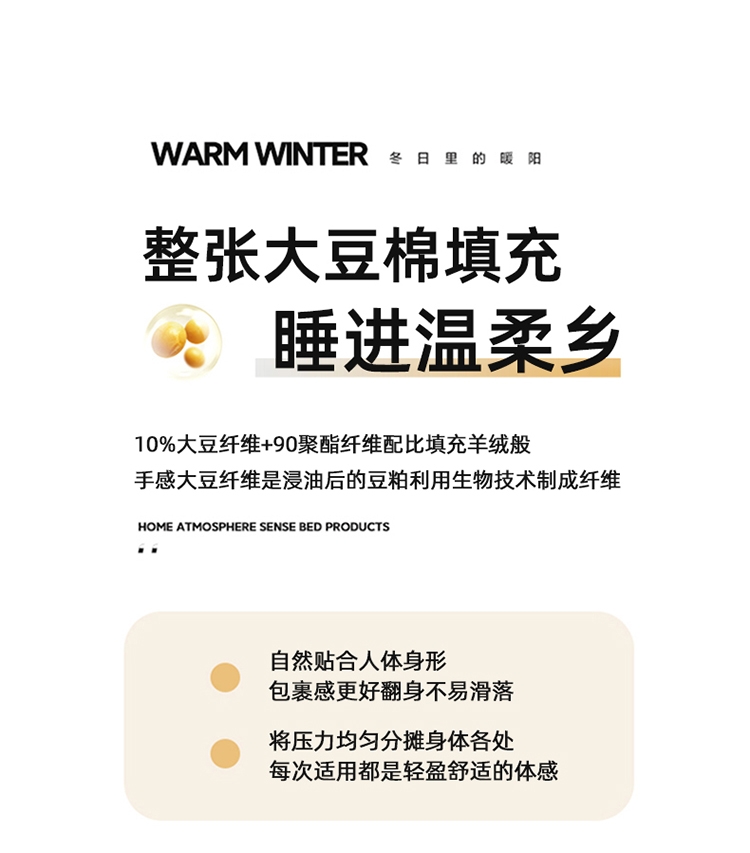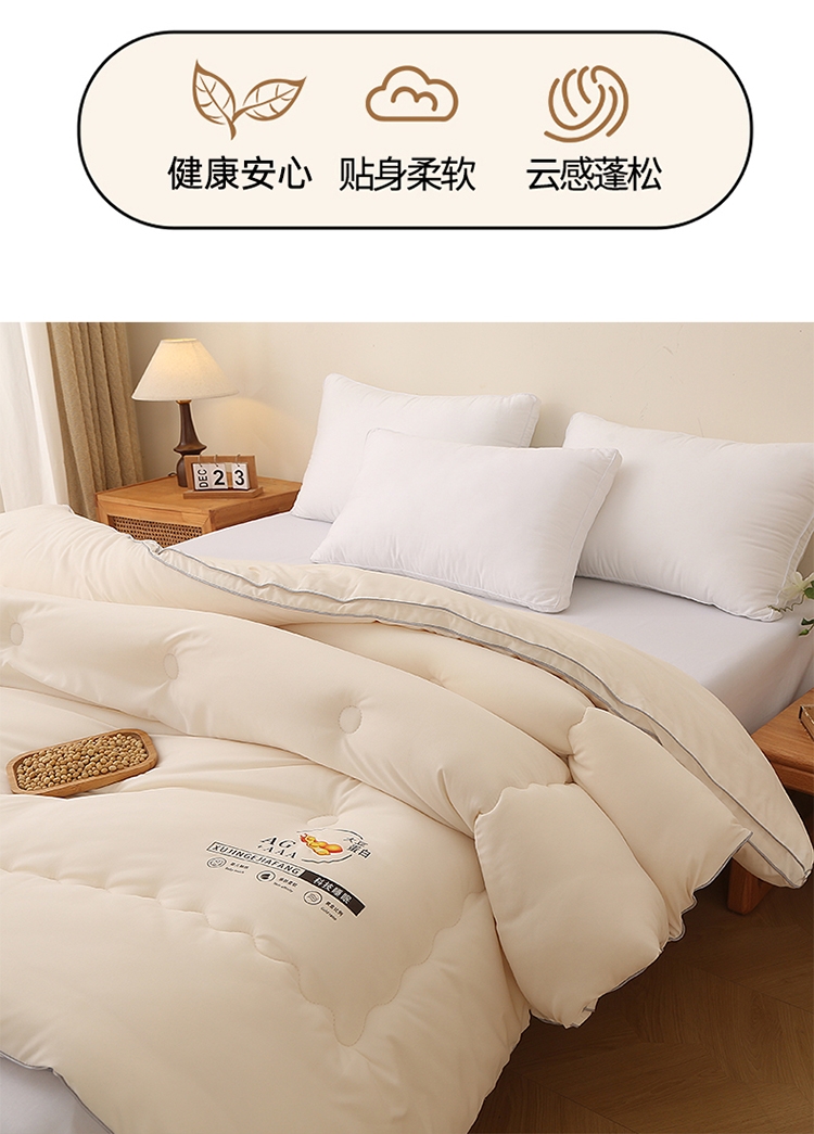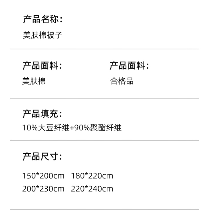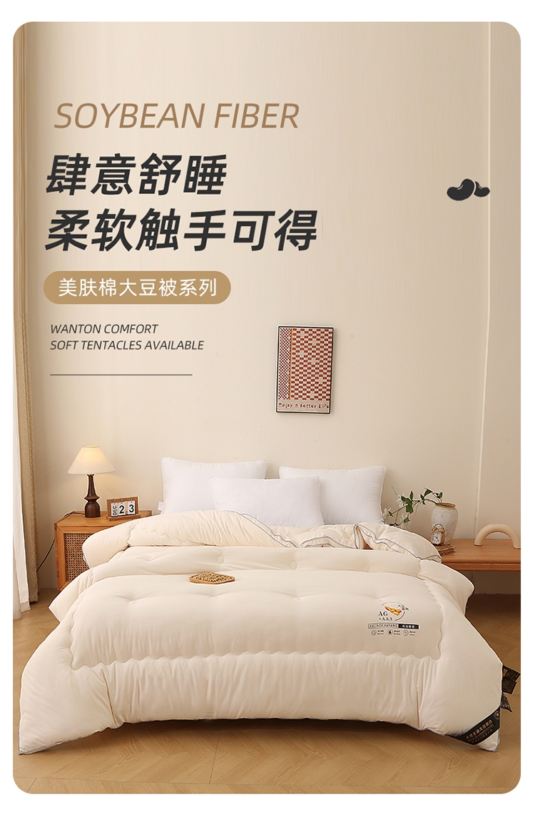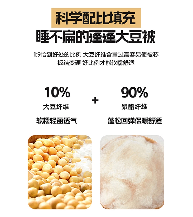 肆意舒睡柔软触手可得 美肤棉大豆被系列;美肤棉面料 柔软亲肤 透气不闷 手感顺滑肌 ;10%大豆纤维+90聚酯纤维配比填充羊绒般手感