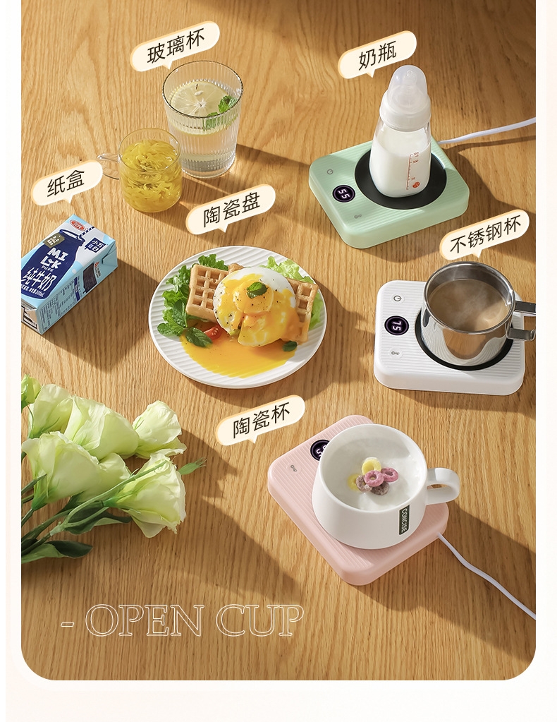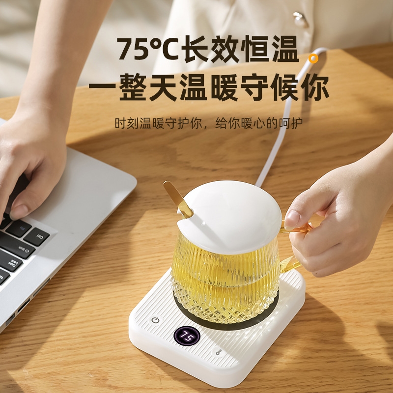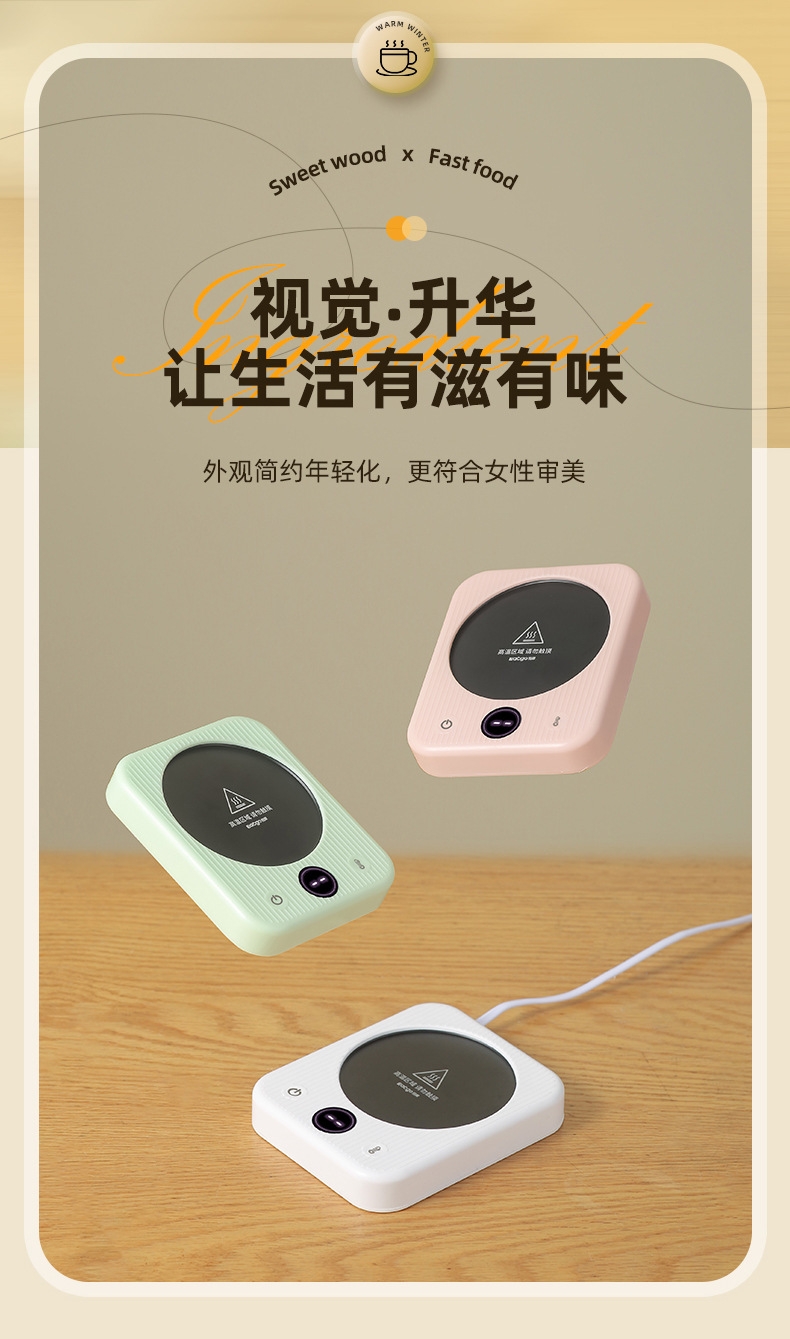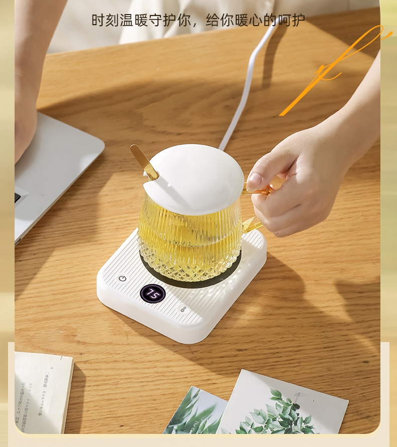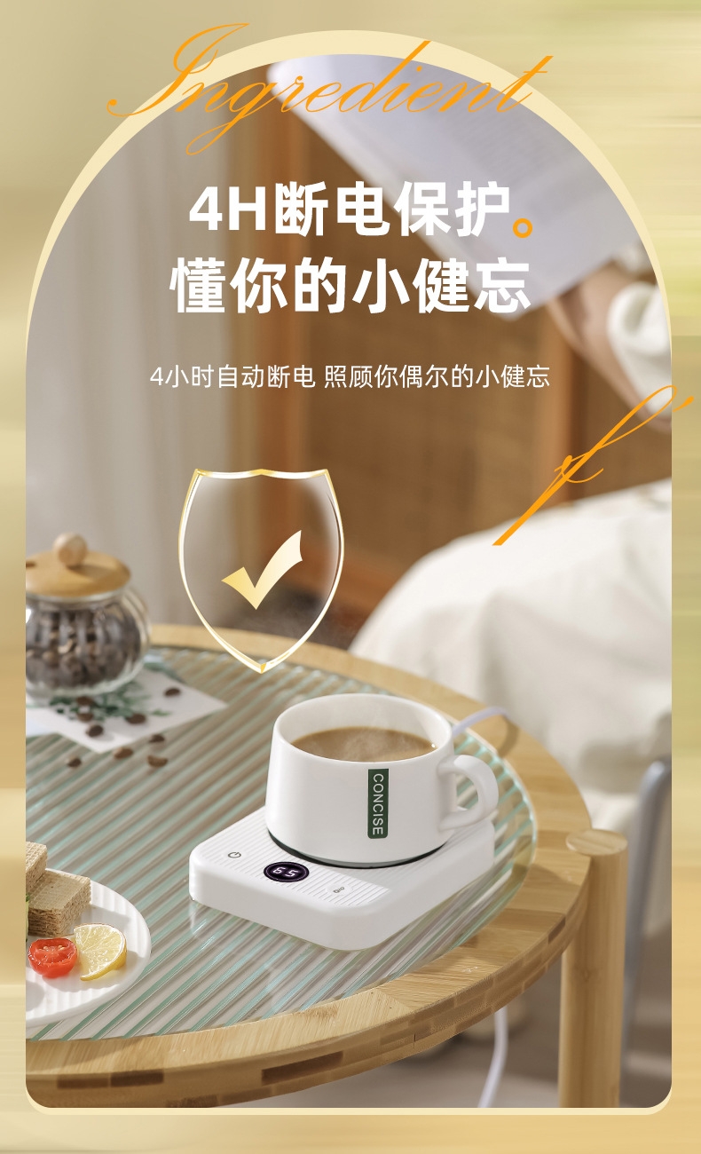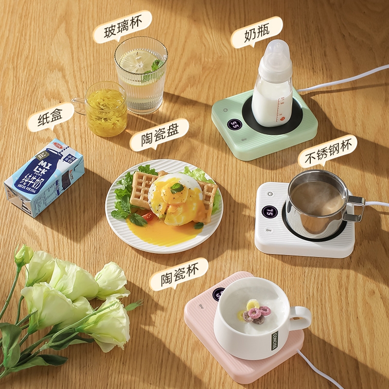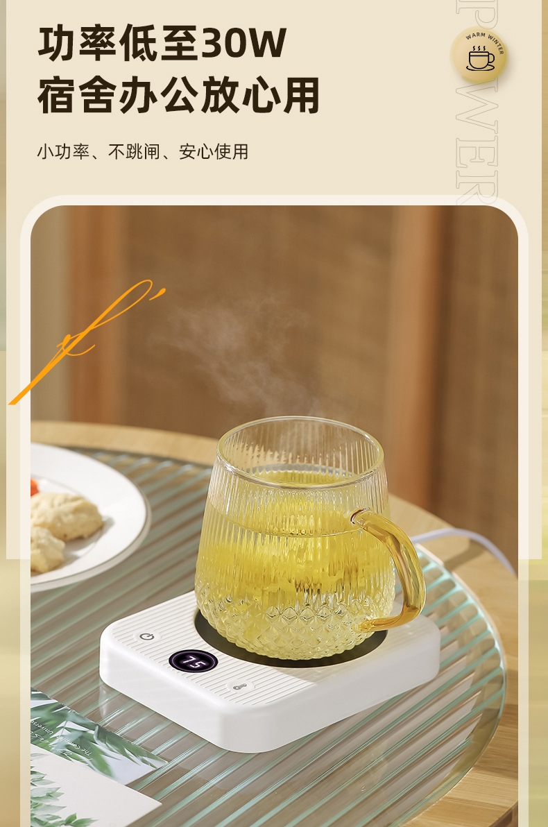 双核PTC无光无噪加热;百搭不挑杯:纸盒、玻璃杯、奶瓶、陶瓷杯/盘、不锈钢;三档调温:55度热牛奶,65度花果茶,75度热咖啡;75度长效恒温,4小时自动断电保护;30W低功率,宿舍办公放心用
