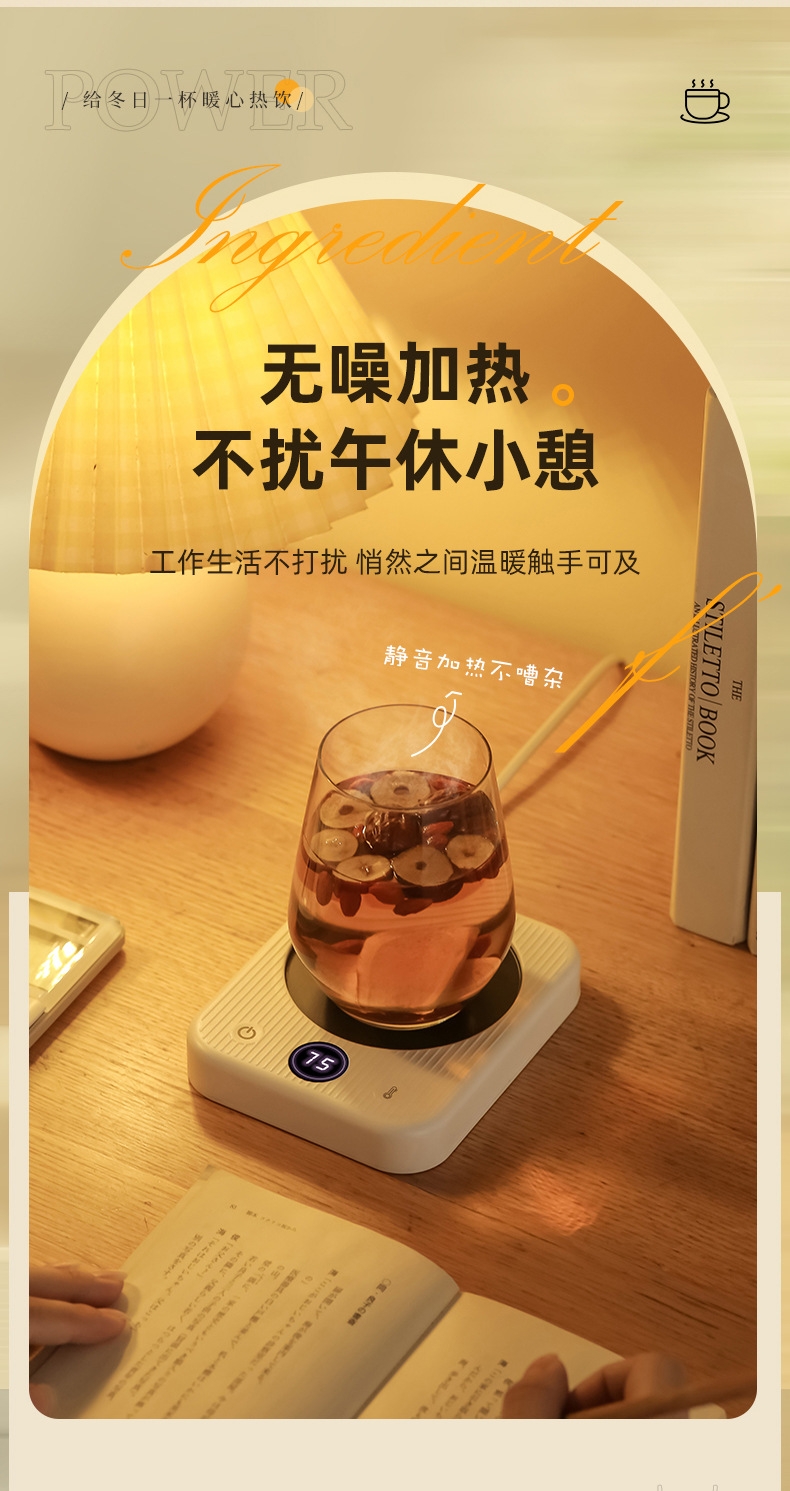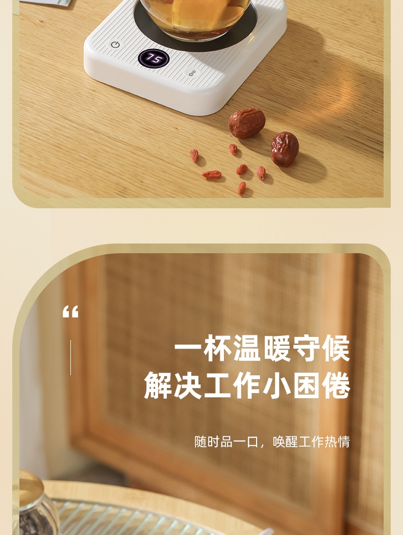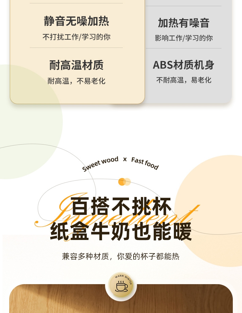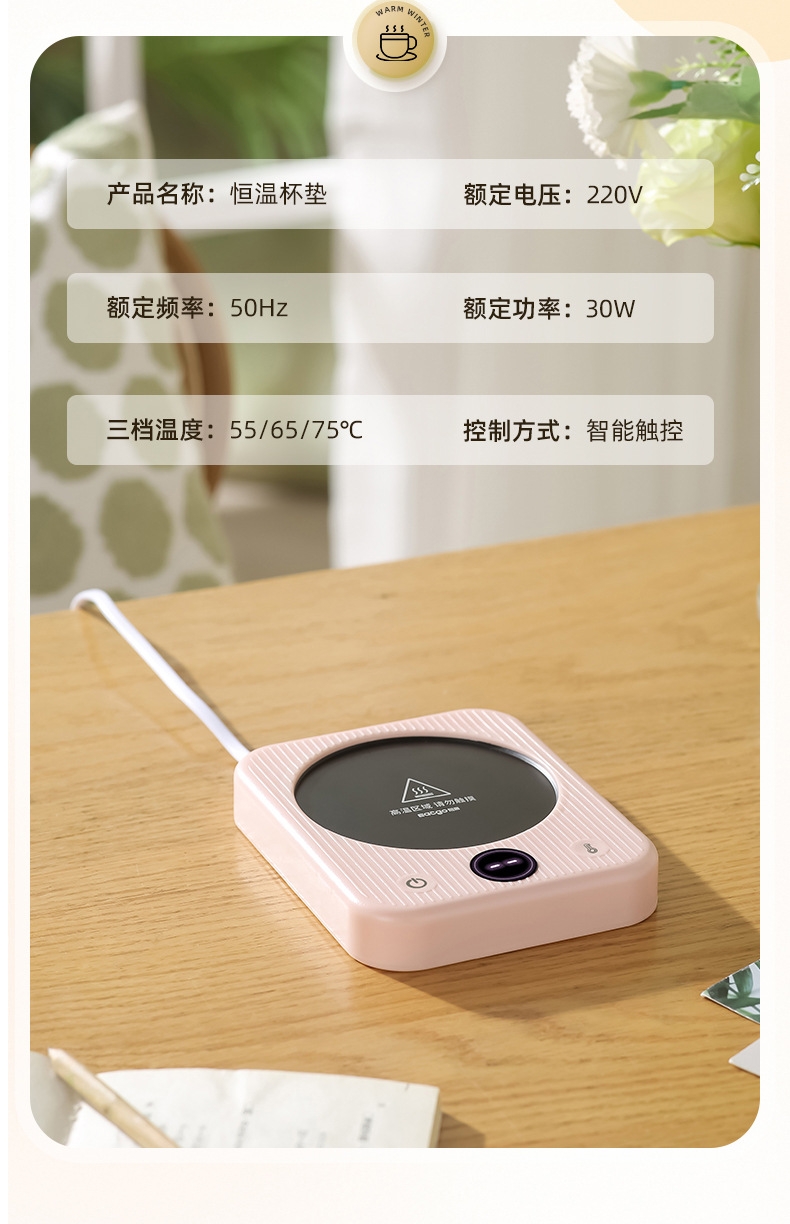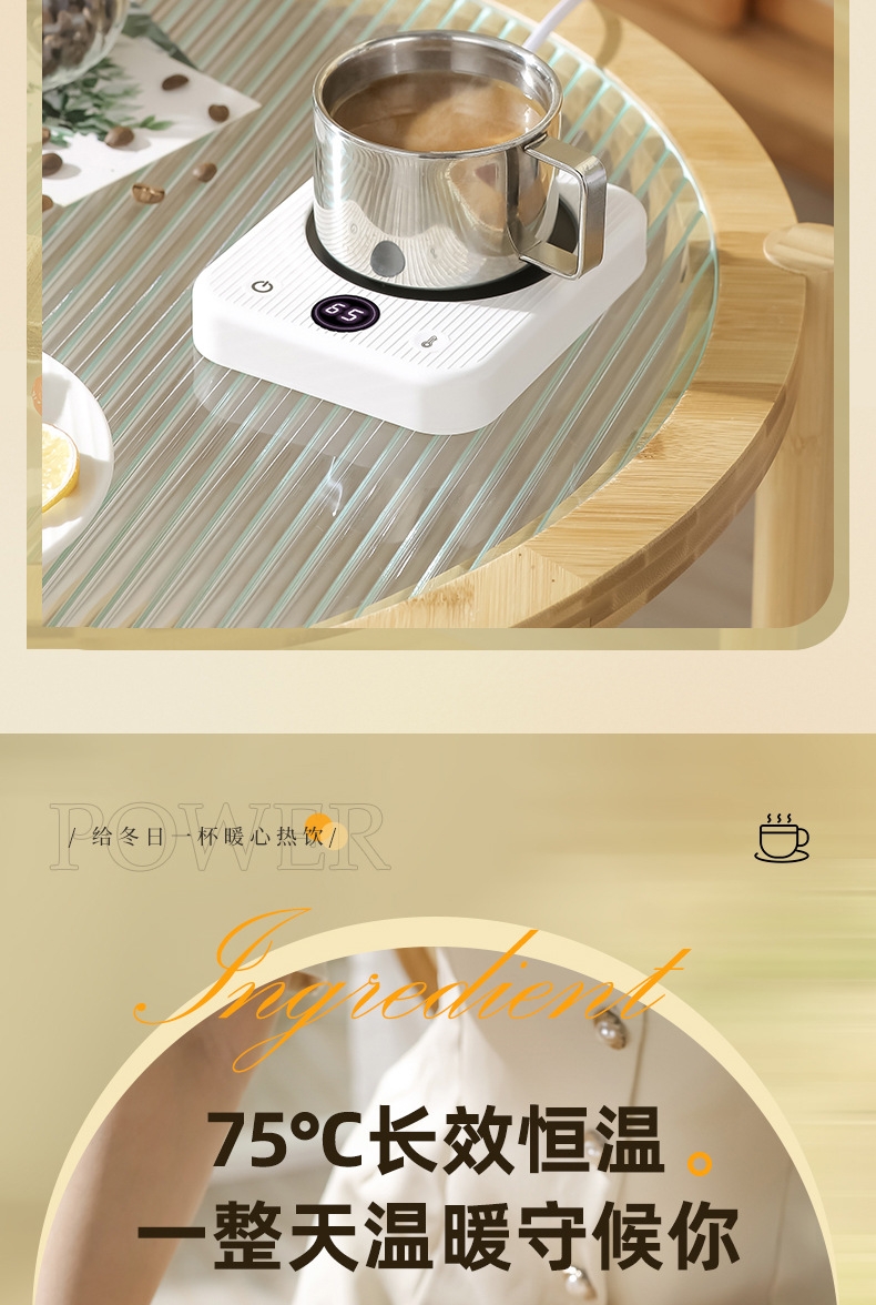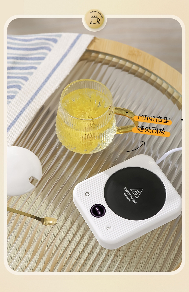 双核PTC无光无噪加热;百搭不挑杯:纸盒、玻璃杯、奶瓶、陶瓷杯/盘、不锈钢;三档调温:55度热牛奶,65度花果茶,75度热咖啡;75度长效恒温,4小时自动断电保护;30W低功率,宿舍办公放心用