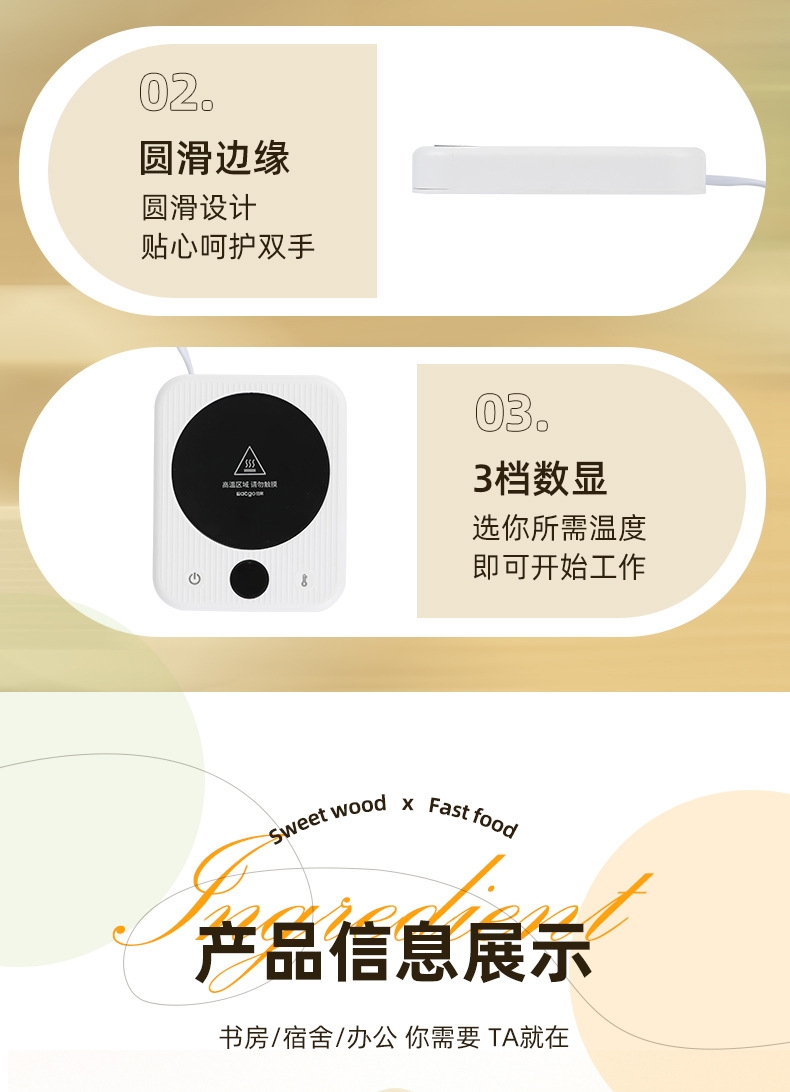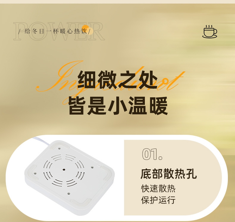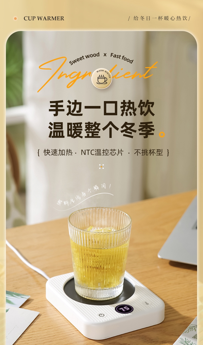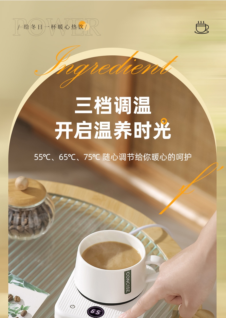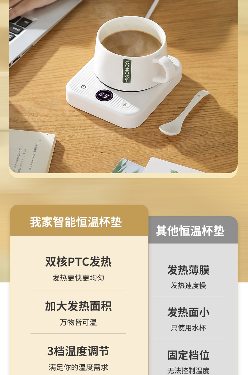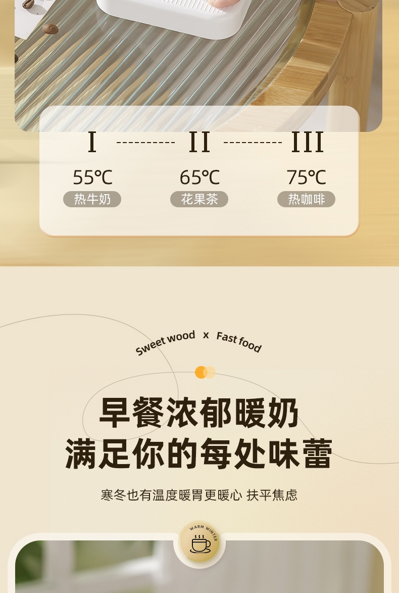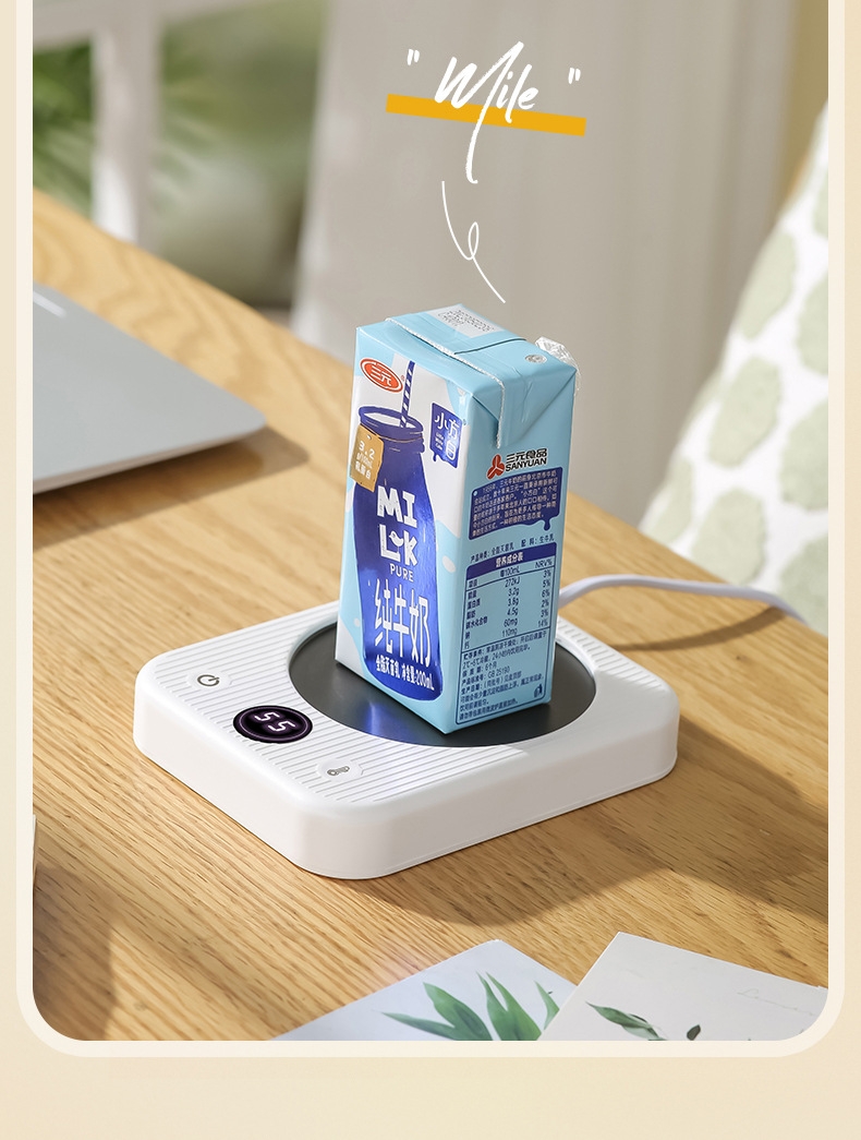 双核PTC无光无噪加热;百搭不挑杯:纸盒、玻璃杯、奶瓶、陶瓷杯/盘、不锈钢;三档调温:55度热牛奶,65度花果茶,75度热咖啡;75度长效恒温,4小时自动断电保护;30W低功率,宿舍办公放心用