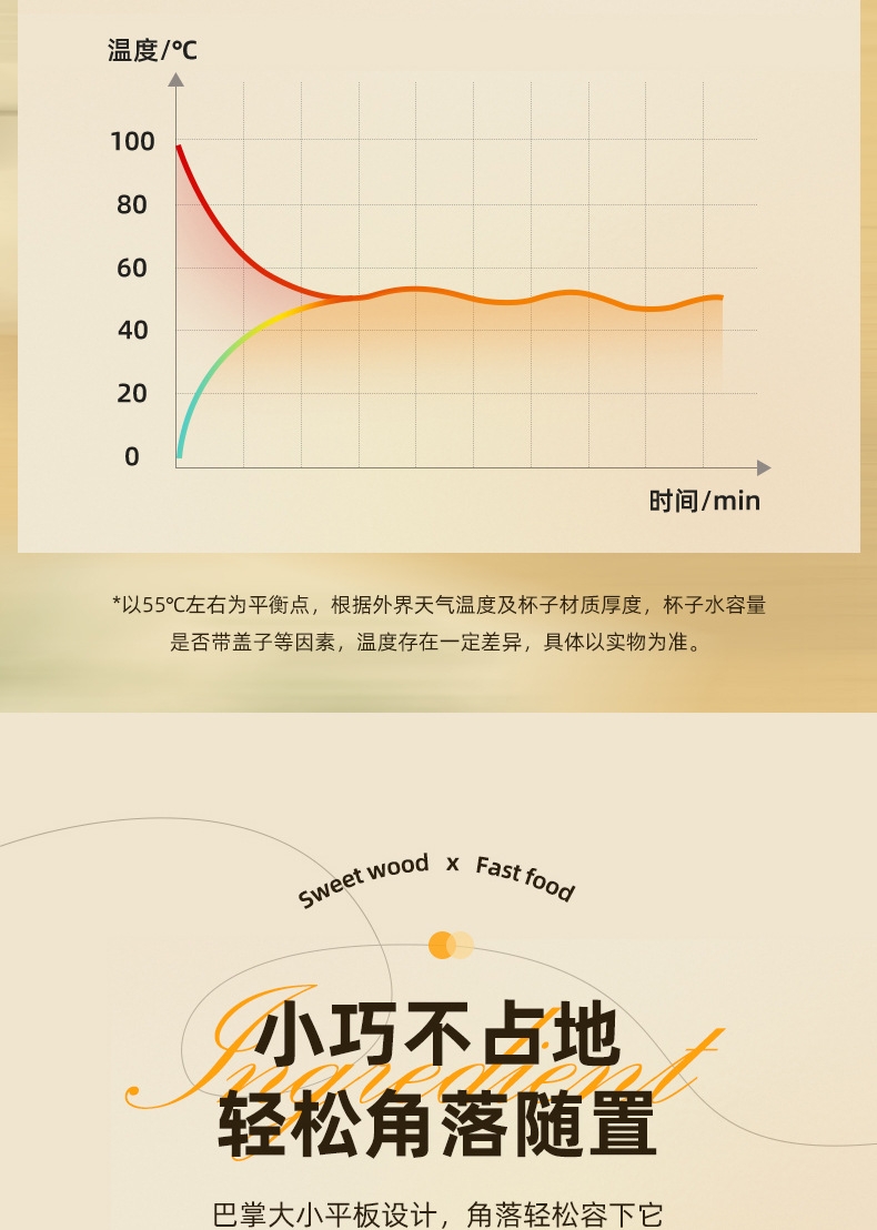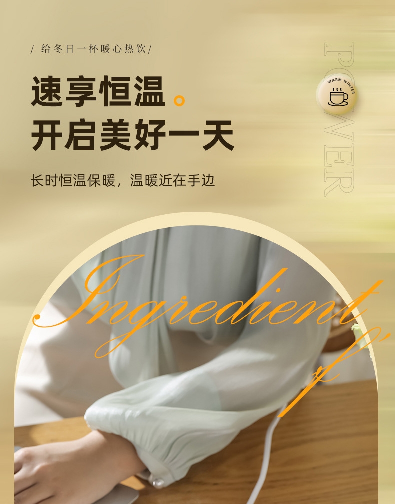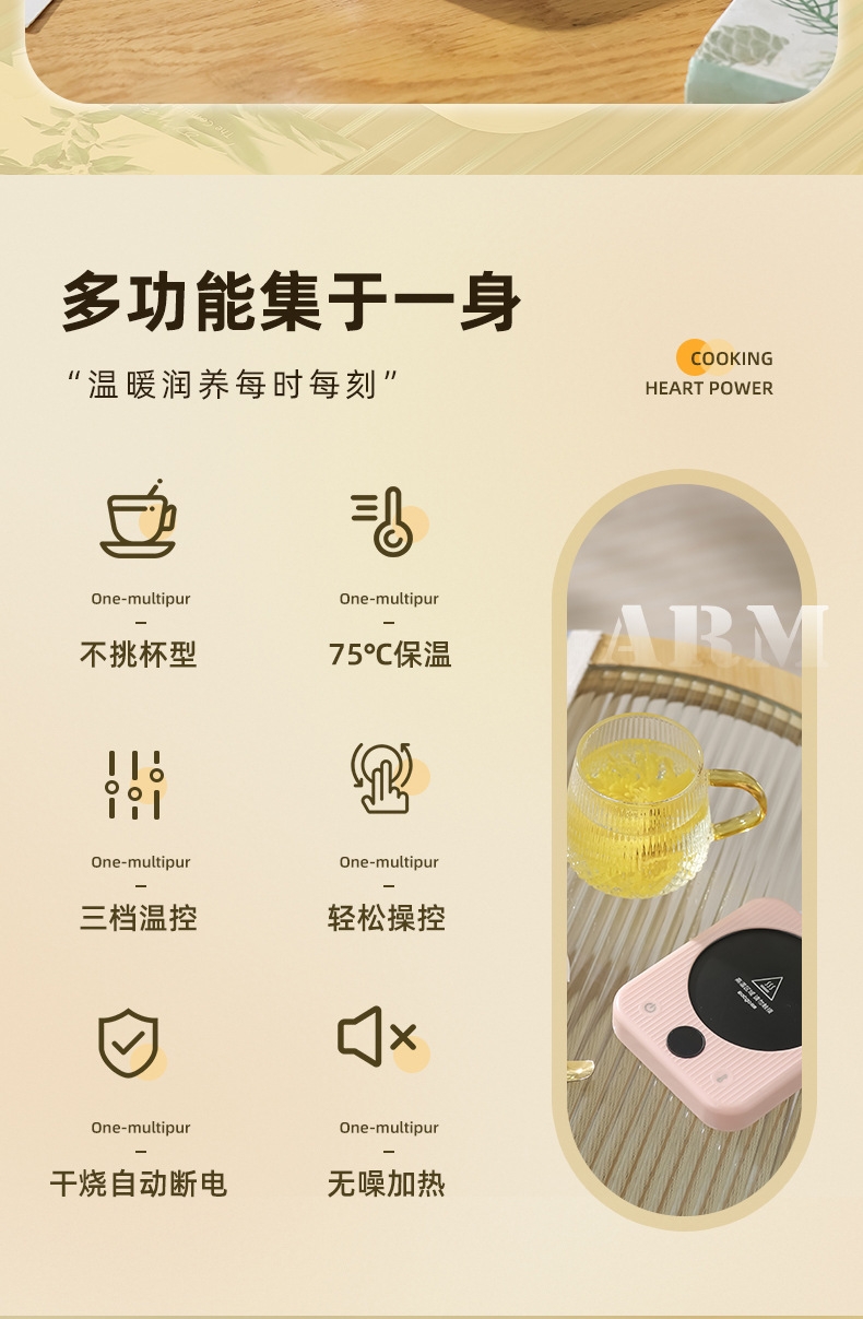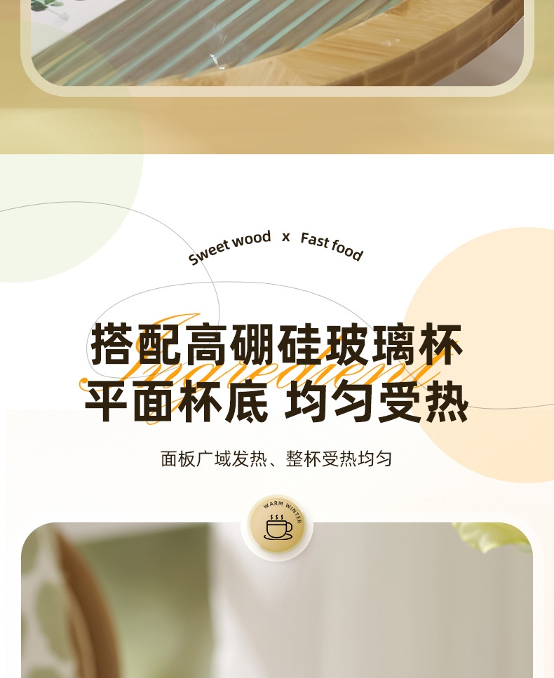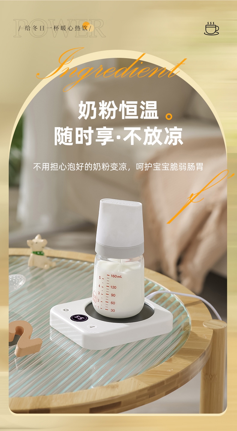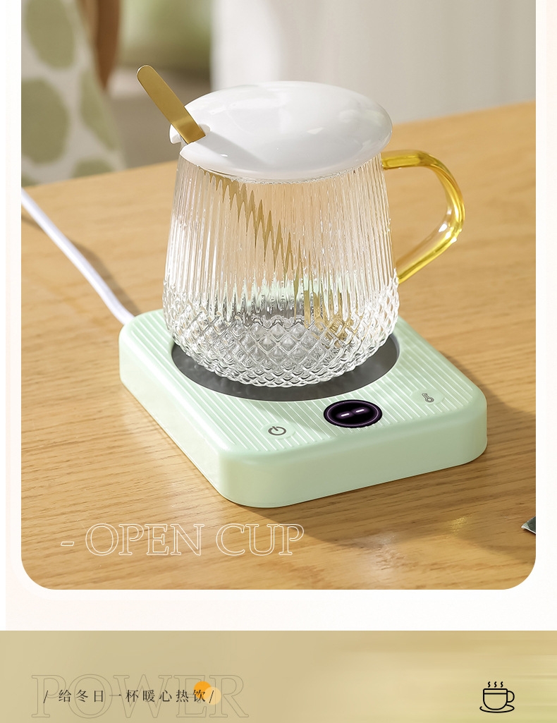 双核PTC无光无噪加热;百搭不挑杯:纸盒、玻璃杯、奶瓶、陶瓷杯/盘、不锈钢;三档调温:55度热牛奶,65度花果茶,75度热咖啡;75度长效恒温,4小时自动断电保护;30W低功率,宿舍办公放心用
