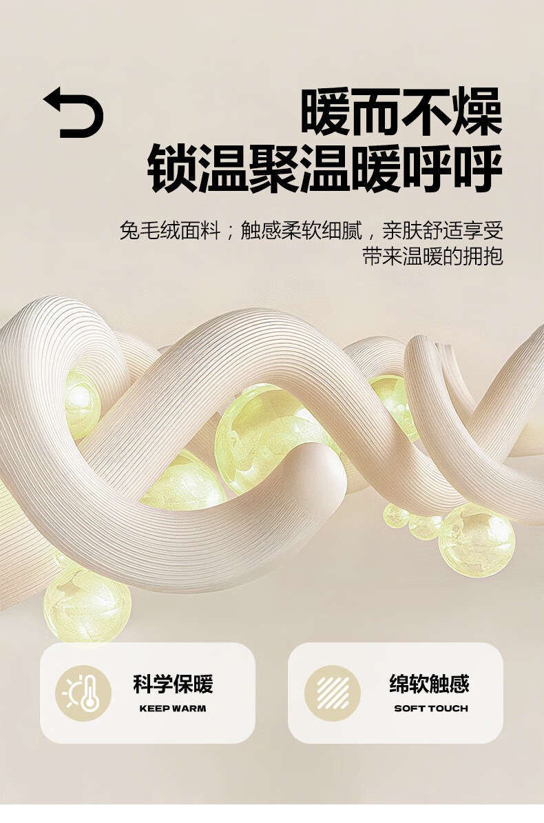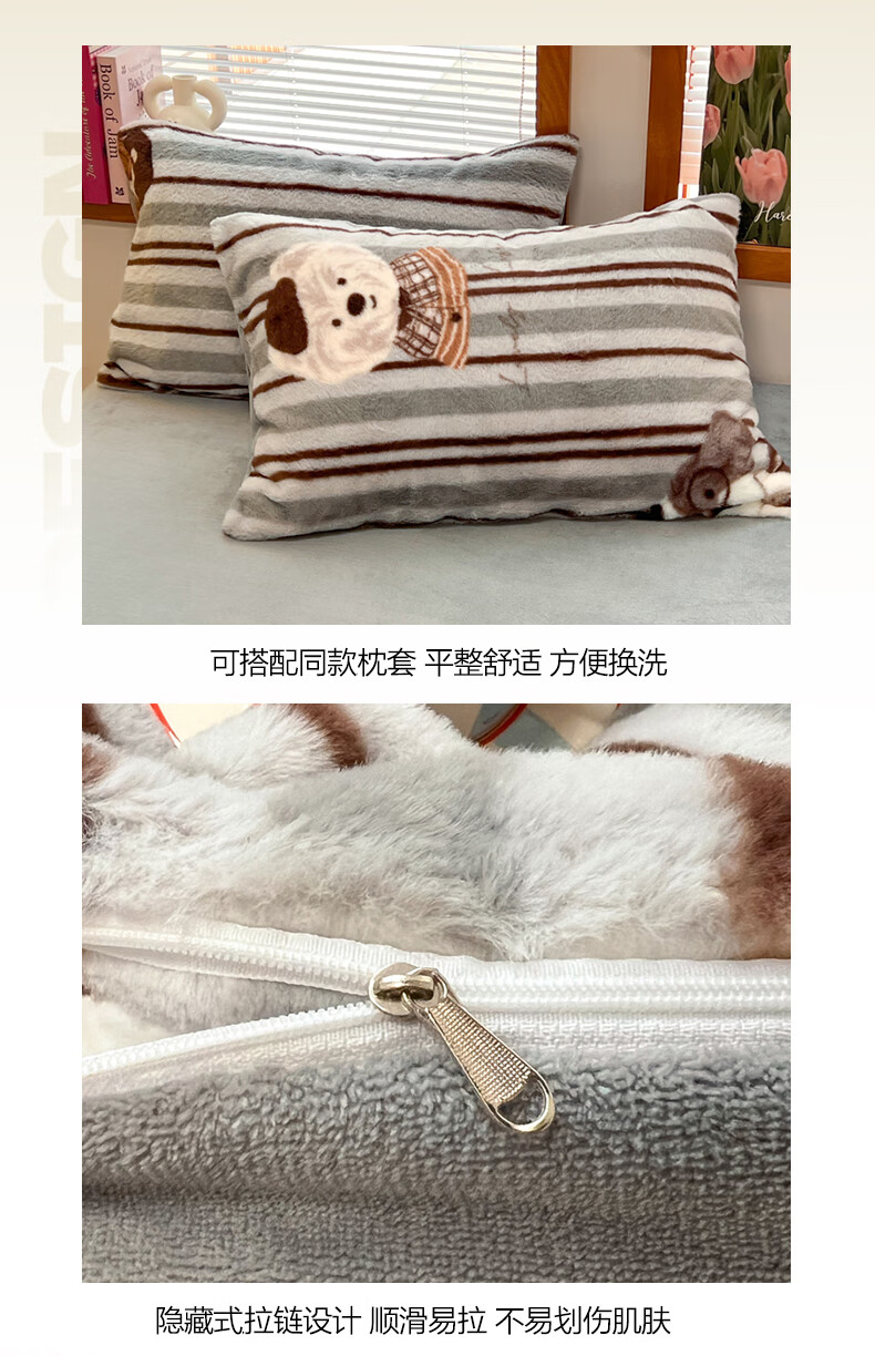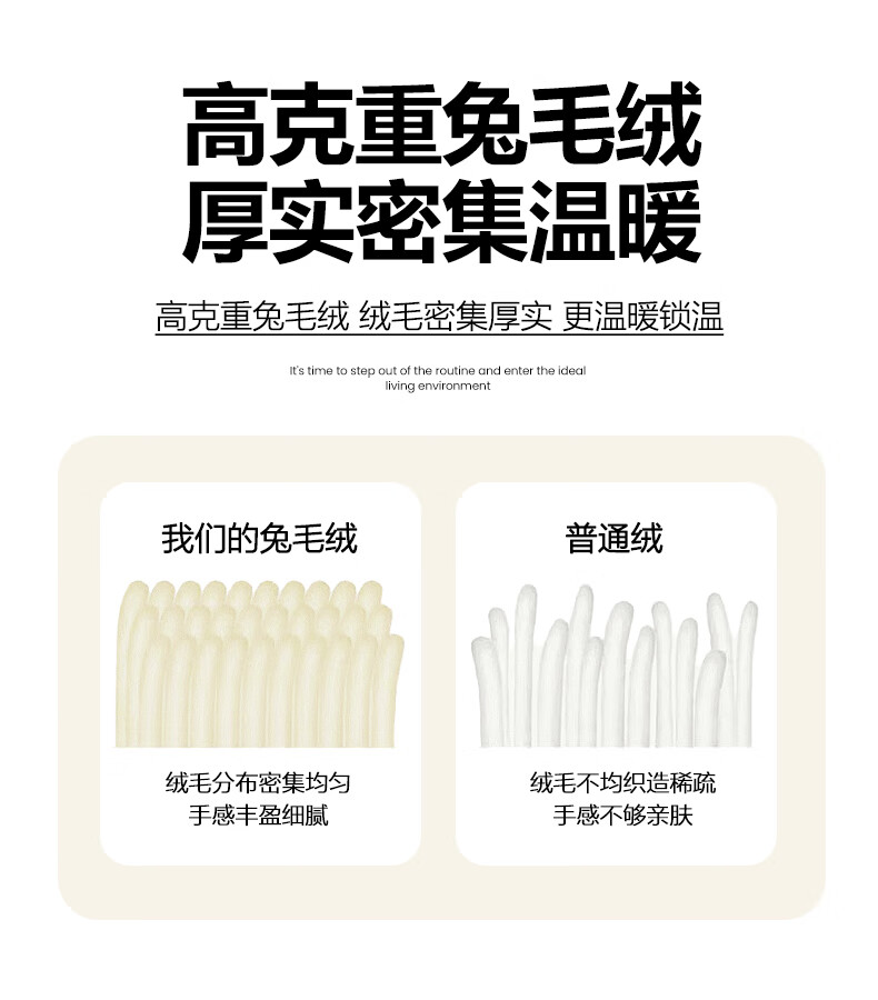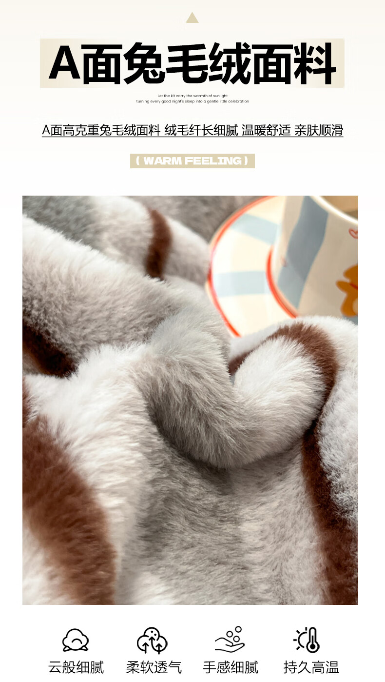 甄选A面高克重兔毛绒面料,绒毛纤长细腻,温暖舒适;B面亲肤牛奶绒面料,细腻柔软,温暖聚温不闷热;新一代活性印染工艺,健康安心,不易掉毛褪色