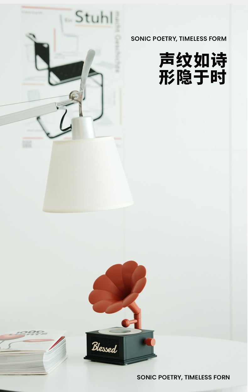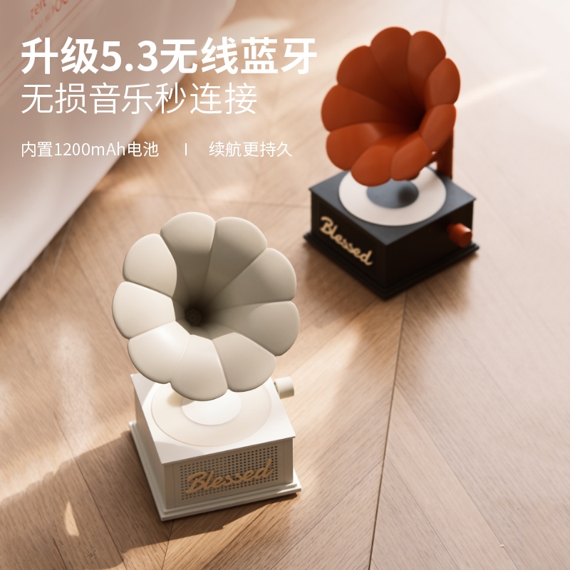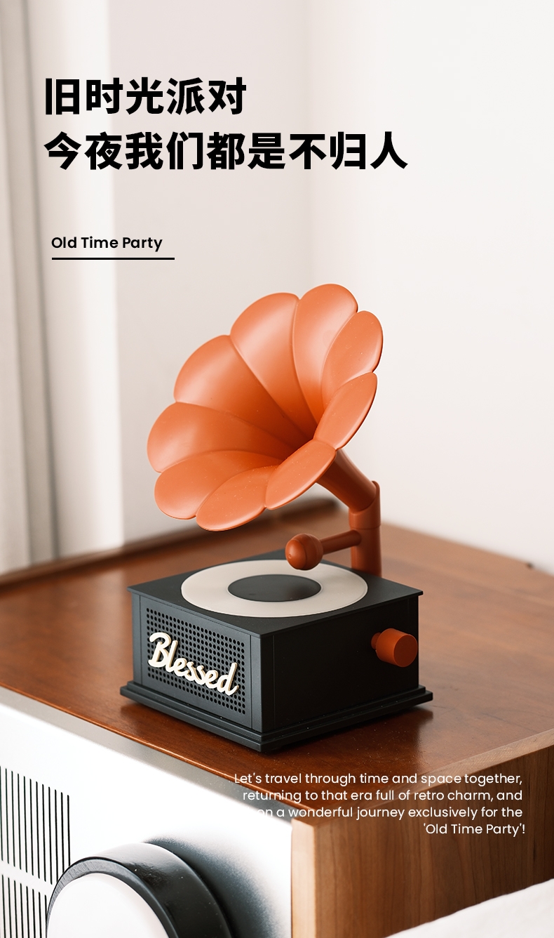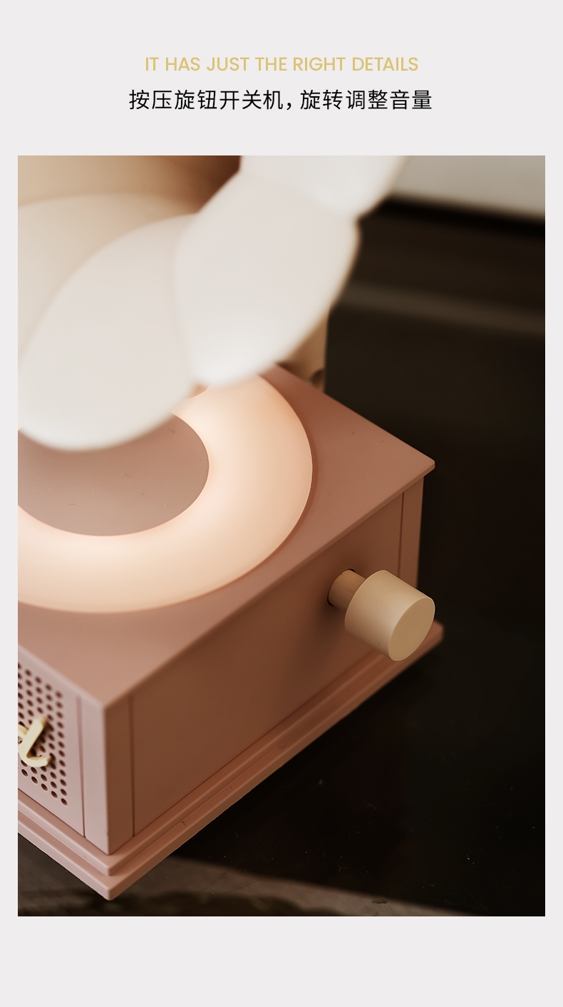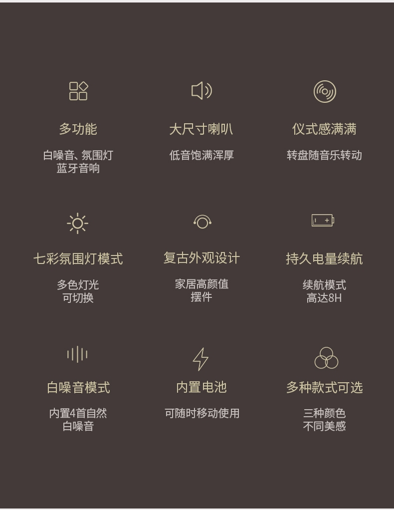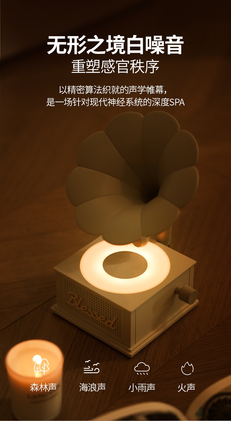 白噪音+氛围灯多功能蓝牙音响;转盘随音乐转动,仪式感满满;复古外观设置,高颜值摆件,送礼佳选