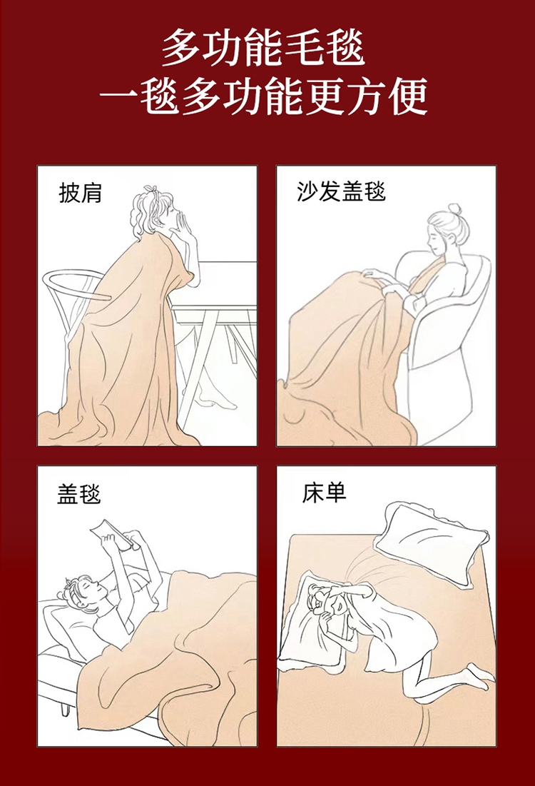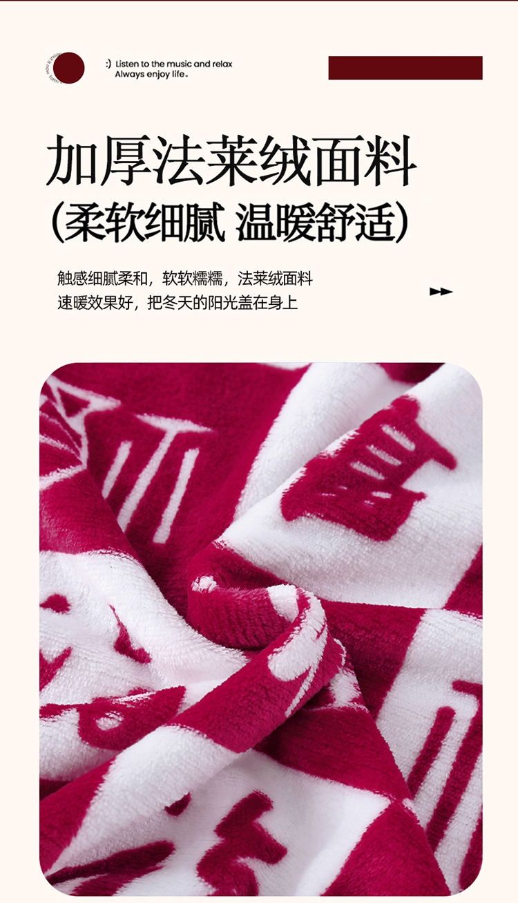 一毯多用,可做披肩毯,可做盖毯;法莱绒面料,绒毛丰盈密实,柔软舒适;精致印花,图案清晰,层次分明