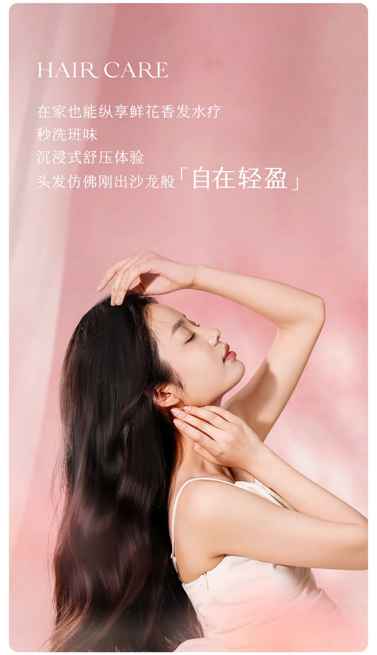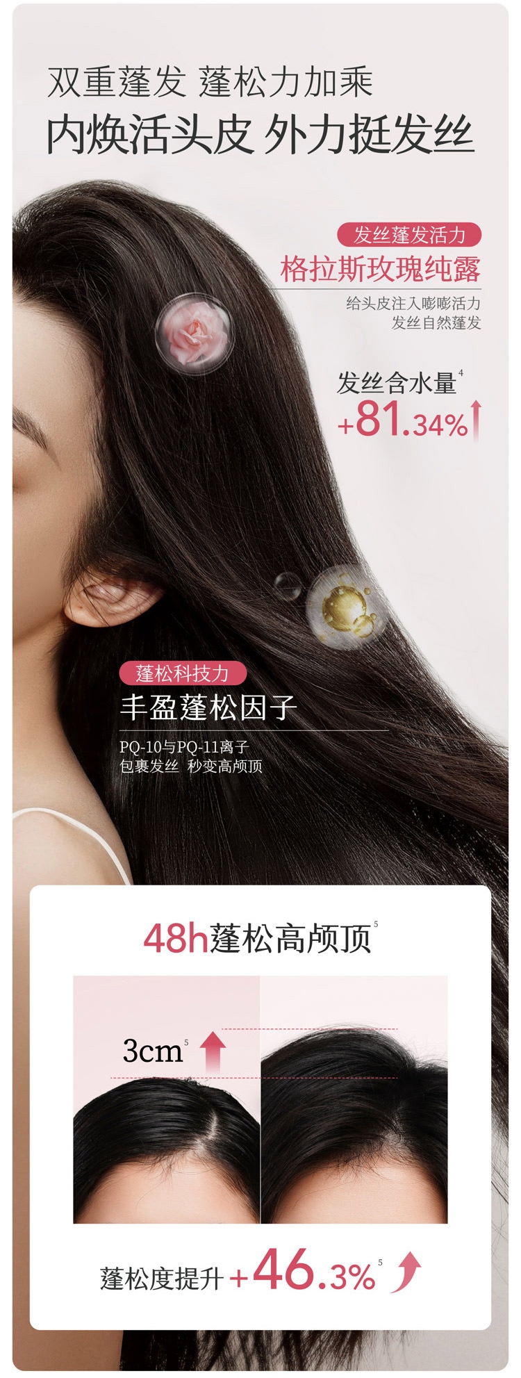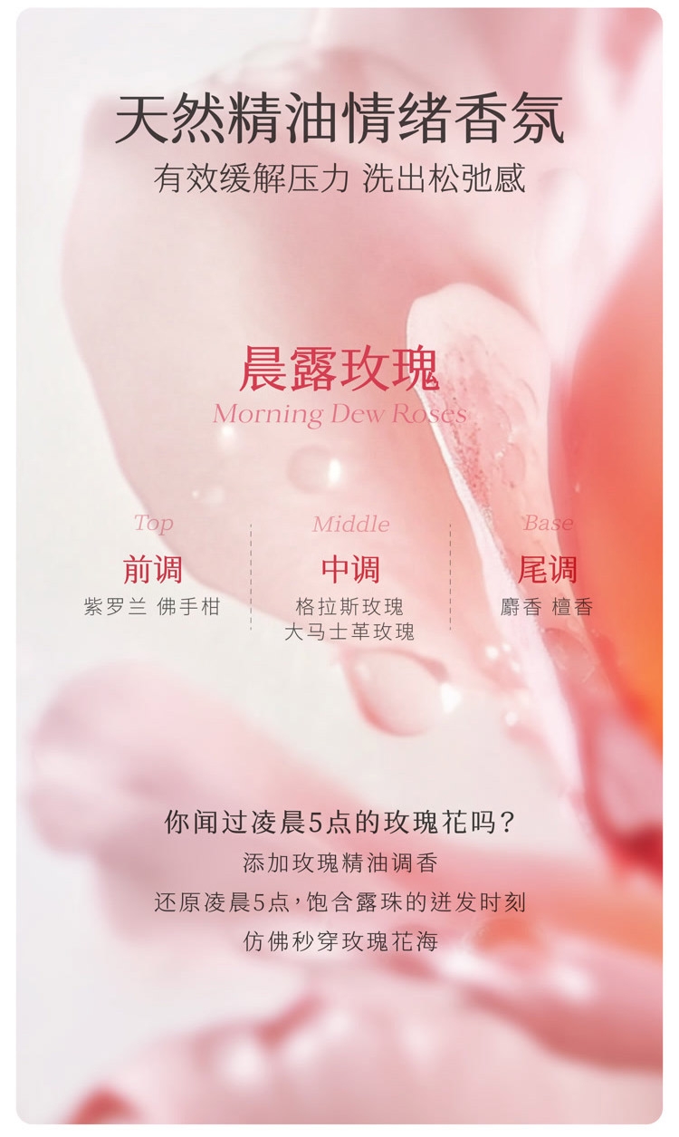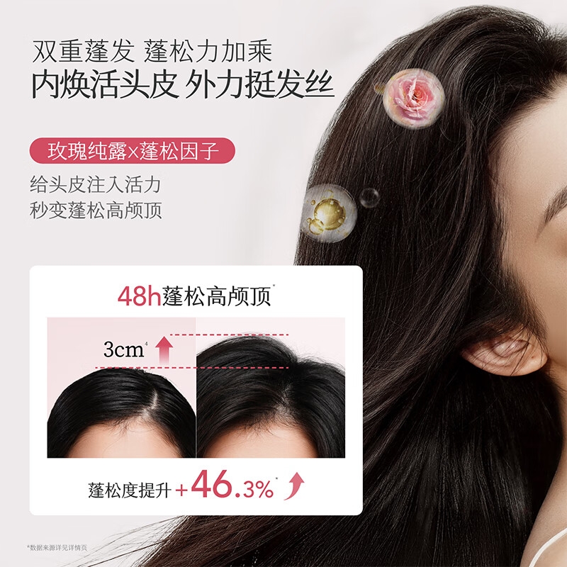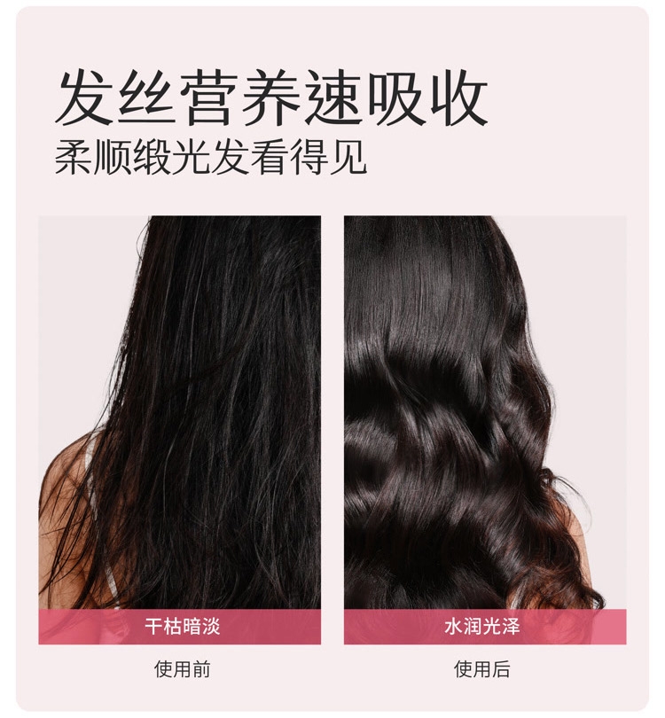 玫瑰纯露因子,焕发头皮生命力,发丝蓬发活力;玫瑰香氛清新持久,干枯发质和频繁染烫人群的护发必备;轻盈水润科技 发丝弹性有光泽