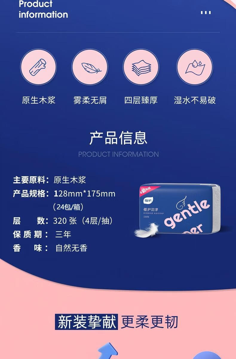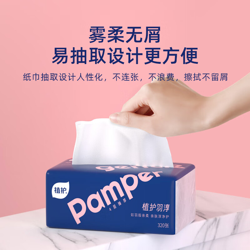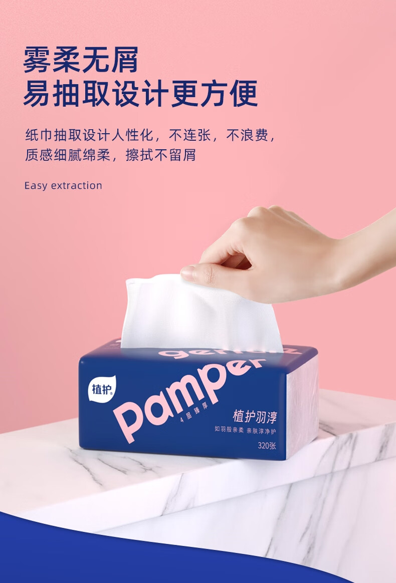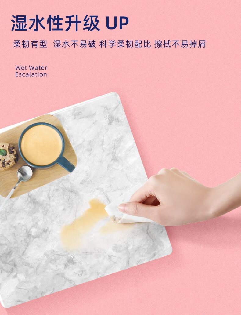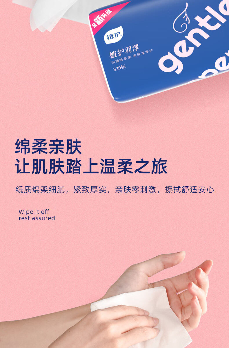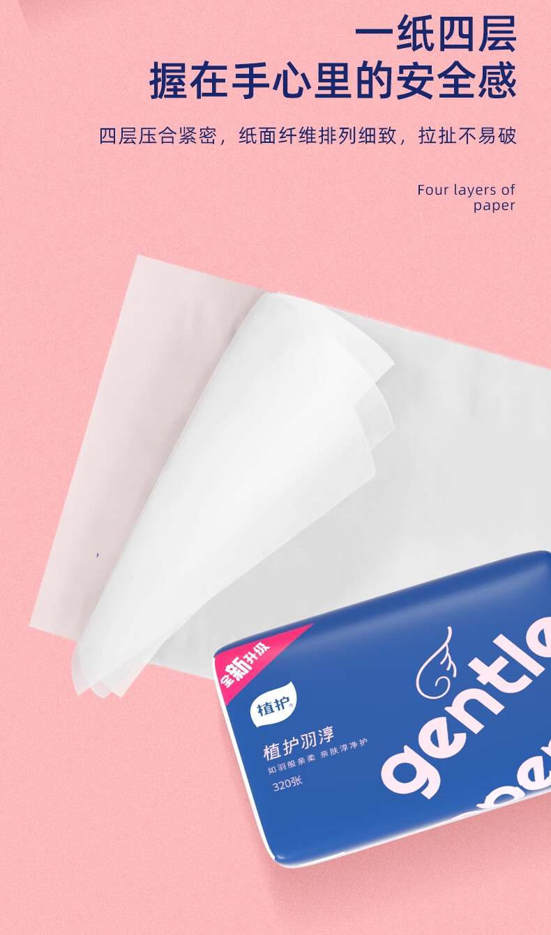 精选原生木浆,柔韧性更好;纸质绵柔细腻,擦拭不留屑,亲肤零刺激;四层压合紧密,纤维排列细致,拉扯不易破