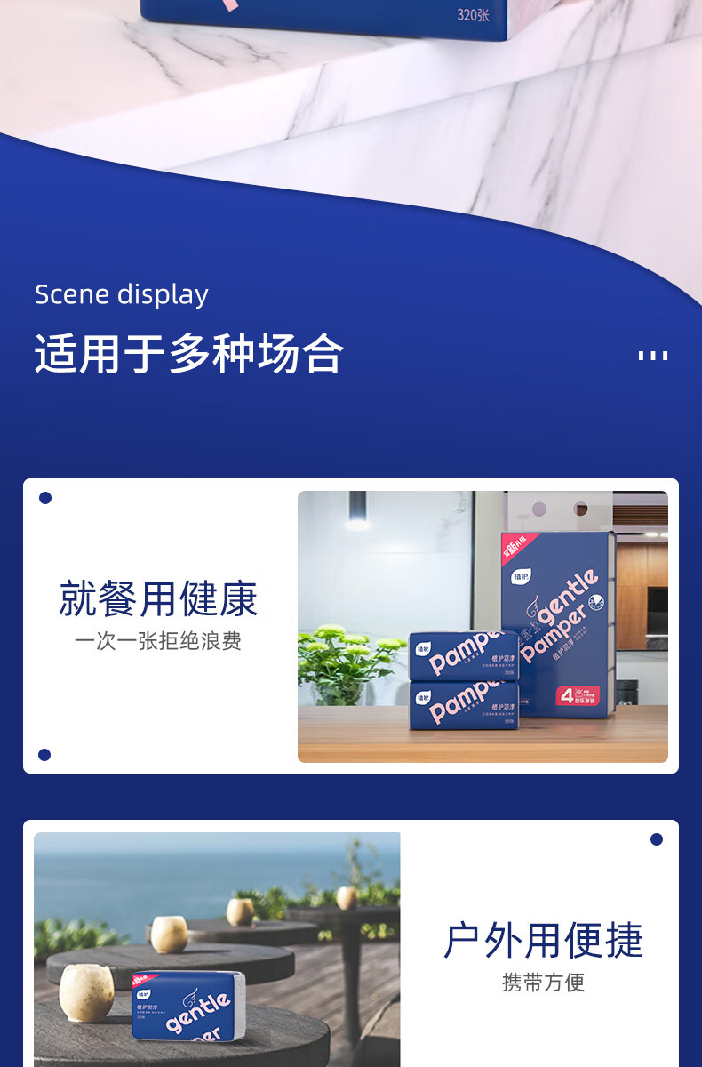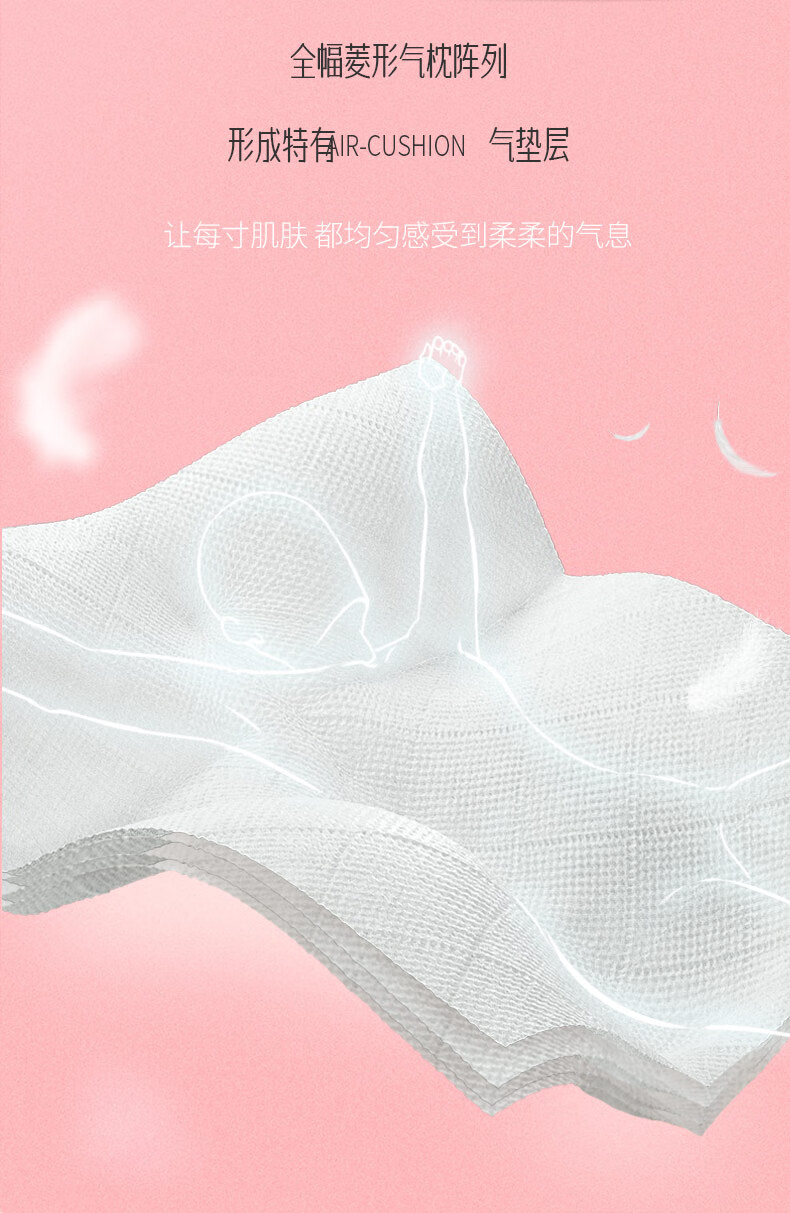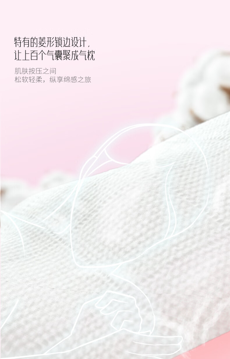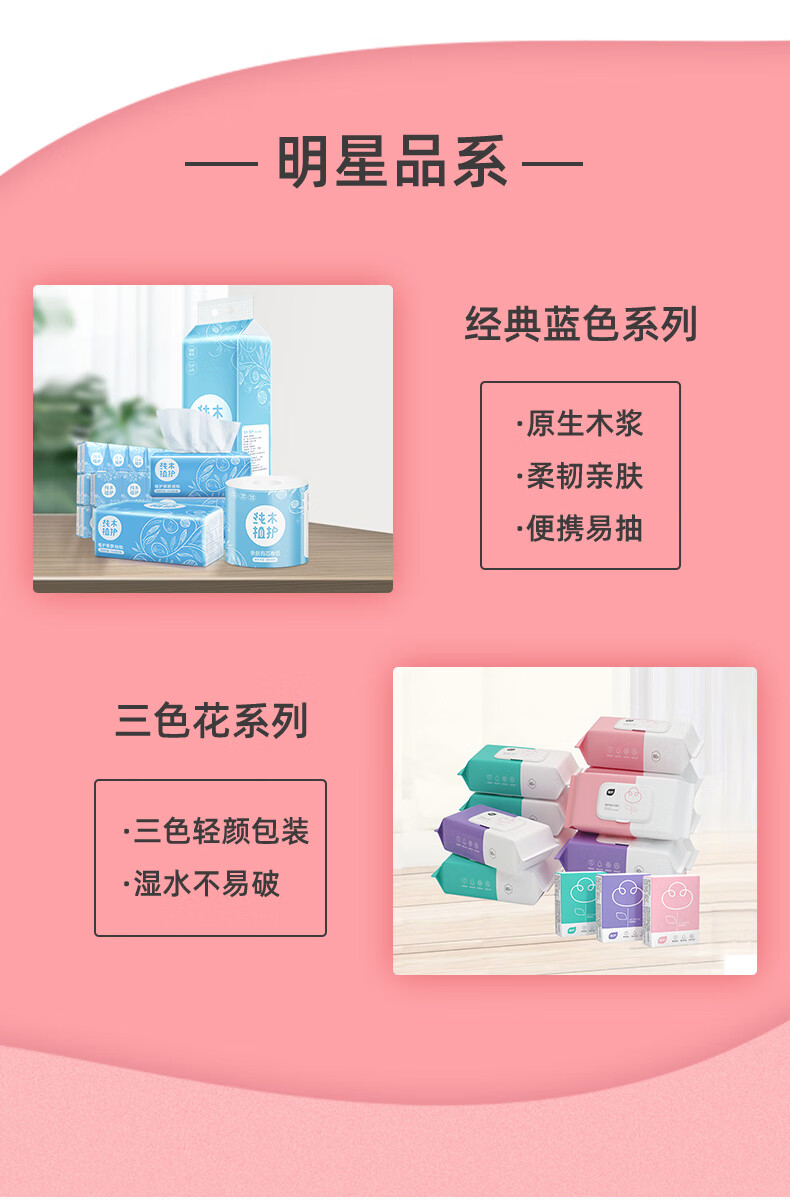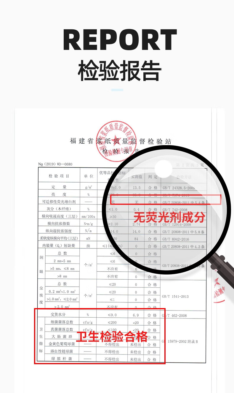 精选原生木浆,柔韧性更好;纸质绵柔细腻,擦拭不留屑,亲肤零刺激;四层压合紧密,纤维排列细致,拉扯不易破