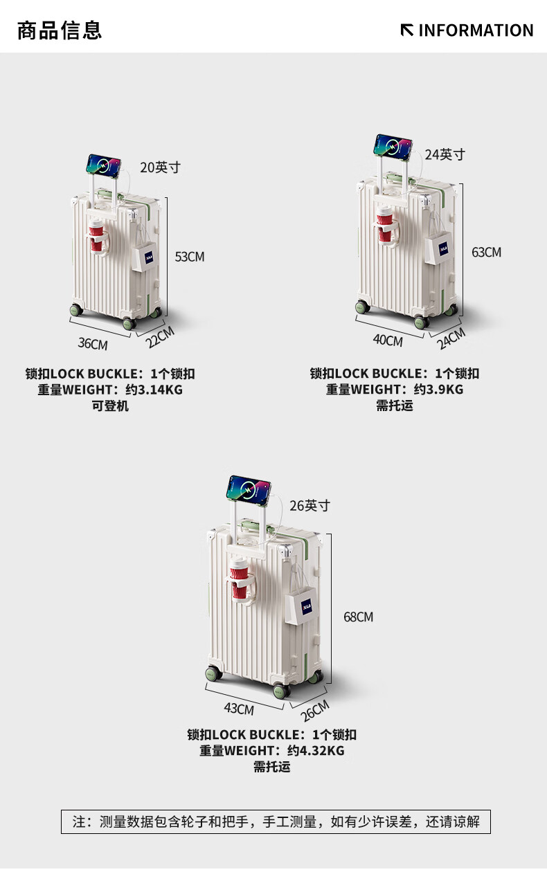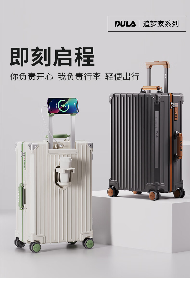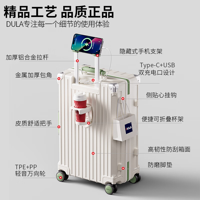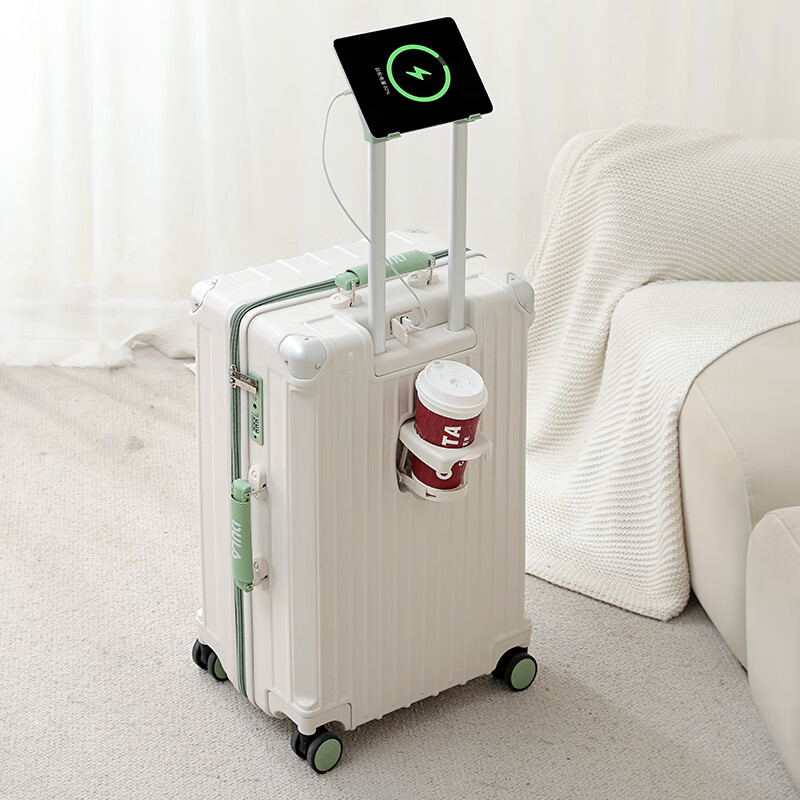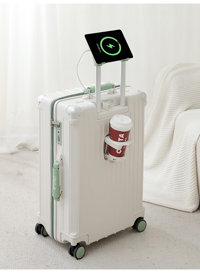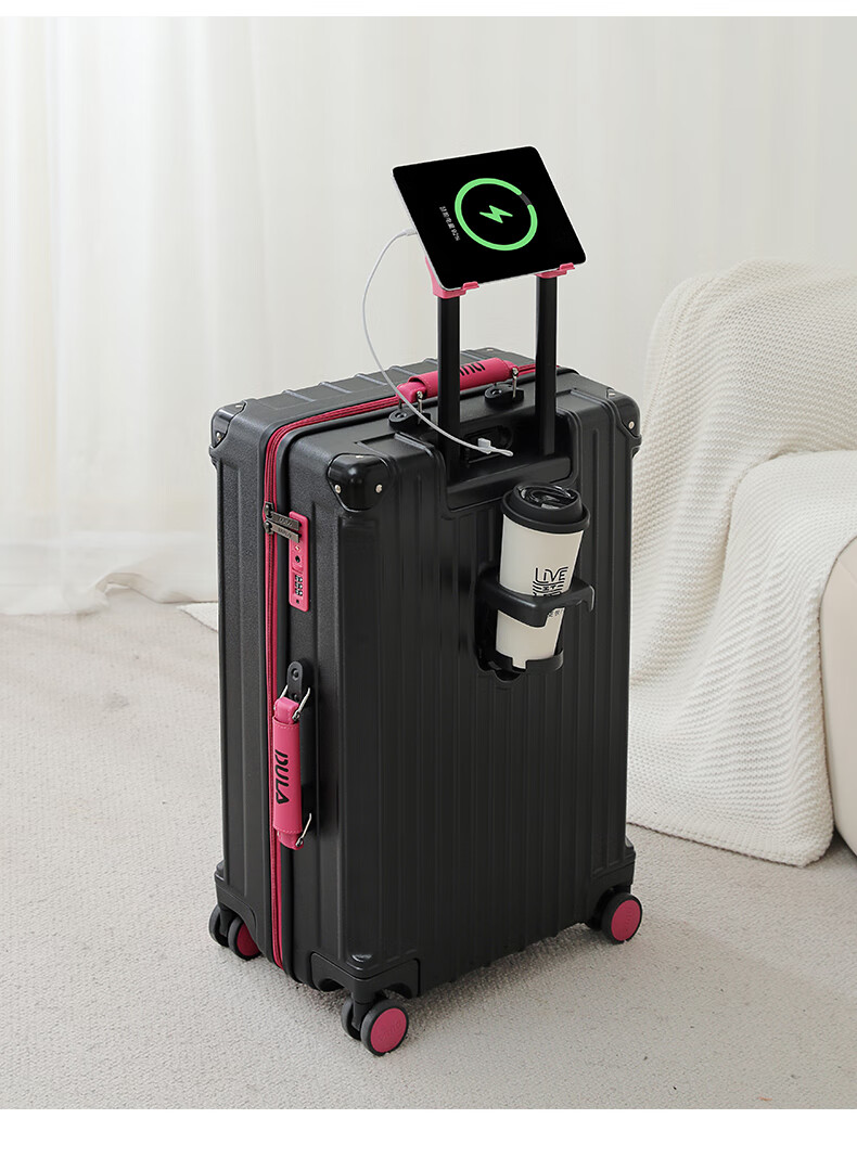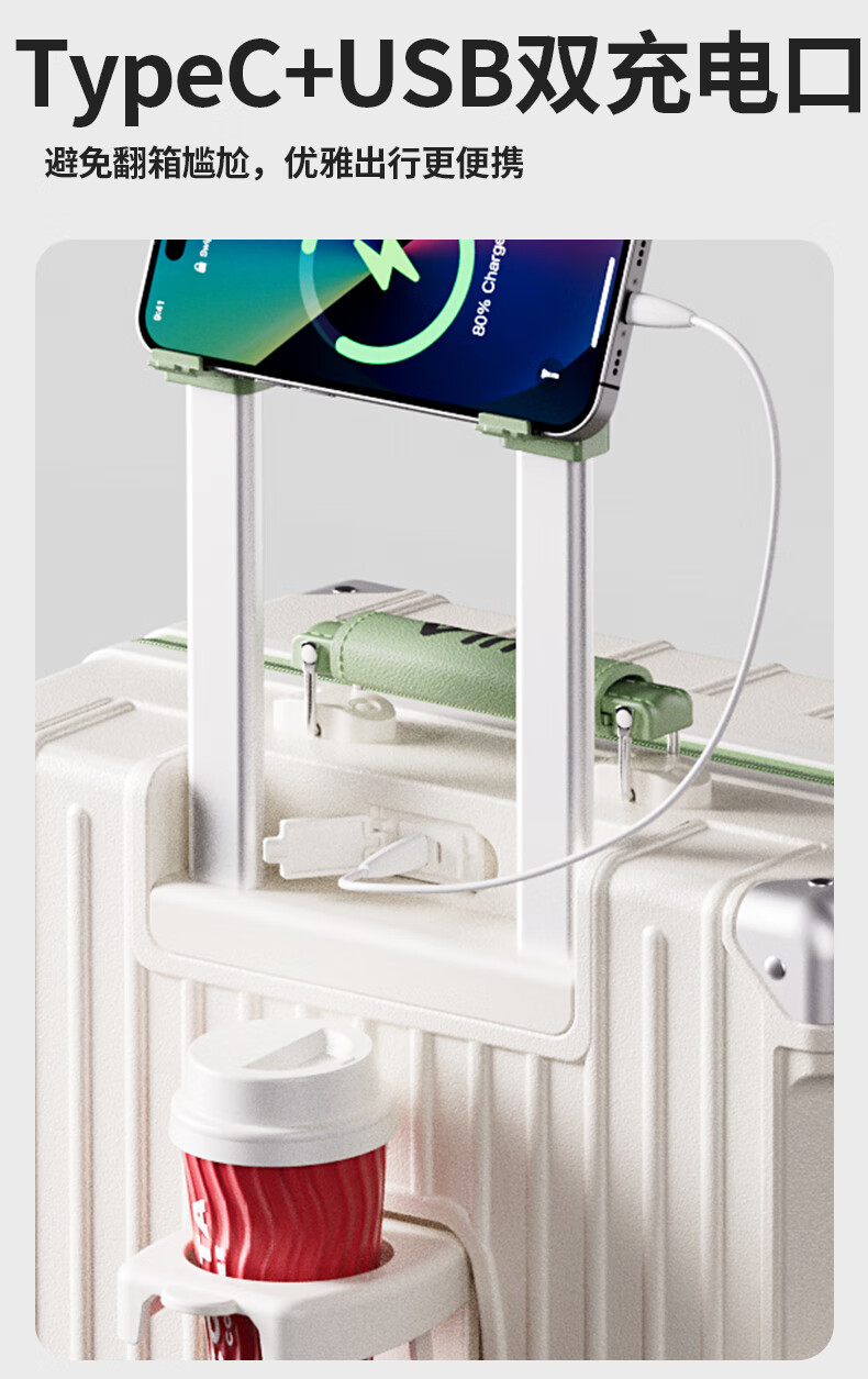 隐藏式手机支架,TypeC+USB双充电口;采用高含PC三层复合板材,韧性强抗压好;TPE+PP轻音万向轮+加厚铝合金拉杆
