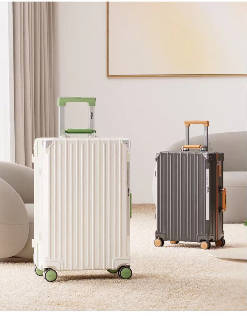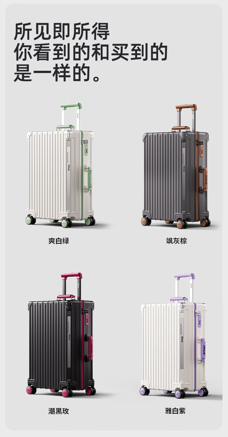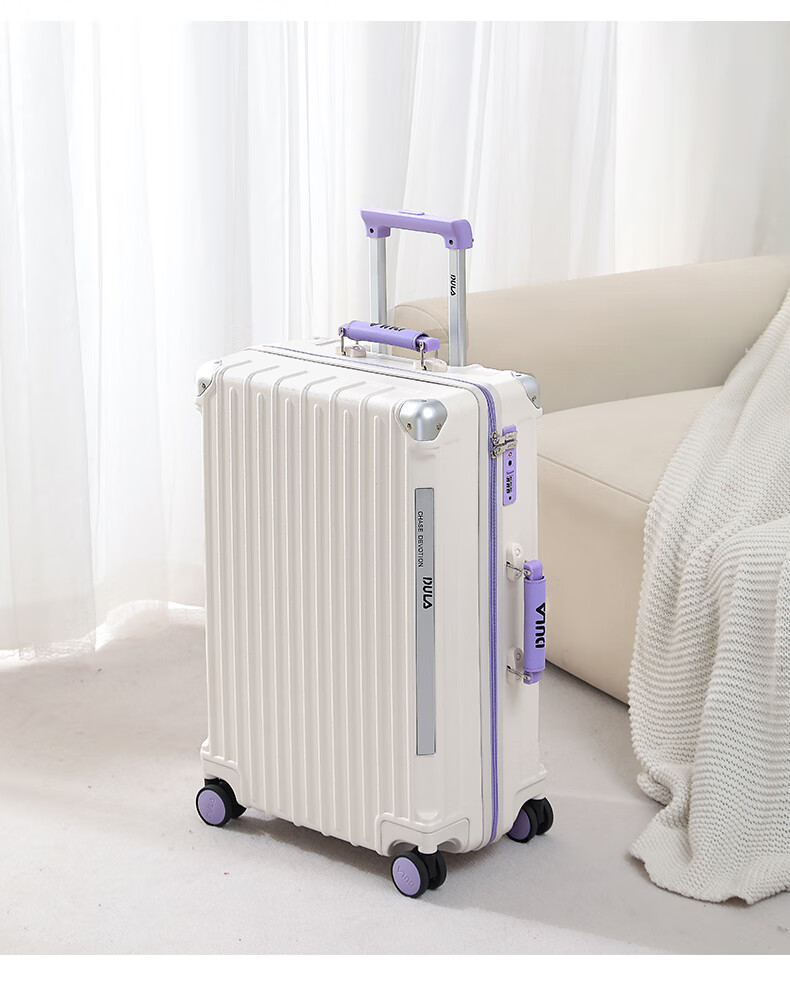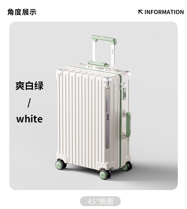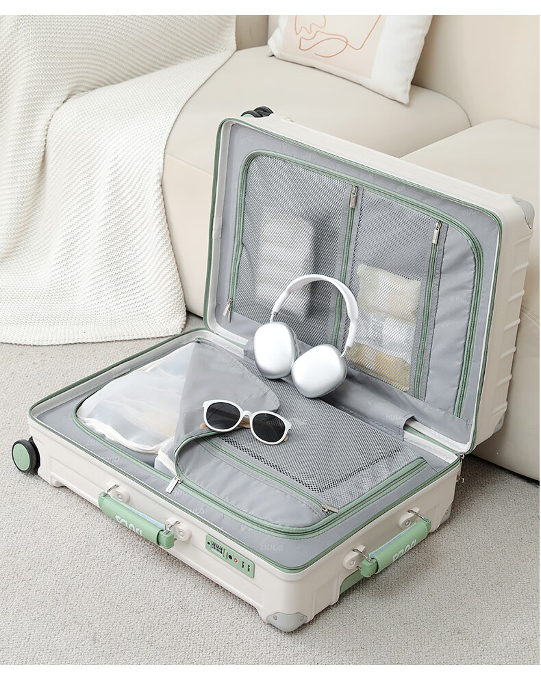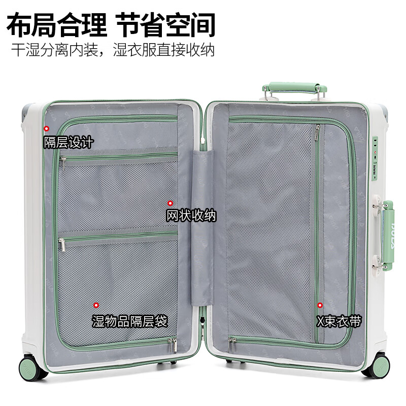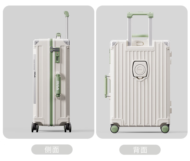 隐藏式手机支架,TypeC+USB双充电口;采用高含PC三层复合板材,韧性强抗压好;TPE+PP轻音万向轮+加厚铝合金拉杆