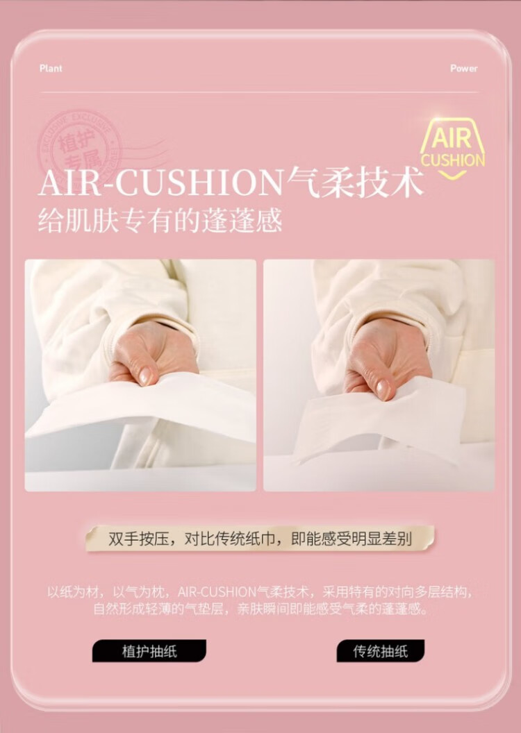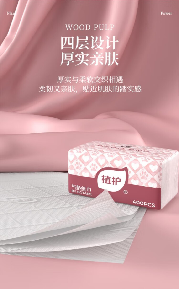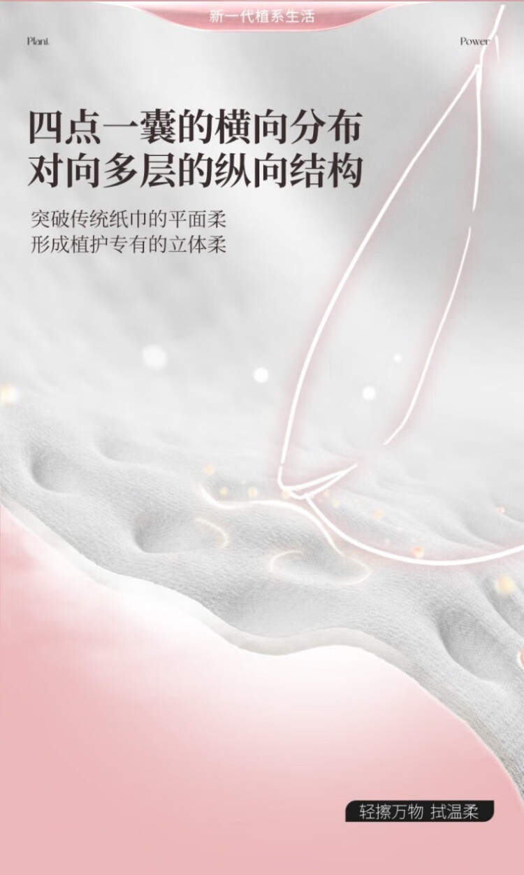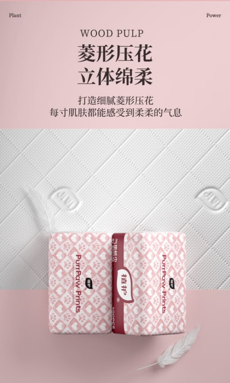 原生木浆 进口品质;轻盈压花 臻享品质;柔软触感 亲如肌肤