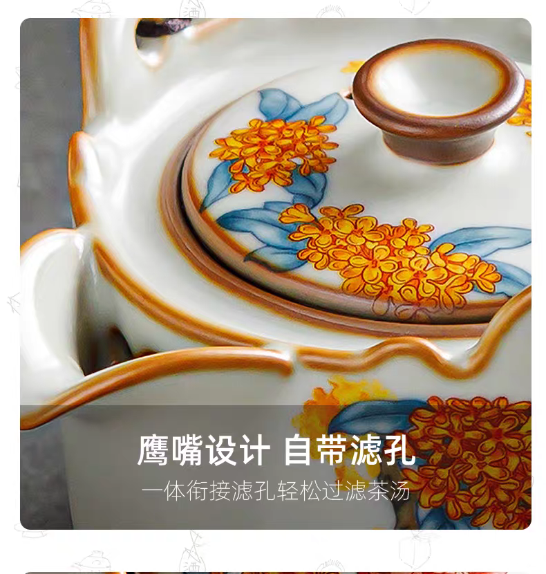 开门红喜庆礼品,金鲤桂花,寓意金贵,连年有鱼;杯内外皆有画面。亚黄汝瓷,玛瑙入釉,蝉翼开片。;采用高价优质瓷土,紫口铁足,瓷质高档。立体浮雕杯身