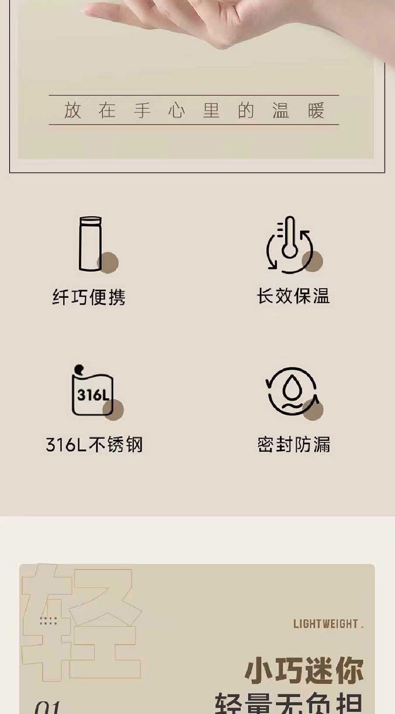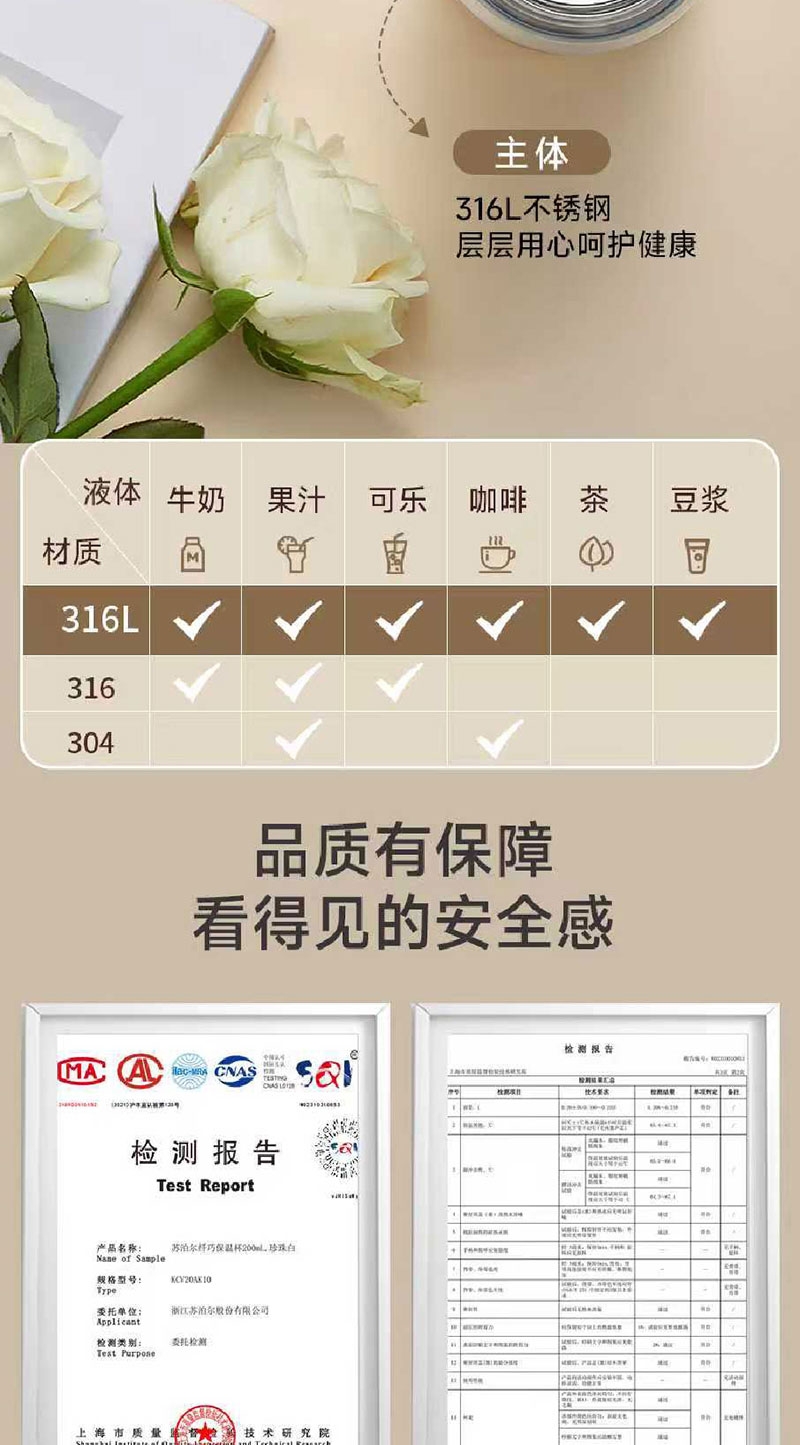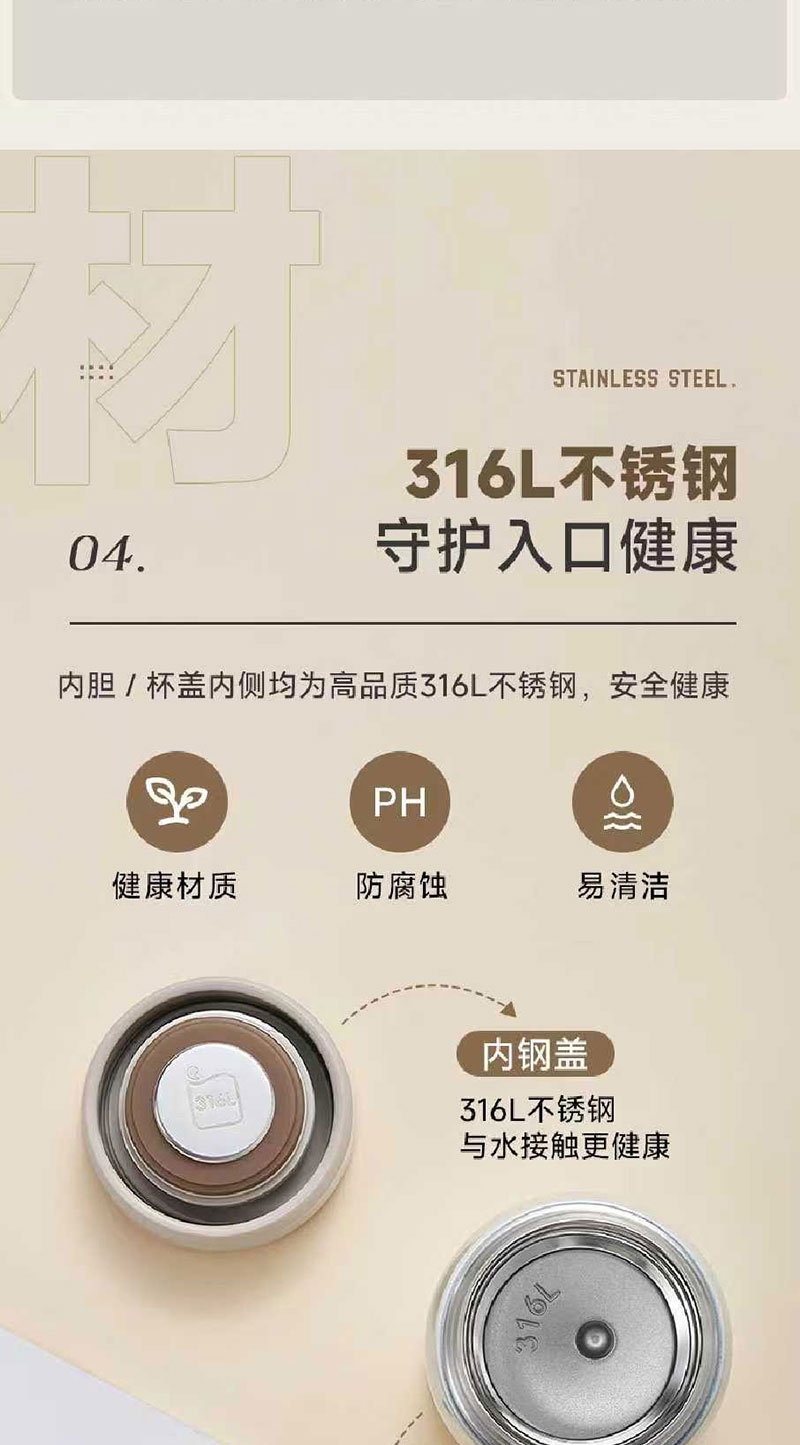 316L不锈钢,耐磨耐用耐腐蚀;双层真空,隔绝温度流失;长效保温,保温保冷 密封设计,倒置不漏