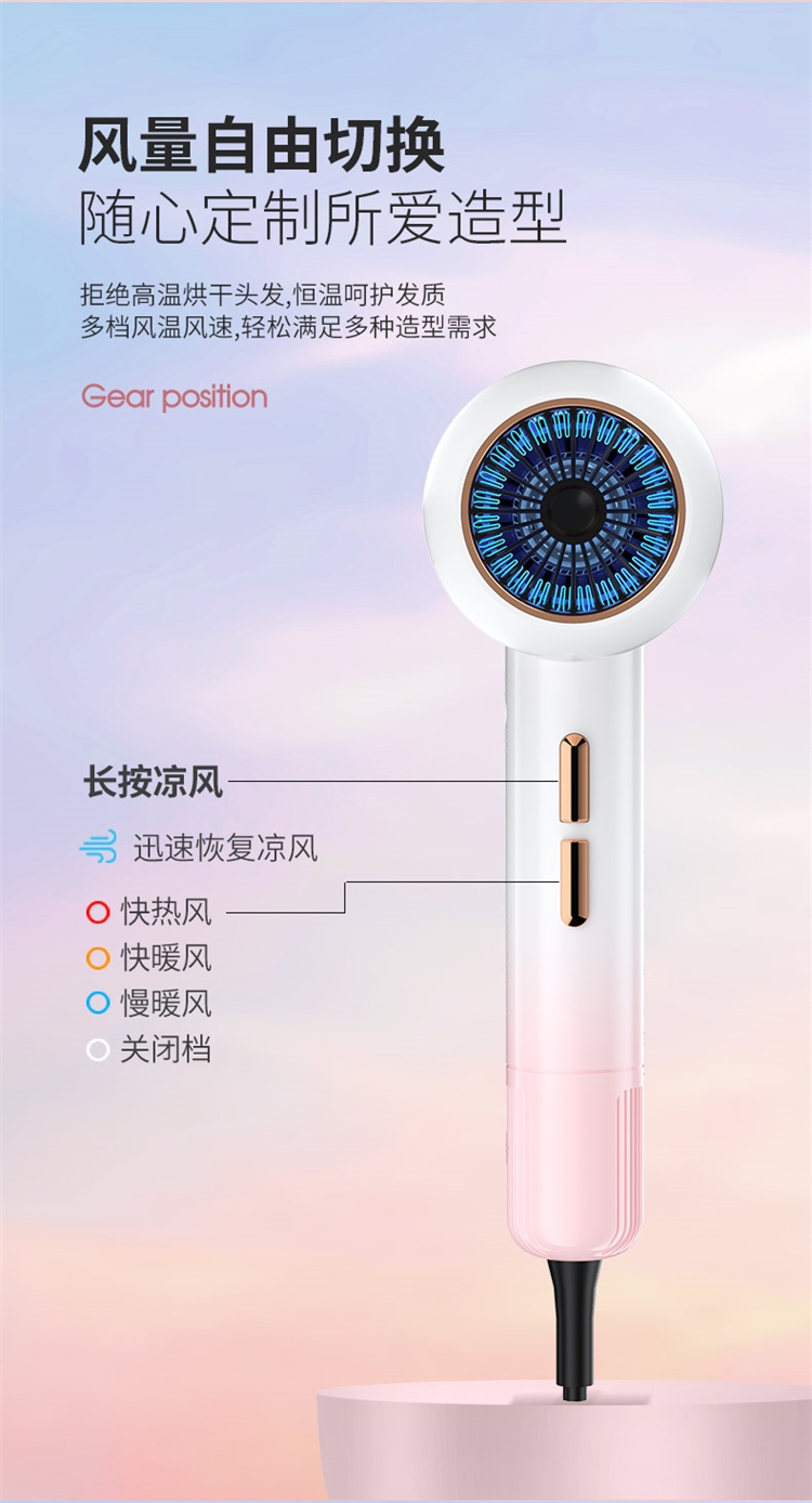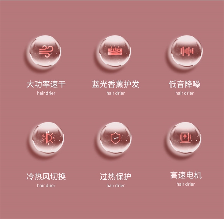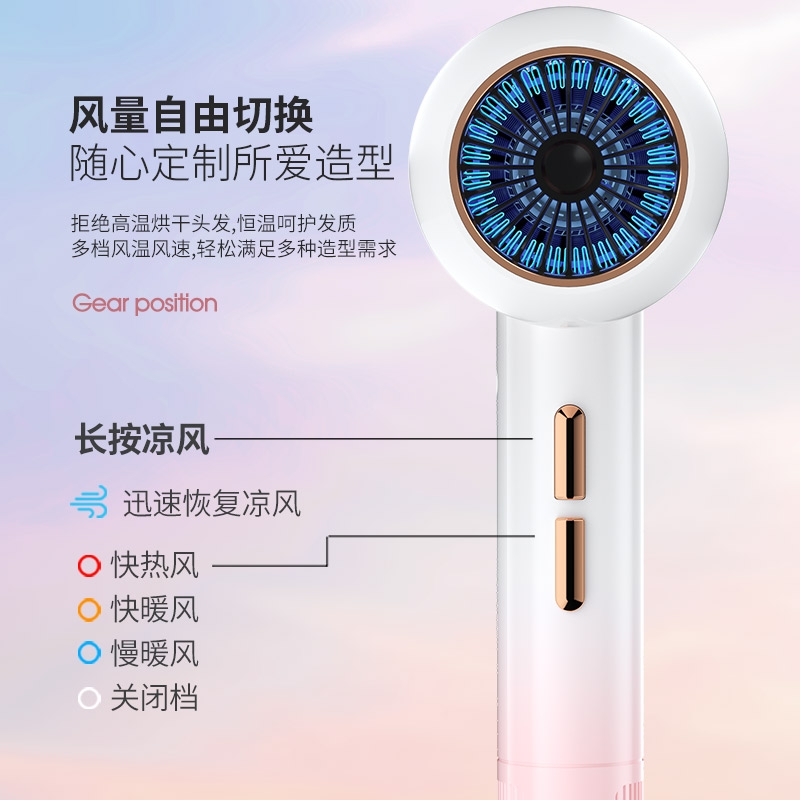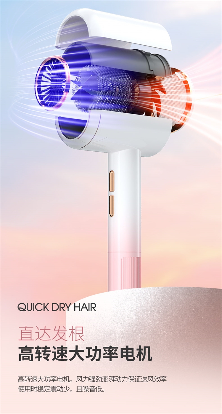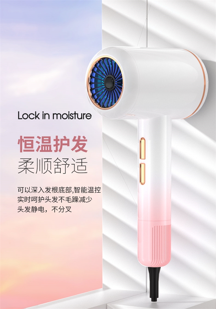 高转速大功率电机,风力强劲澎湃动力保证送风效率;使用时稳定震动少,且嗓音低。;恒温护发柔顺舒适