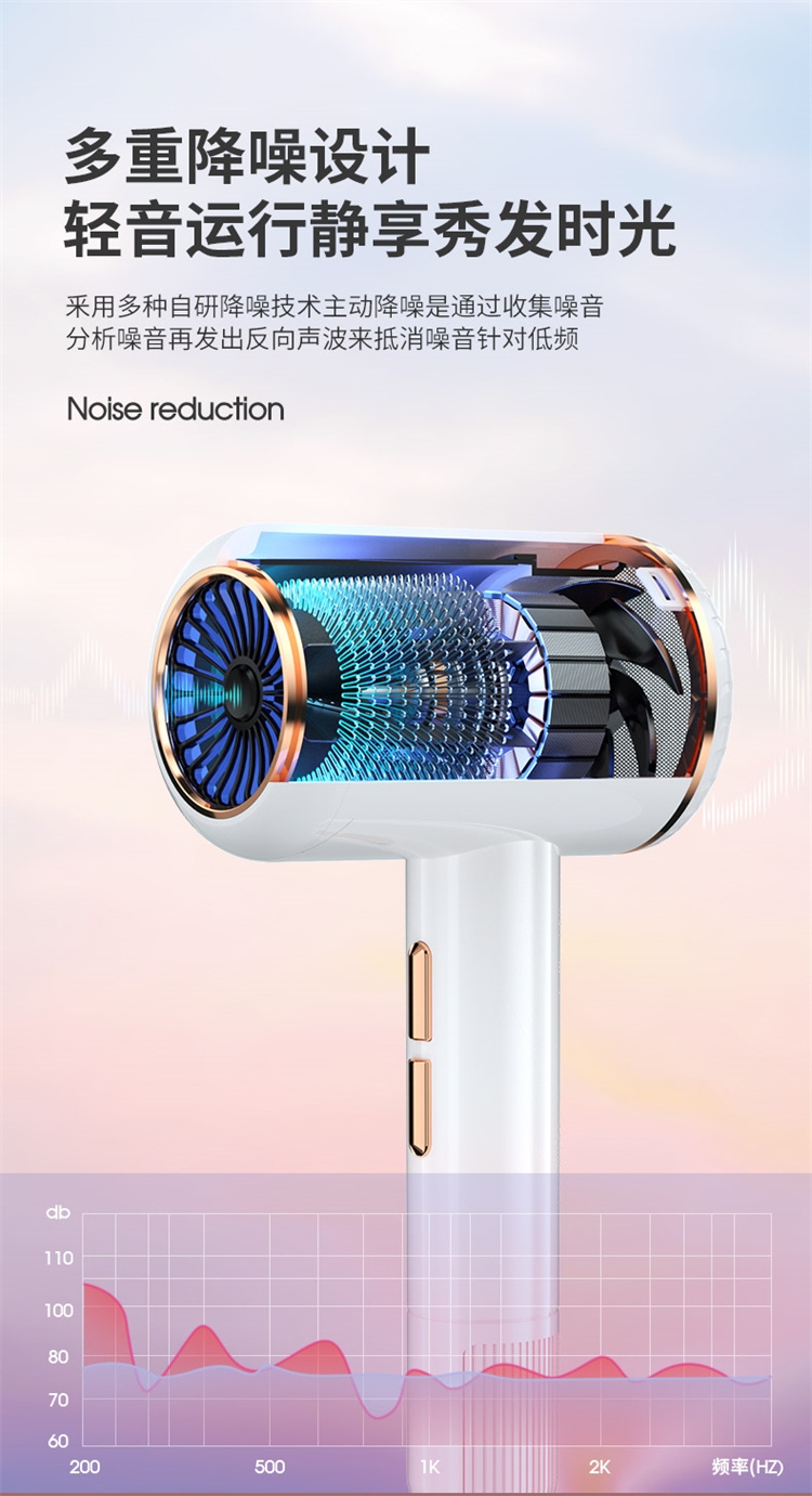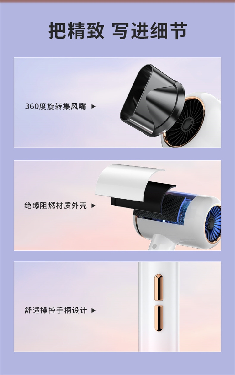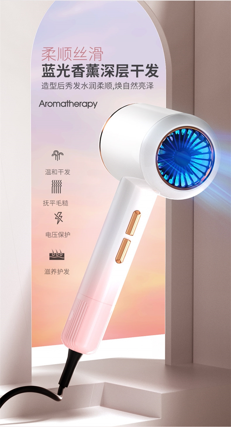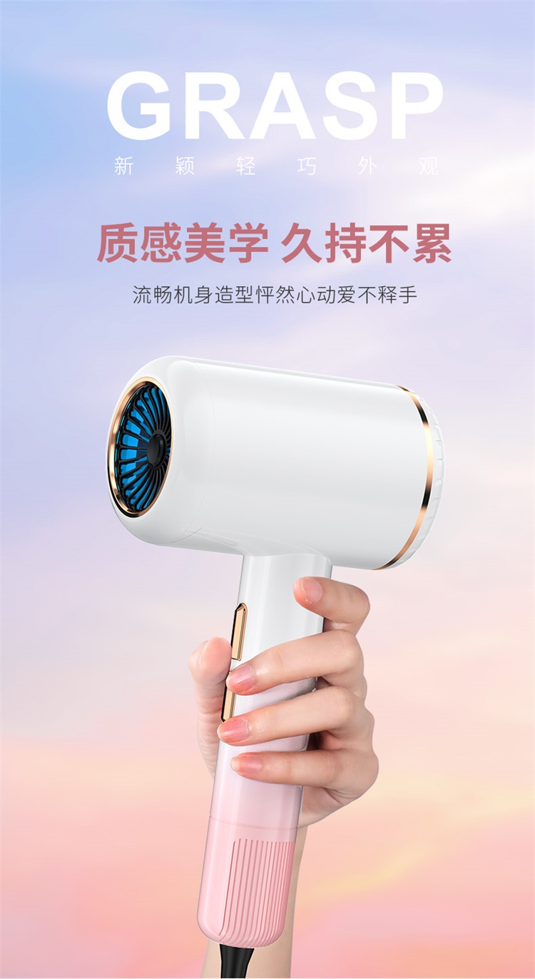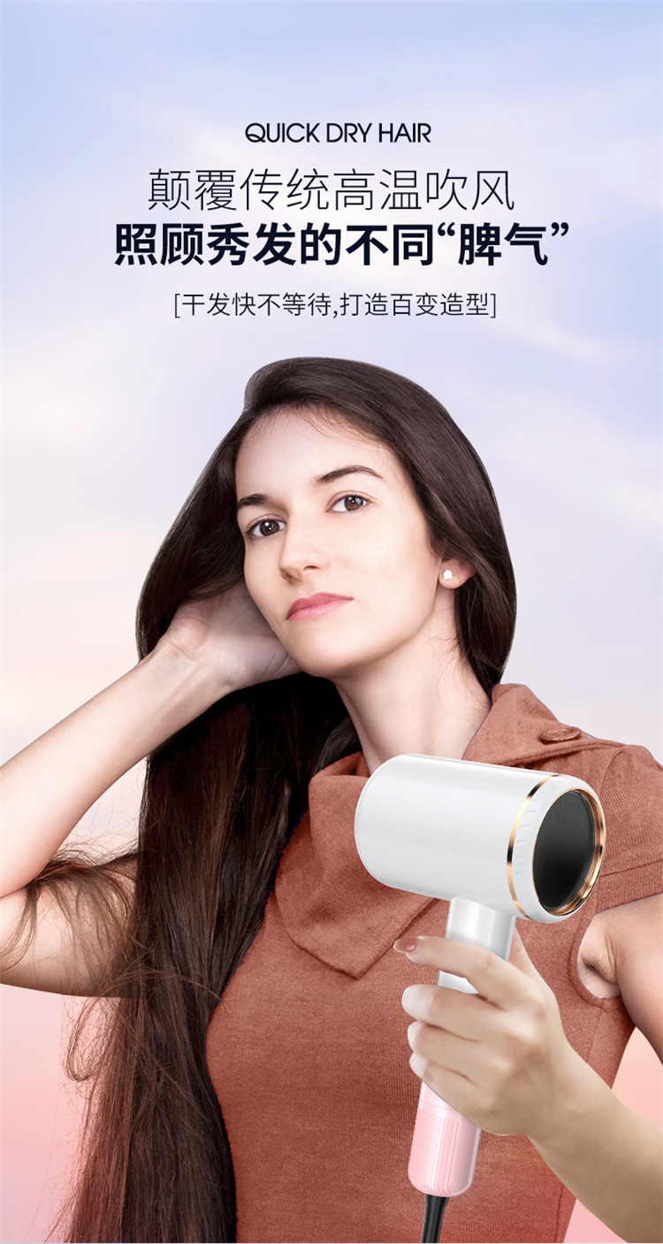 高转速大功率电机,风力强劲澎湃动力保证送风效率;使用时稳定震动少,且嗓音低。;恒温护发柔顺舒适