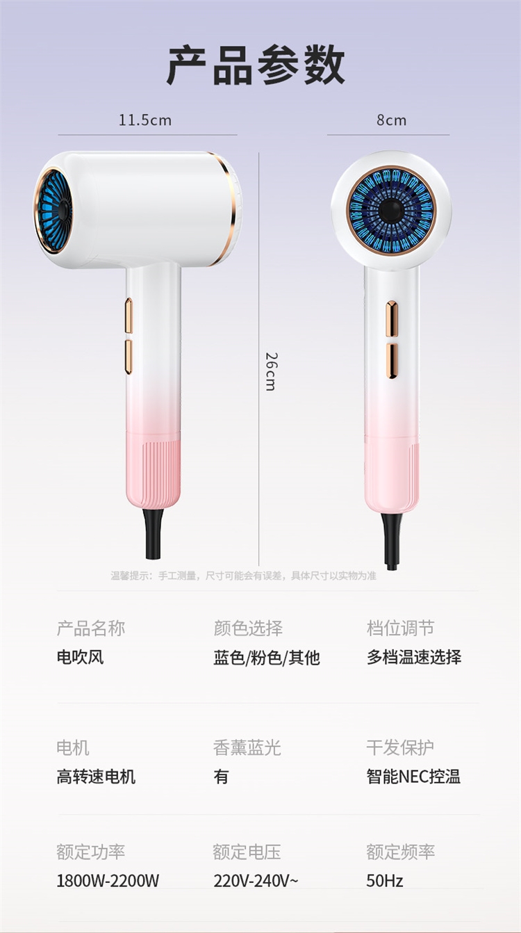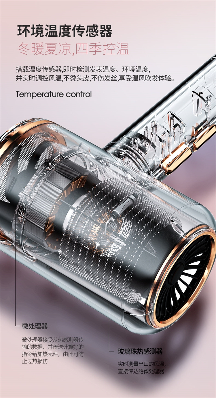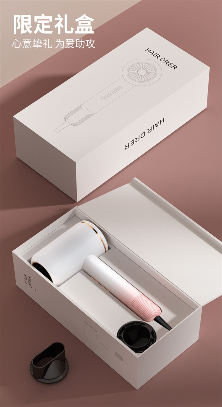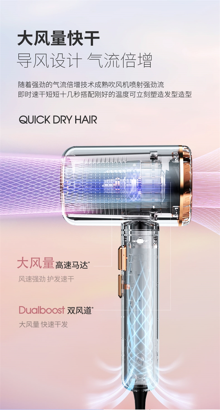 高转速大功率电机,风力强劲澎湃动力保证送风效率;使用时稳定震动少,且嗓音低。;恒温护发柔顺舒适