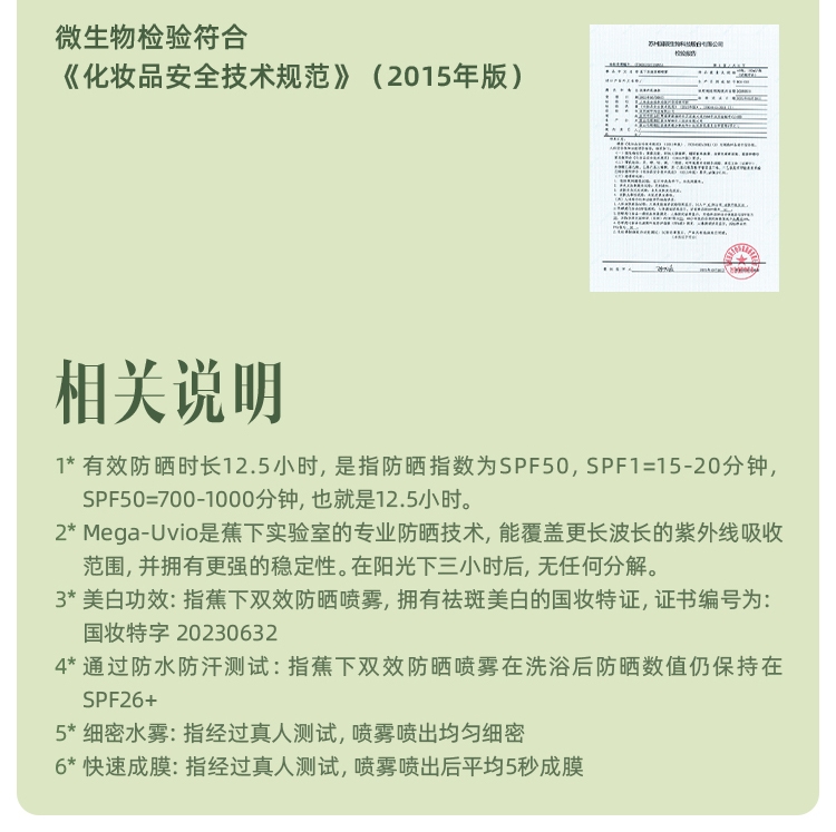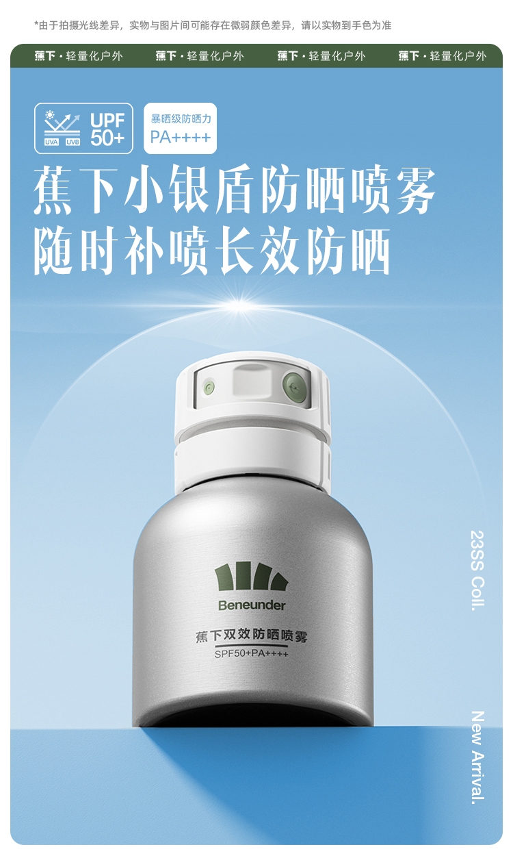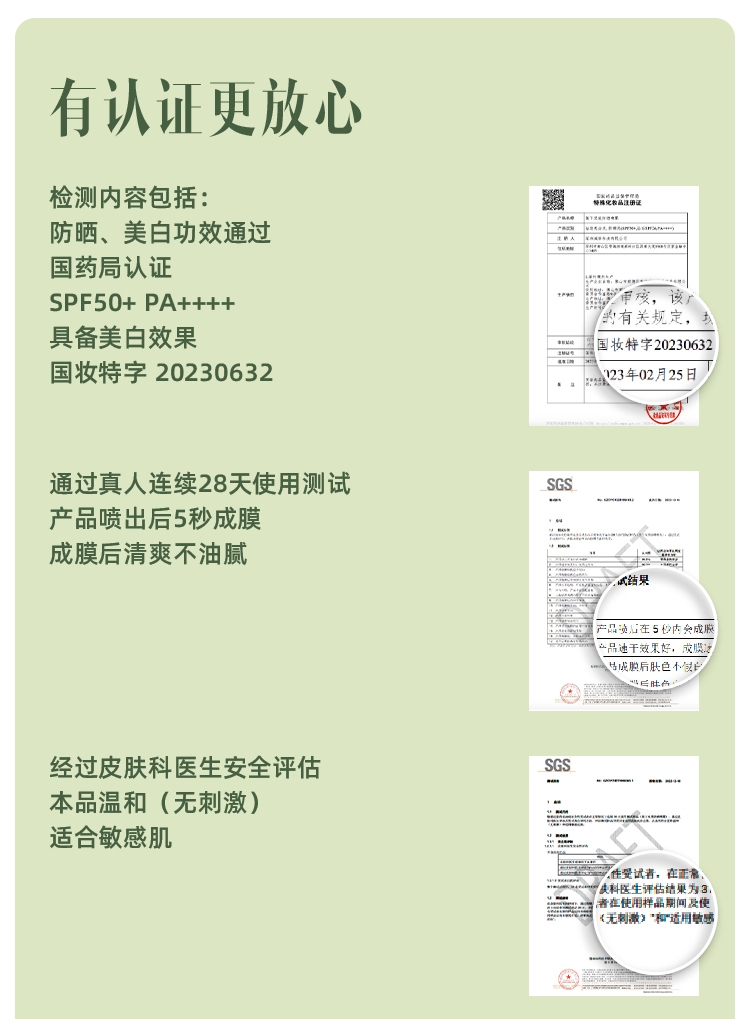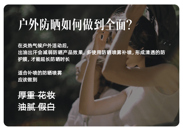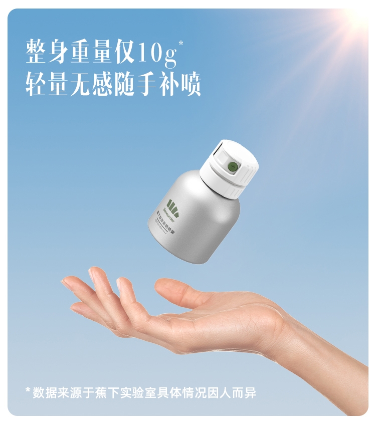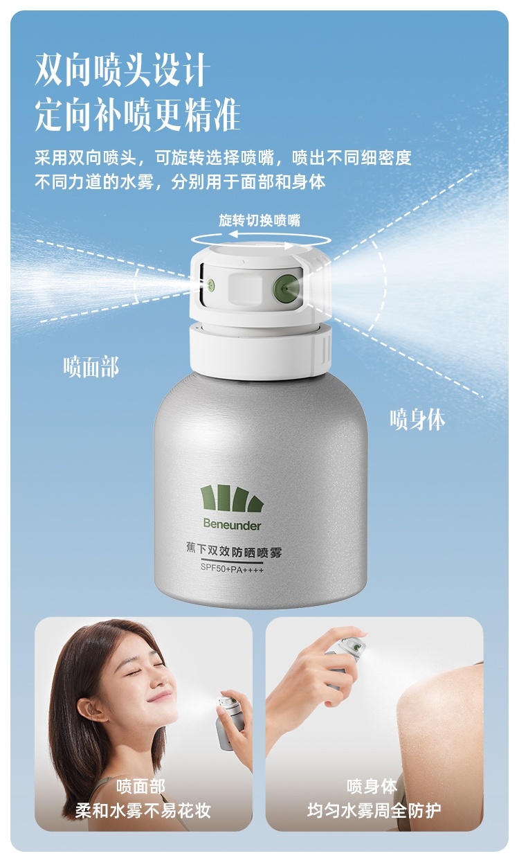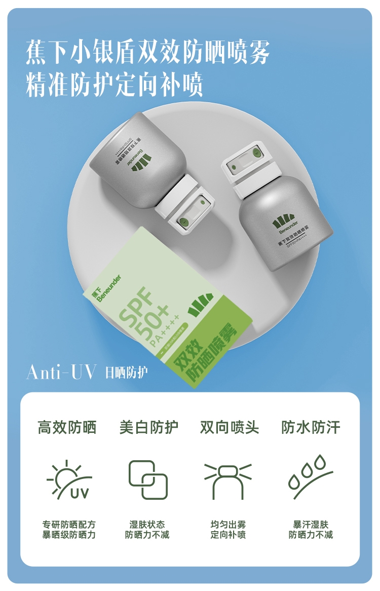 小银盾防晒喷雾随时补喷高效防晒;12h长效防晒力自带2种喷头补喷更精准;5秒均匀成膜清爽不花妆添加3%烟酰胺
