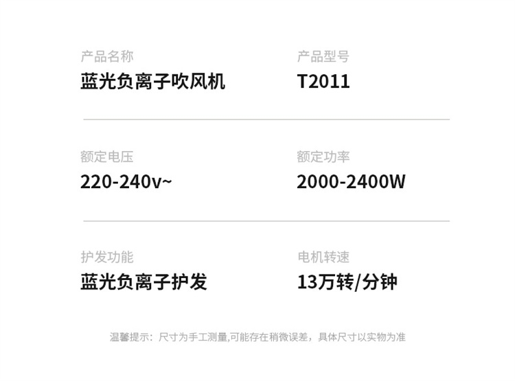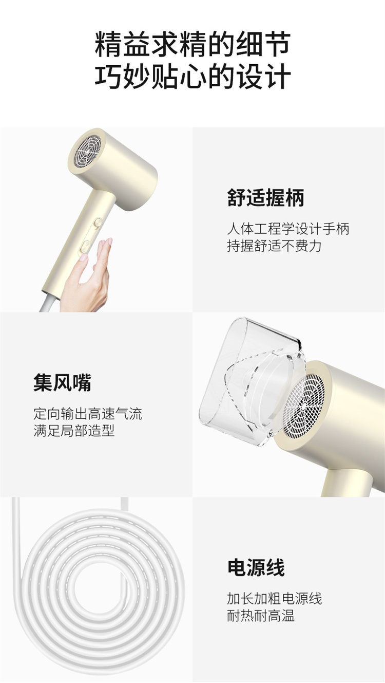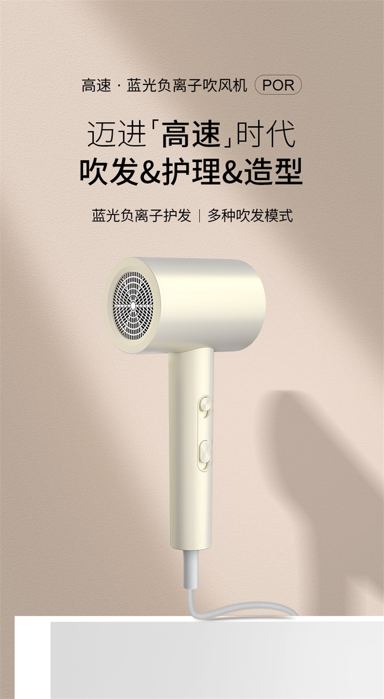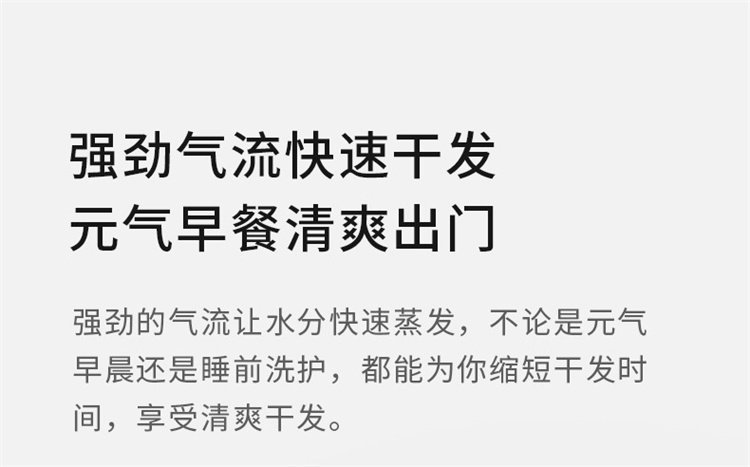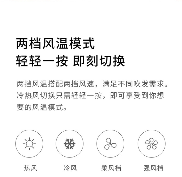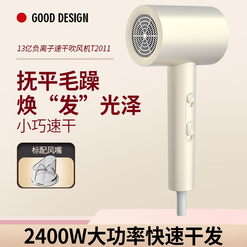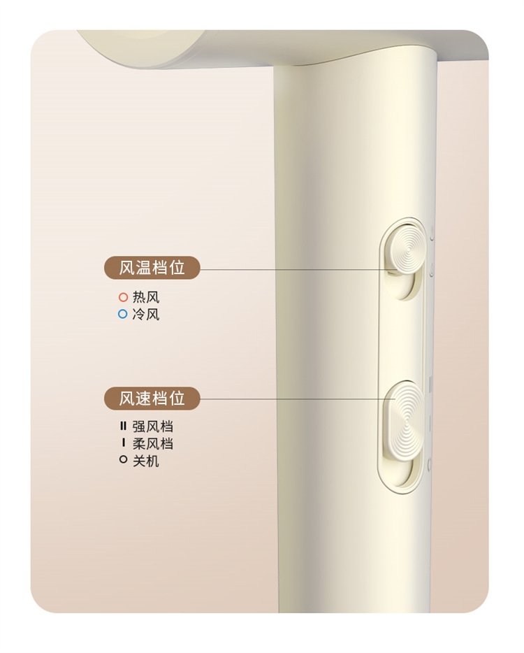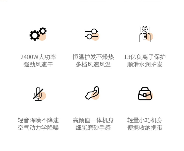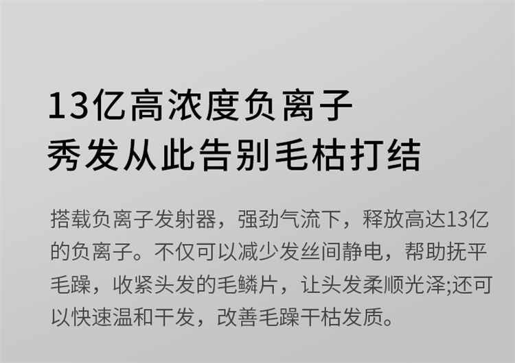 2400W大功率强劲风速干;强劲风速干多档风速风温;13亿负离子保护顺滑水润护发