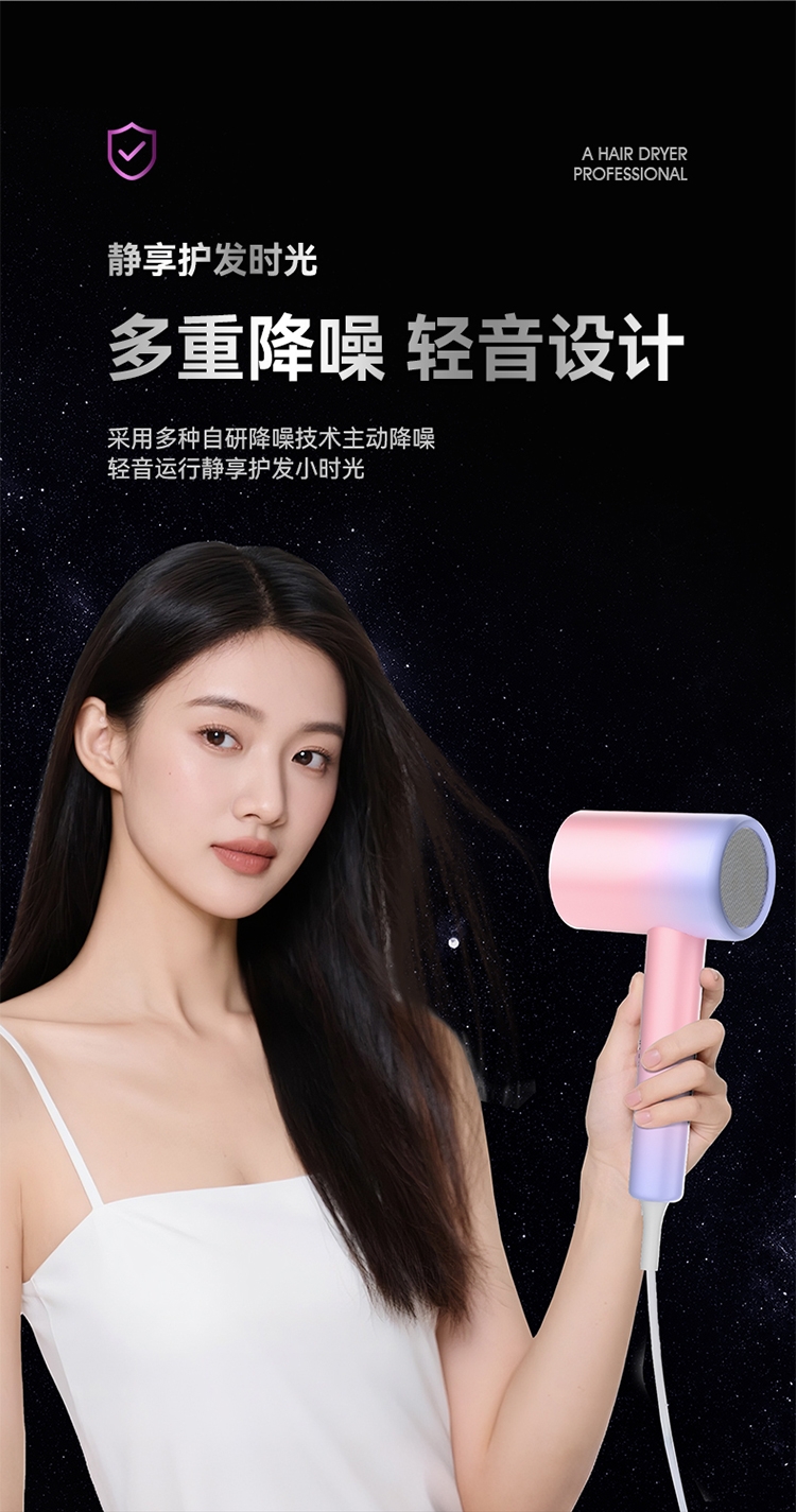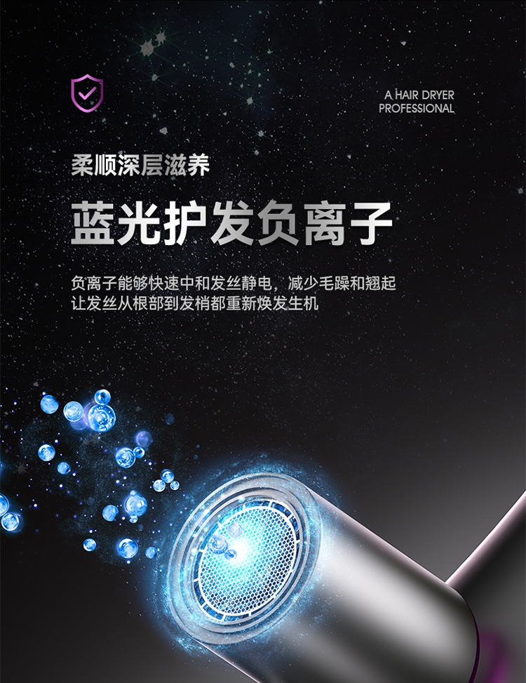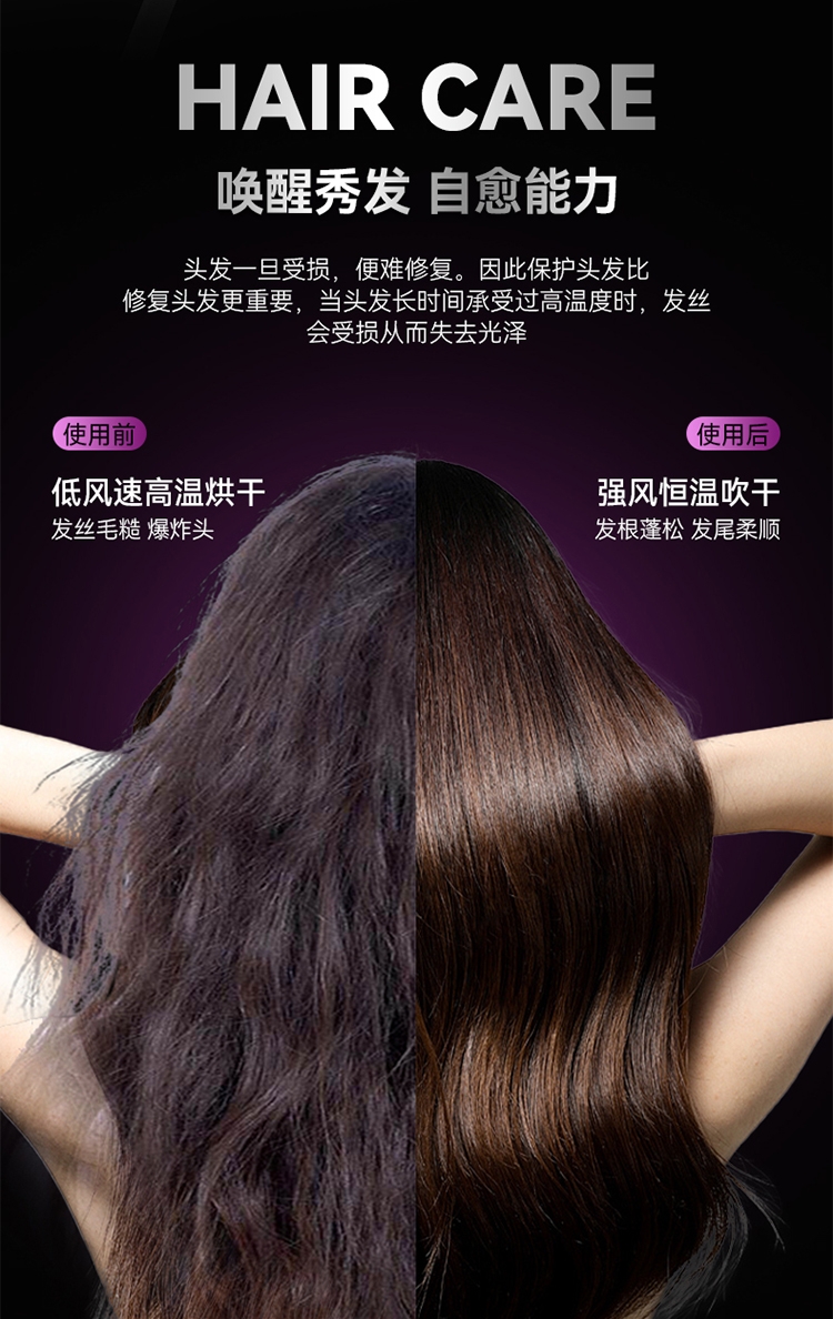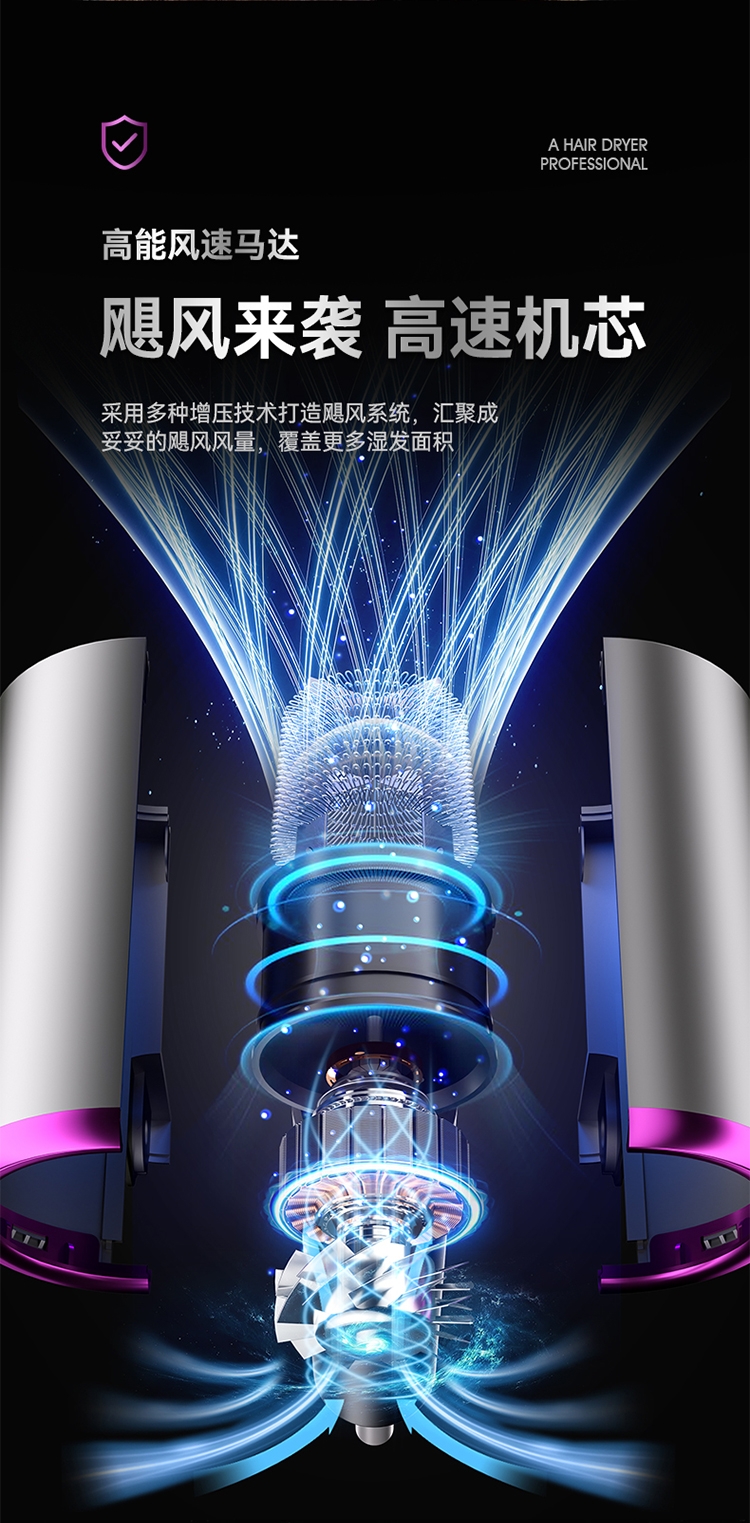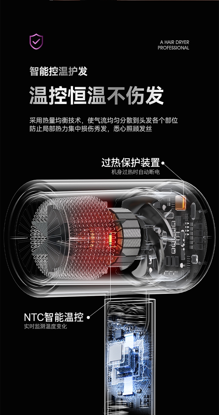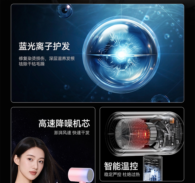 高速降噪机芯 澎湃风速 快速干发;智能温控 稳定严控 杜绝过热;蓝光离子护发
