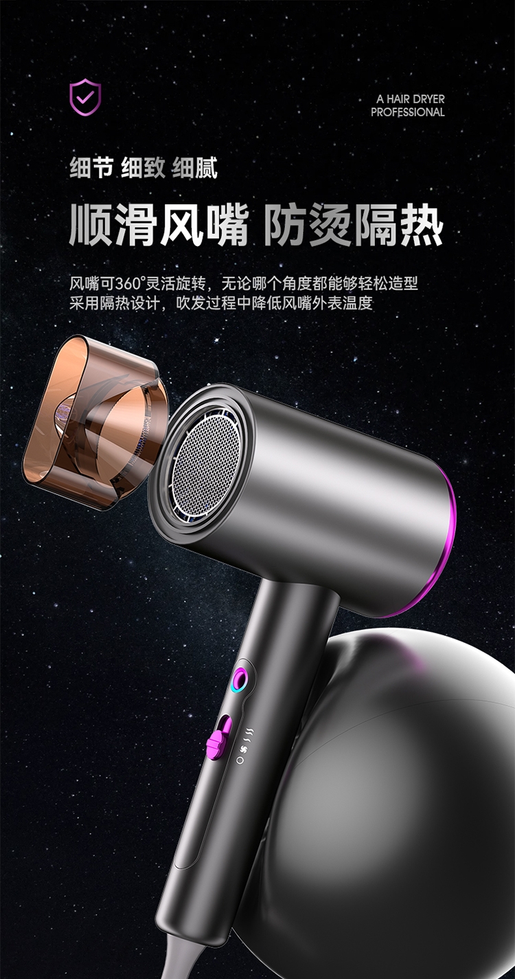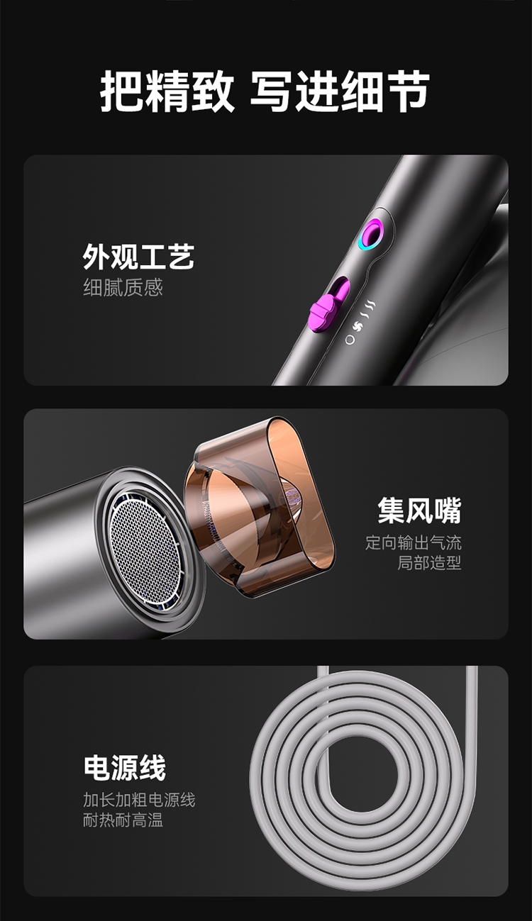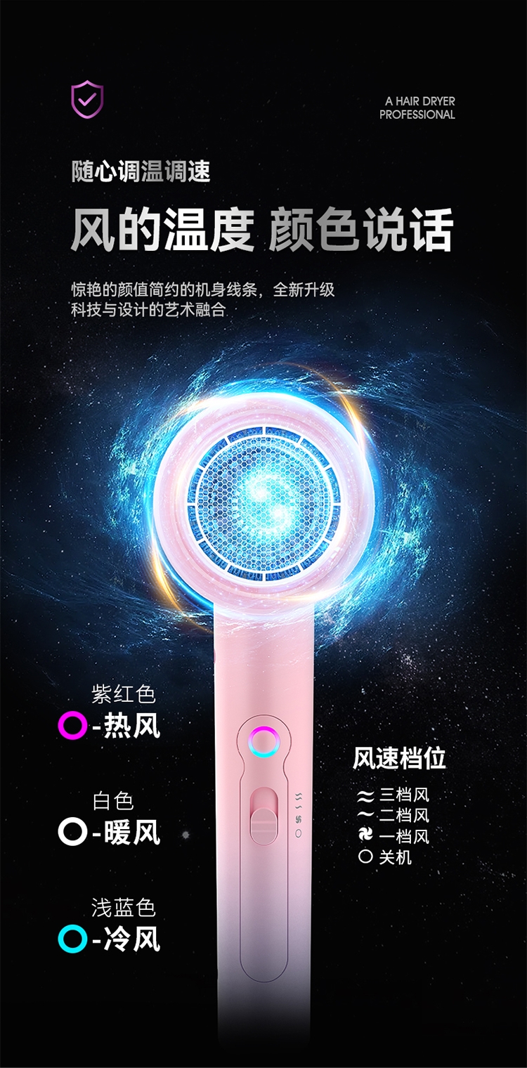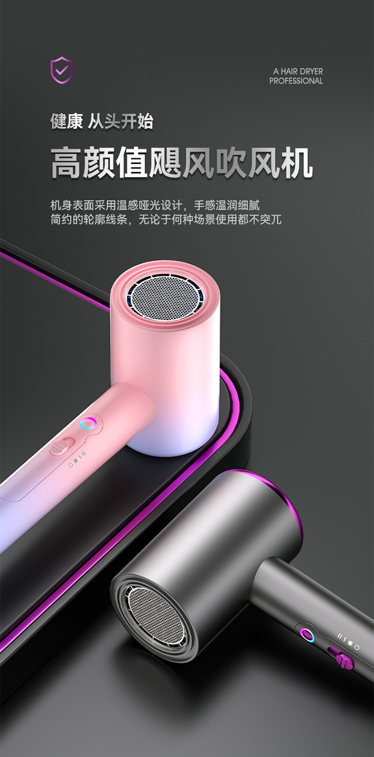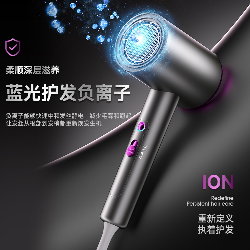高速降噪机芯 澎湃风速 快速干发;智能温控 稳定严控 杜绝过热;蓝光离子护发