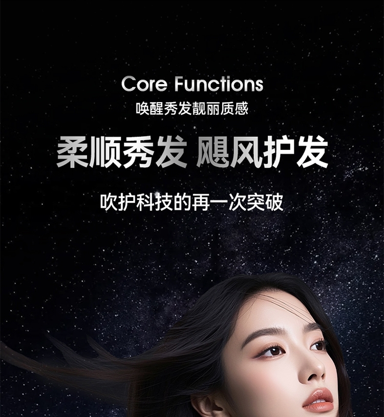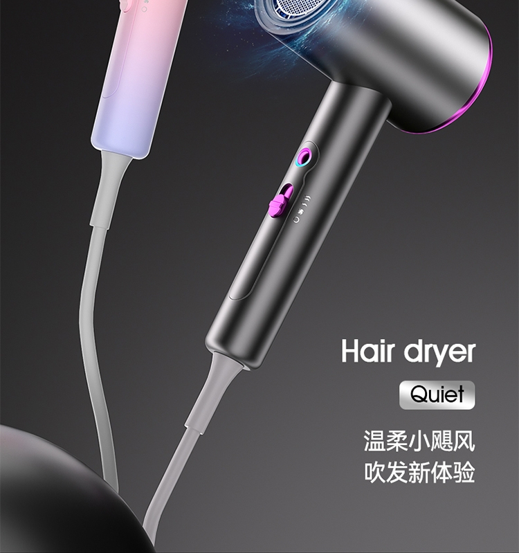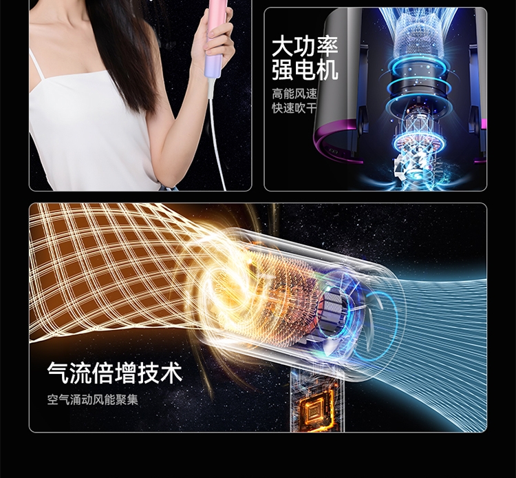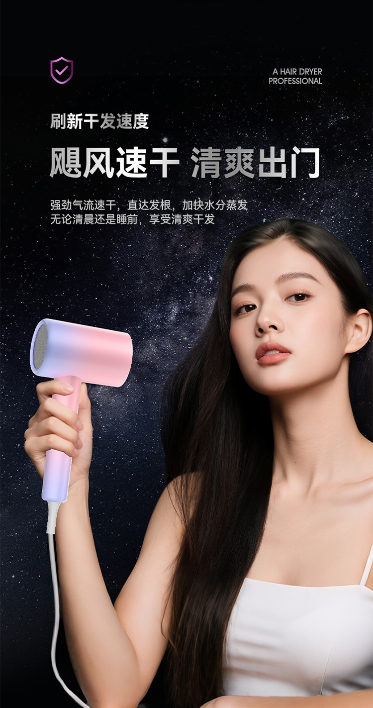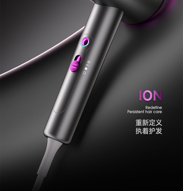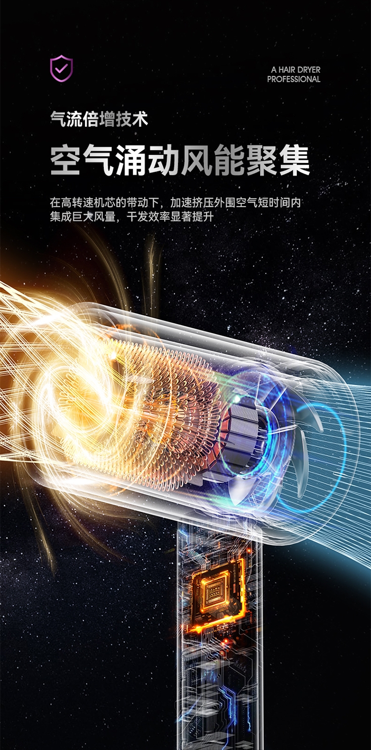 高速降噪机芯 澎湃风速 快速干发;智能温控 稳定严控 杜绝过热;蓝光离子护发