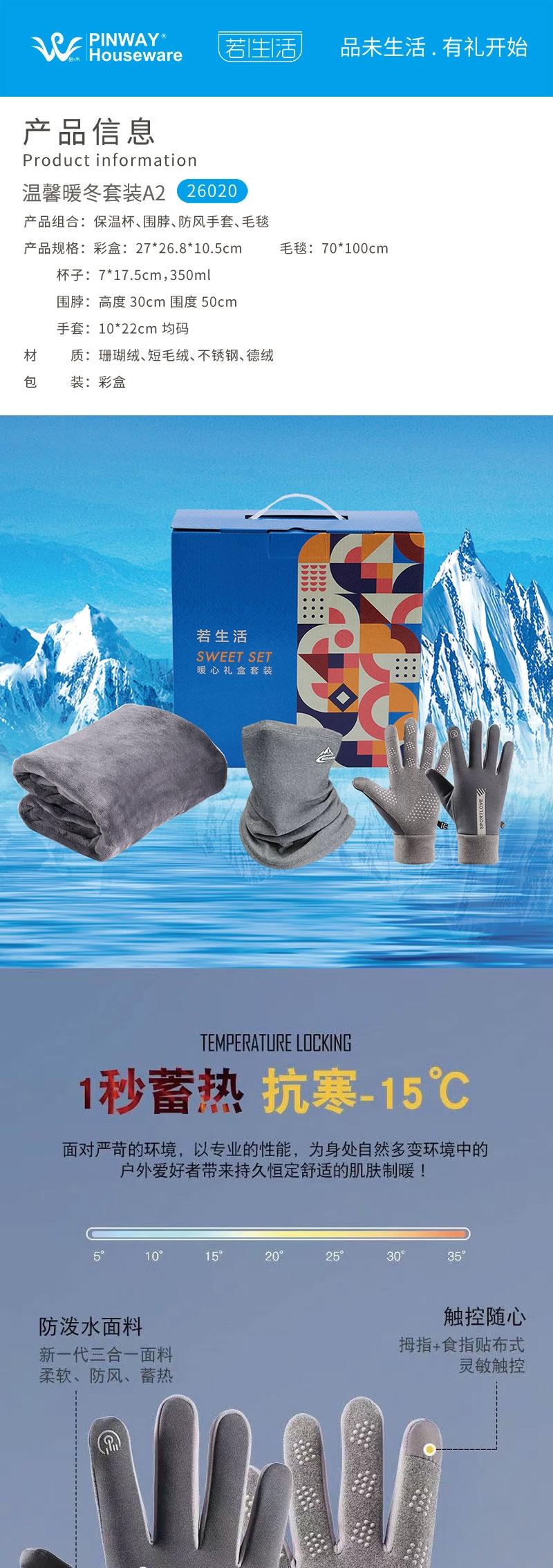 暖冬伴手礼商务礼品;超柔面料毛毯,可做披肩使用;德绒围脖 防水手套