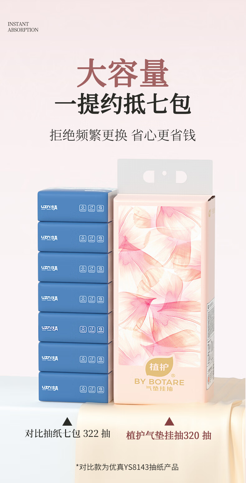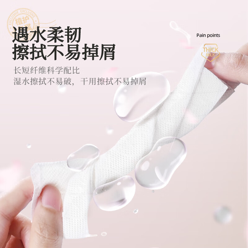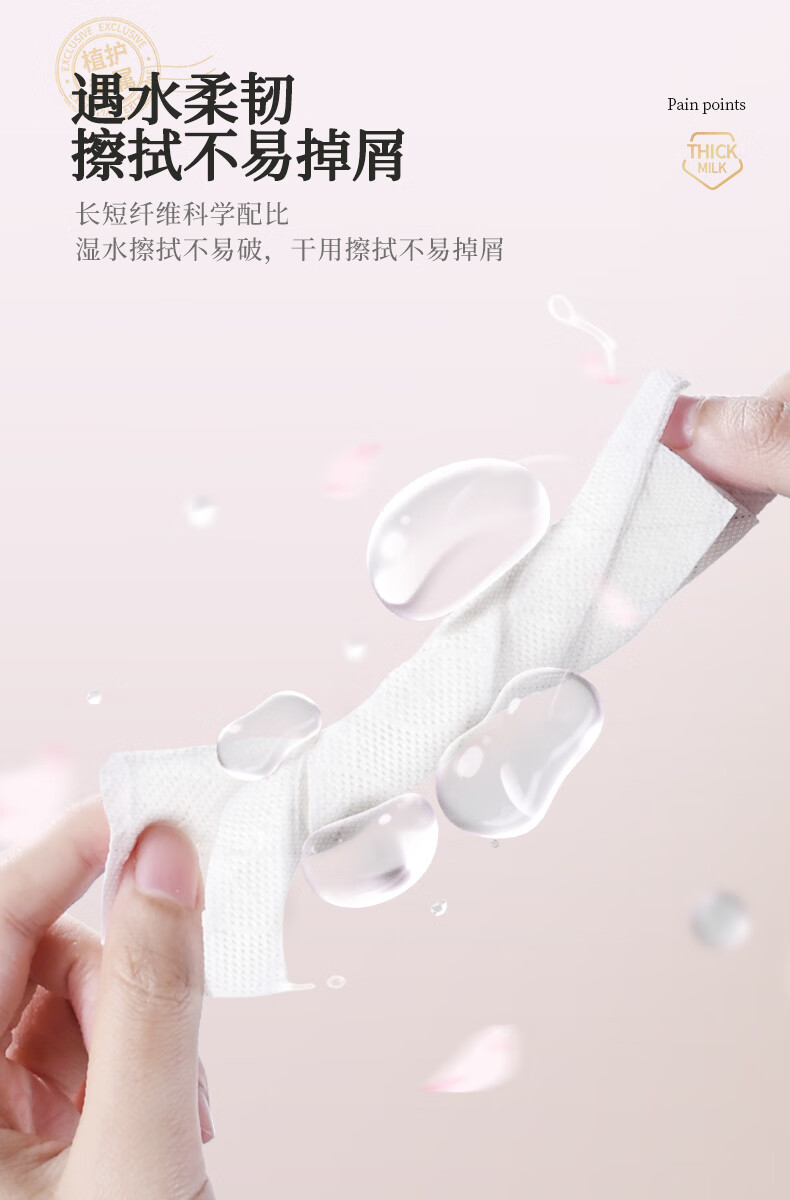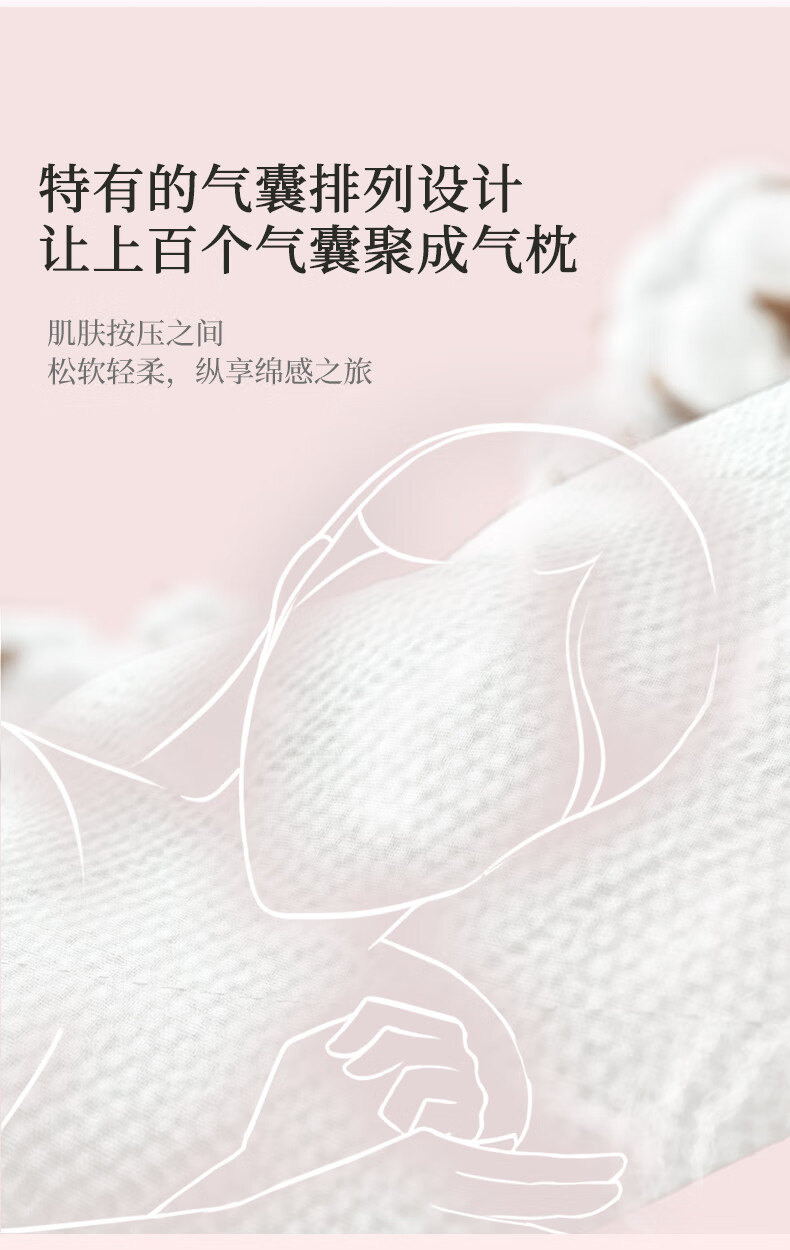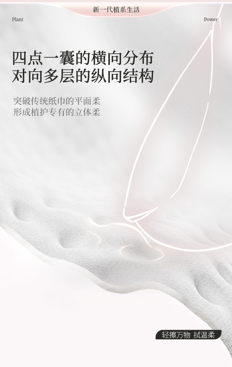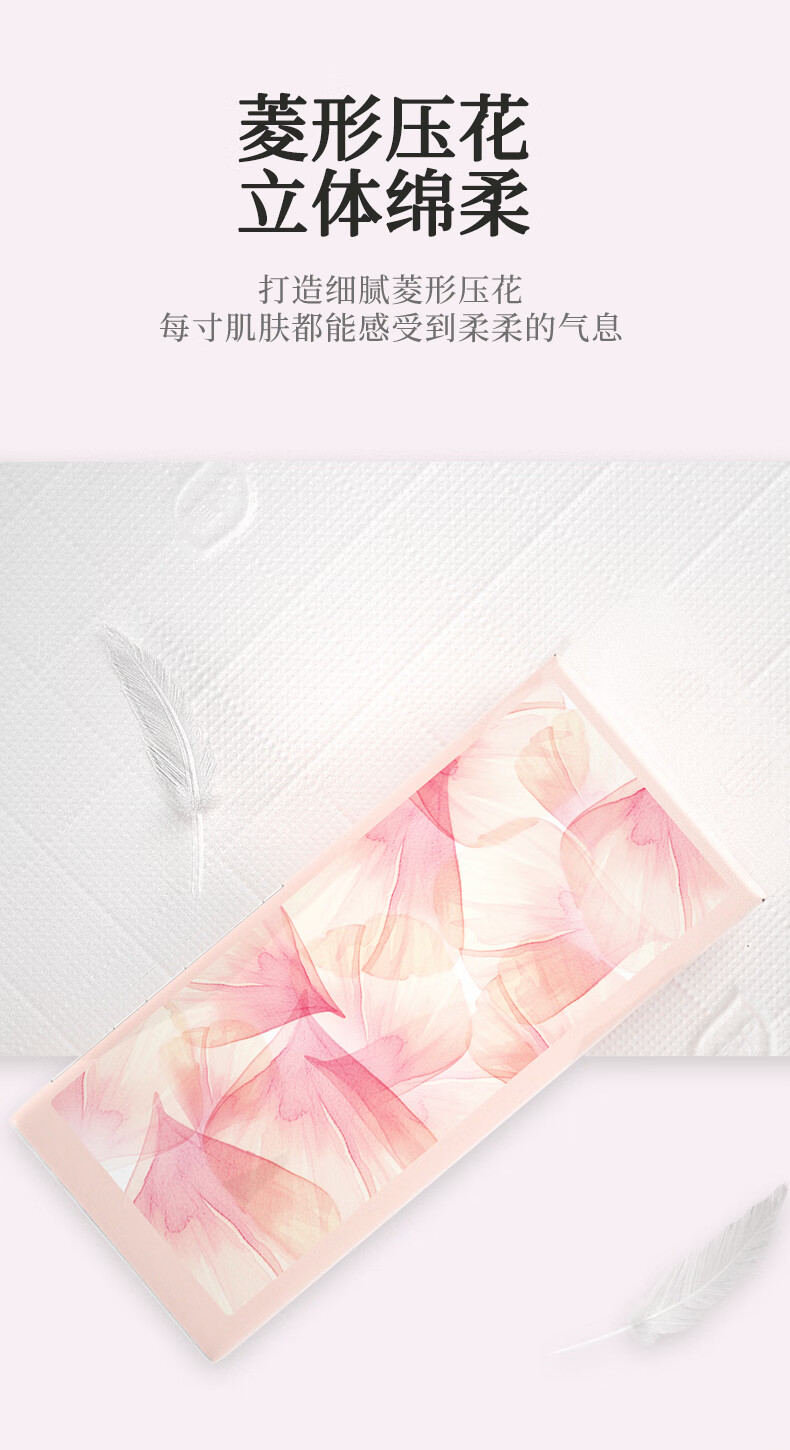 轻盈压花 臻享品质;柔软触感 亲如肌肤;遇水柔韧 擦拭无屑;加大设计 一张抵两张