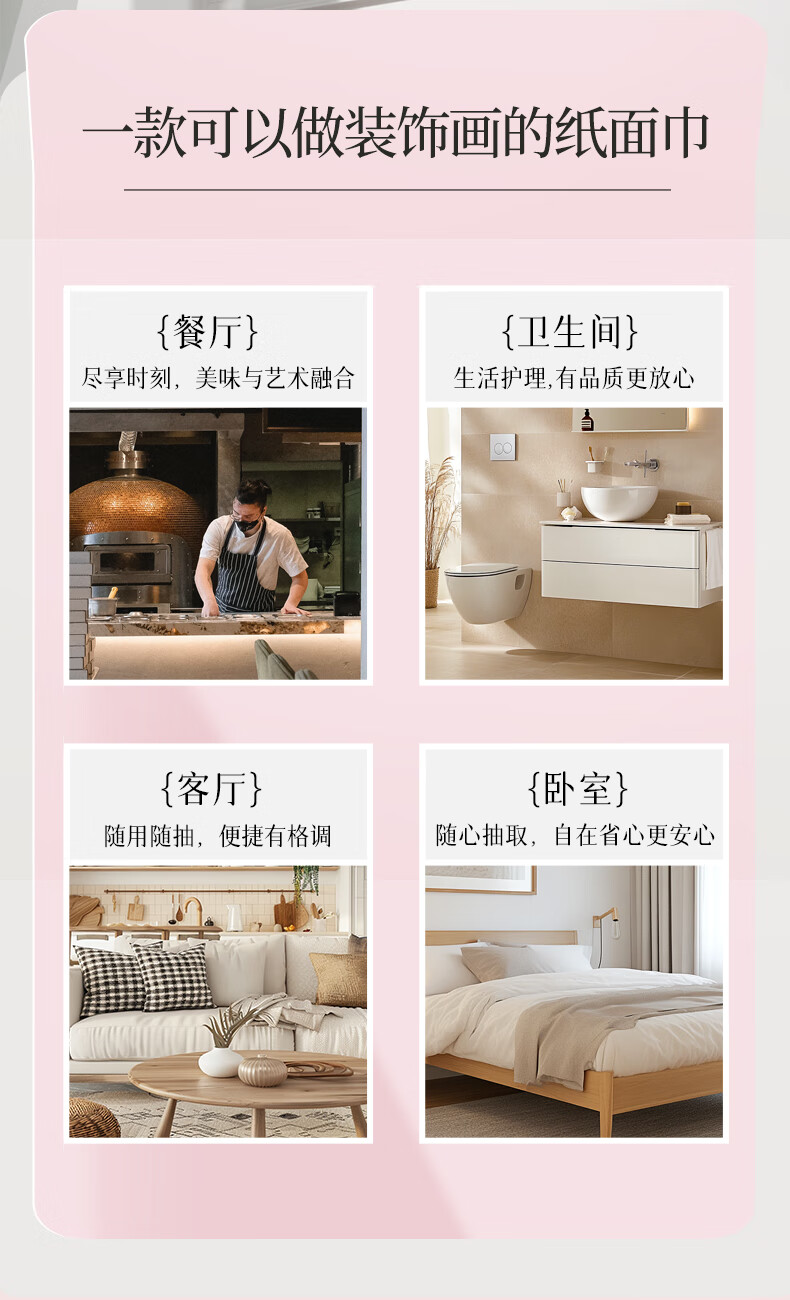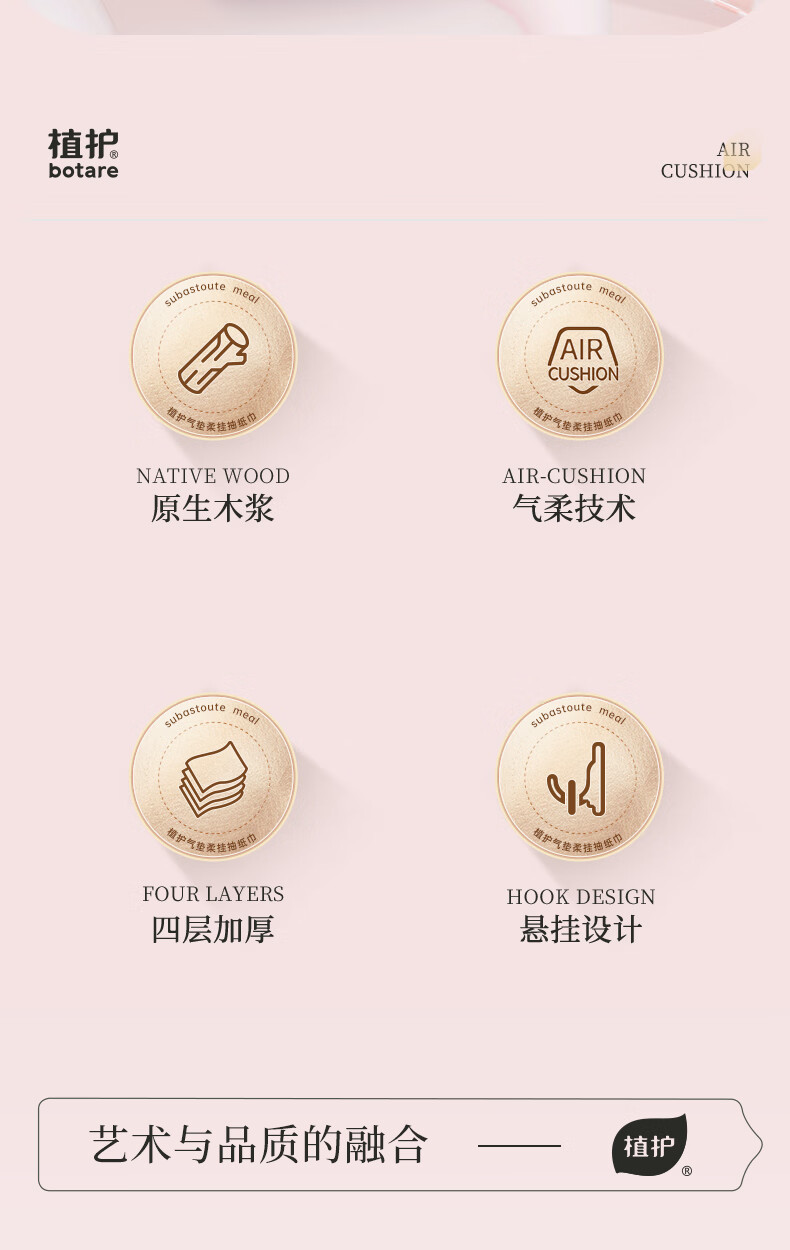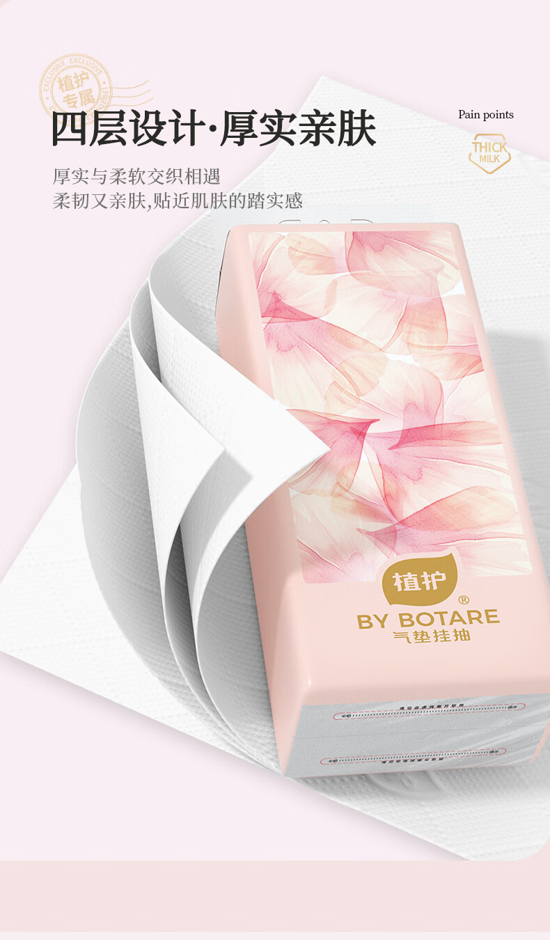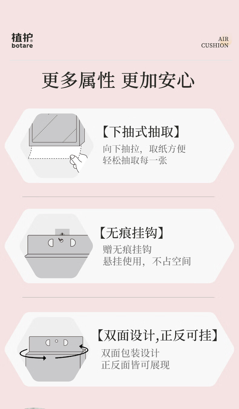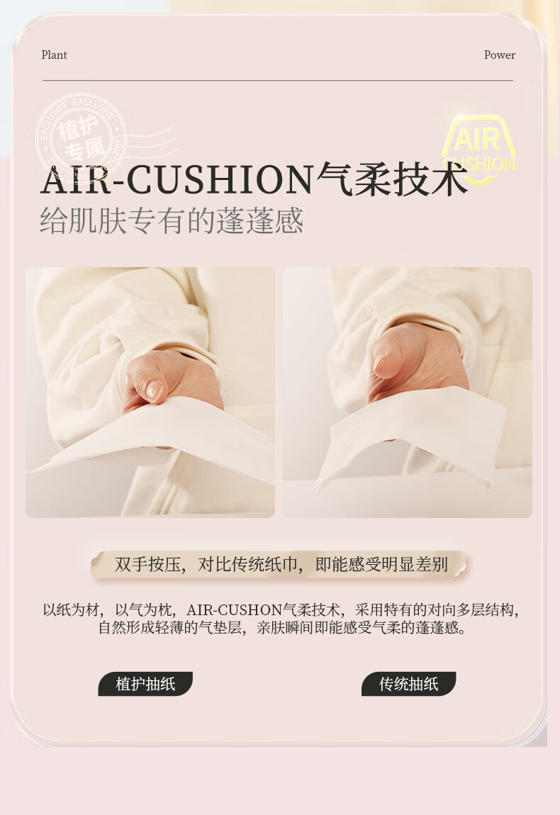 轻盈压花 臻享品质;柔软触感 亲如肌肤;遇水柔韧 擦拭无屑;加大设计 一张抵两张