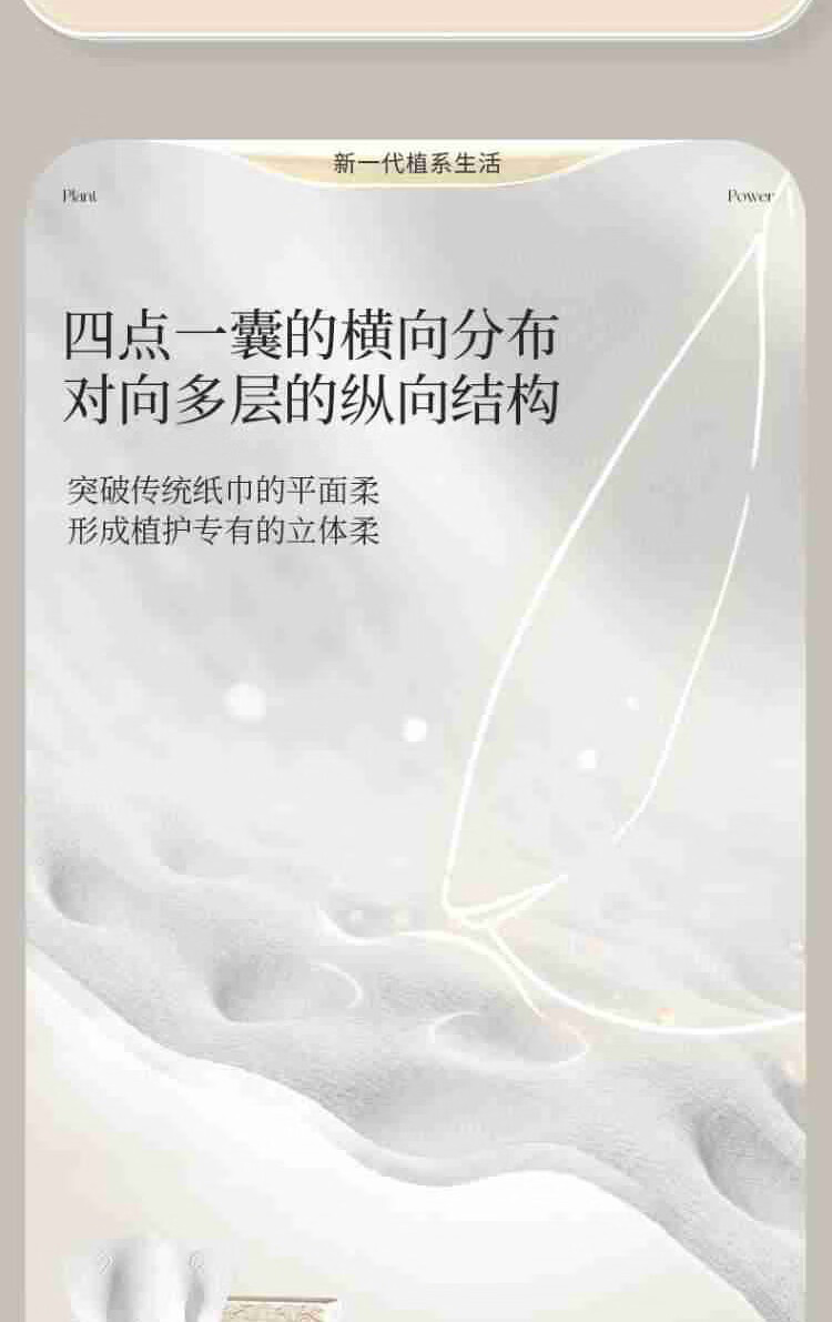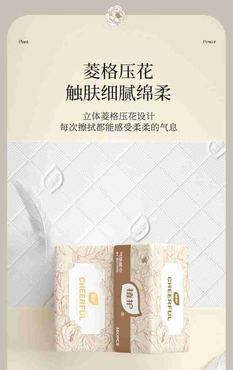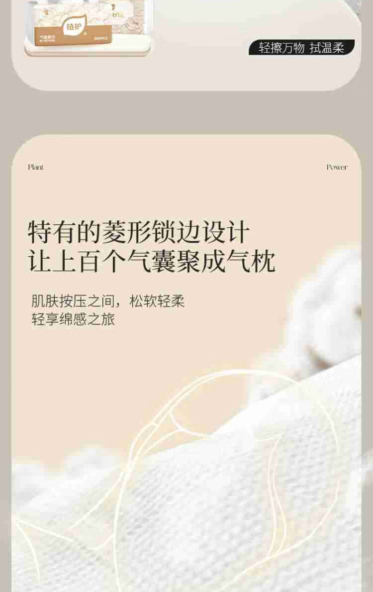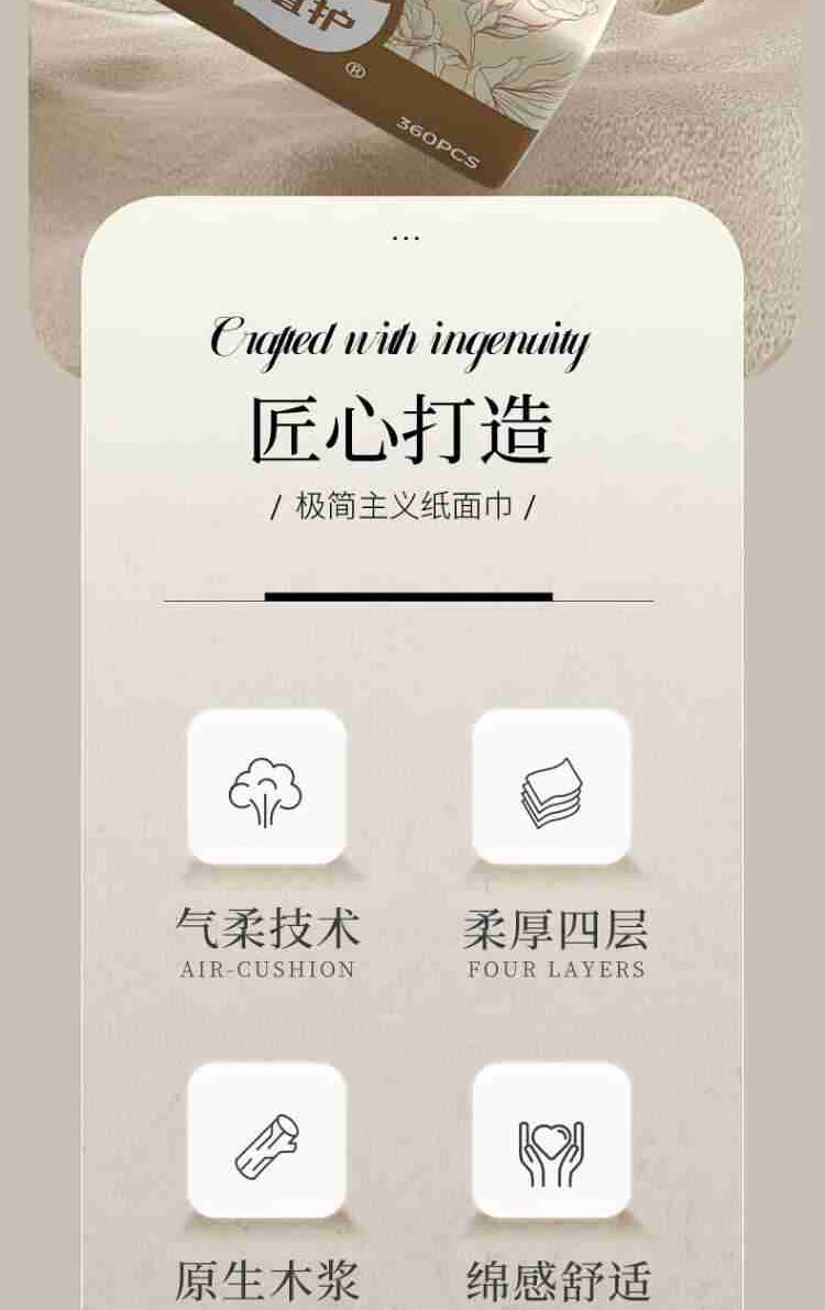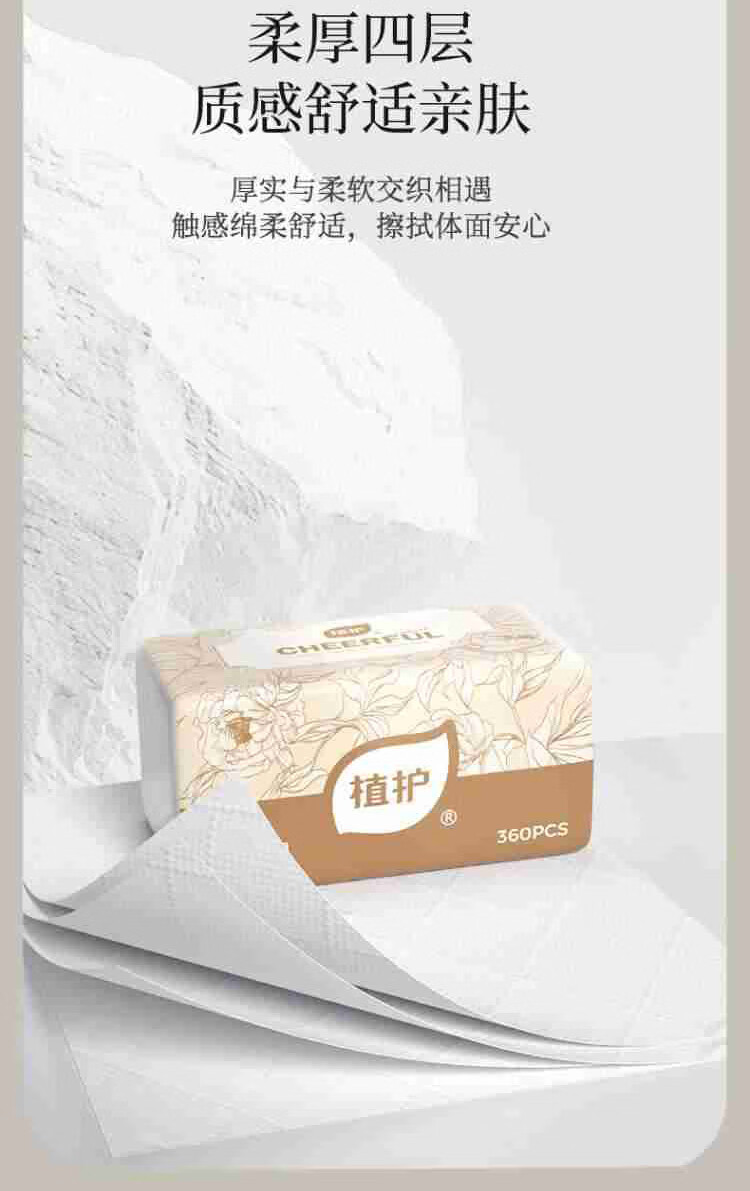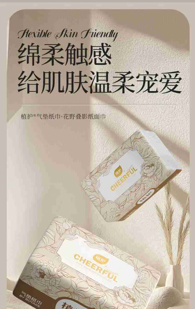 原生木浆 进口品质;轻盈压花 臻享品质;柔软触感 亲如肌肤;加大设计 一张抵两张