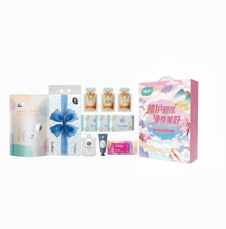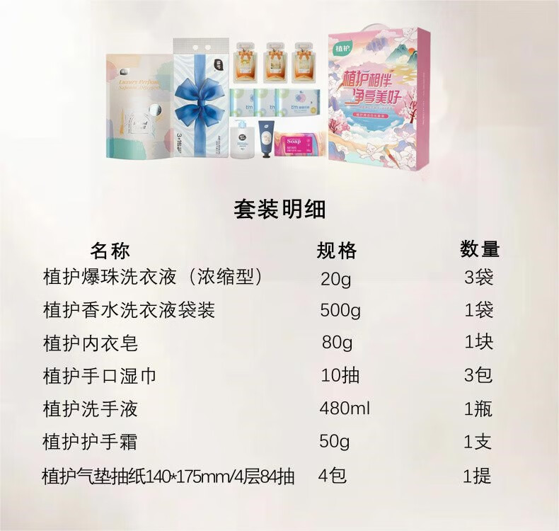 配置清单:植护气垫抽纸4包/提*1提+植护洗衣液袋装500g*1袋+植护内衣抑菌皂80g*1块+植护洗手液480ml*1瓶+植护手口湿巾10抽*3包+植护爆珠洗衣液浓缩型20g* 3包+植护护手霜50g*1盒+礼盒