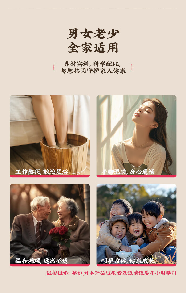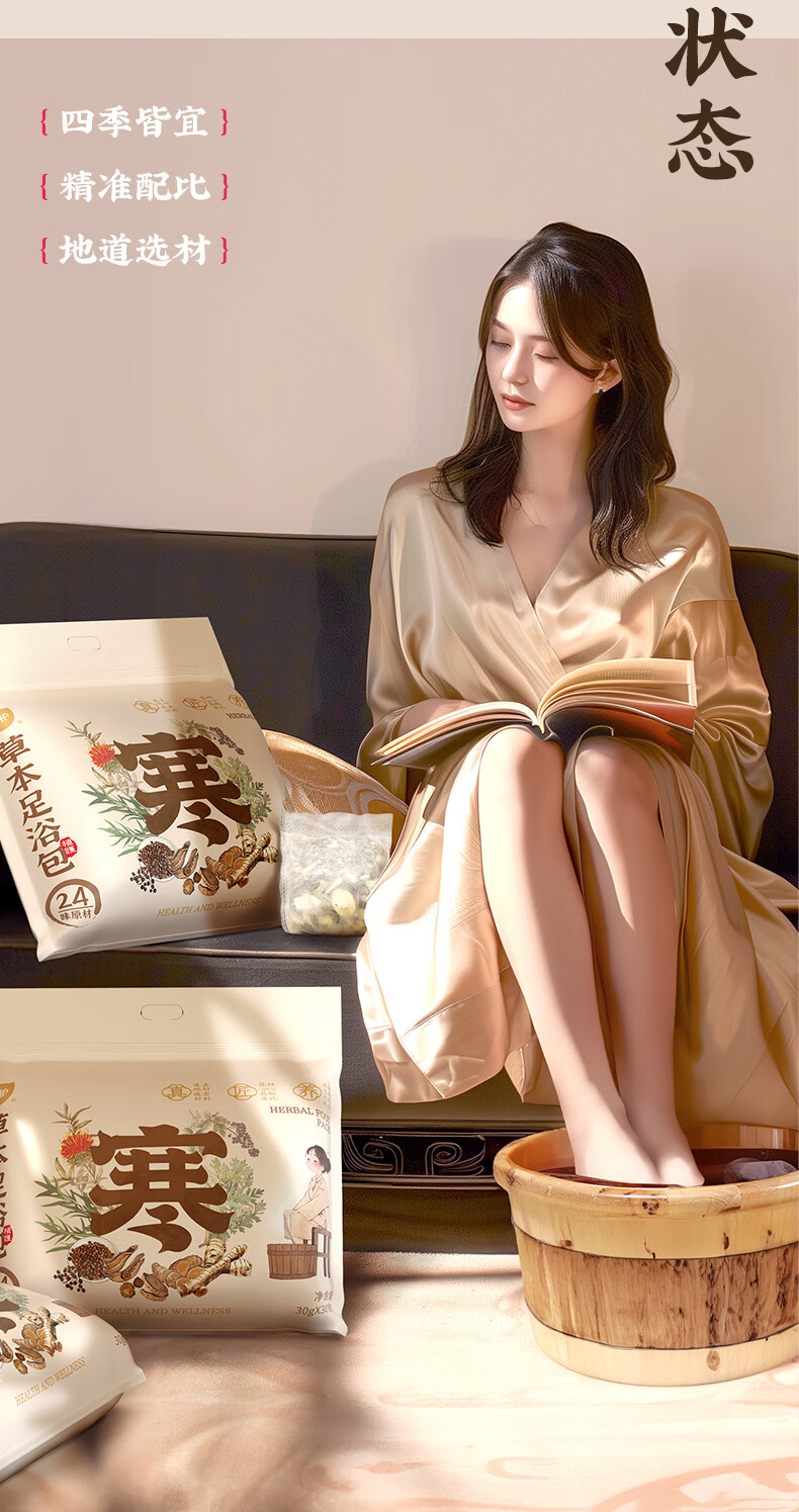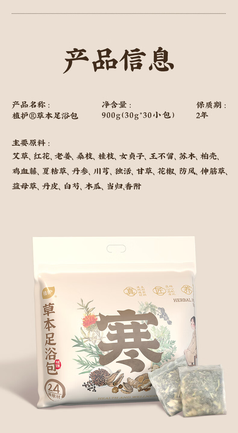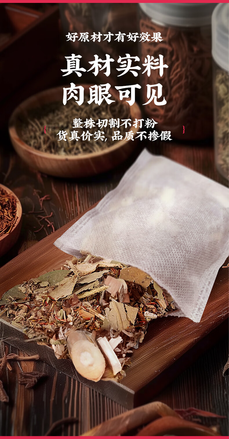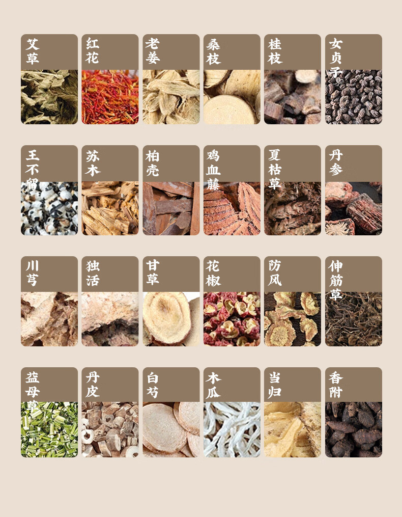 主要原料:艾草、红花、老姜、桑枝、桂枝、女贞子、王不留、苏木柏壳、鸡血藤、夏枯草、丹参、川芎、独活、甘草、花椒防风、 伸筋草益母草、丹皮、白芍、木瓜、当归、香附