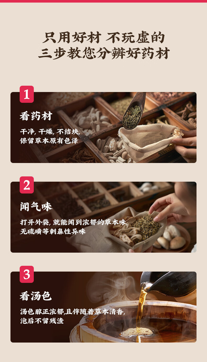 24味草本,严选好材,科学调配;自然晾晒,无香精、无薰硫、无色素;汤色醇正浓郁,且伴随着草本清香,泡后不留残渣