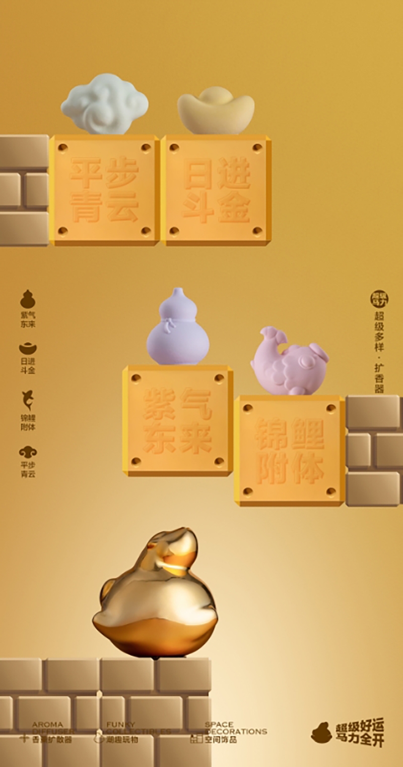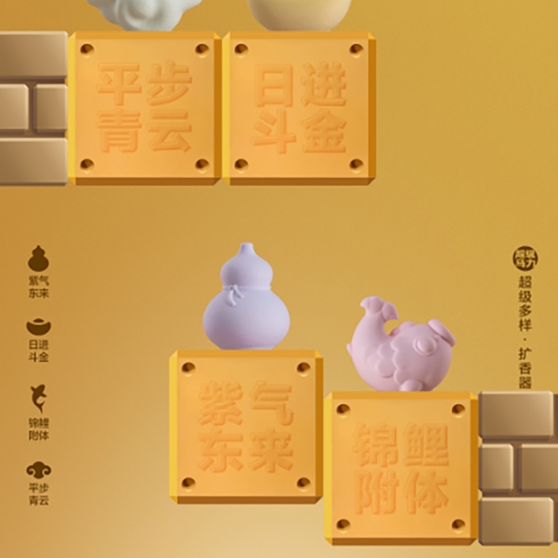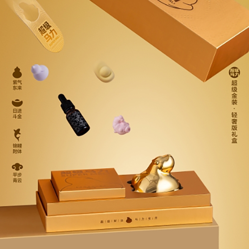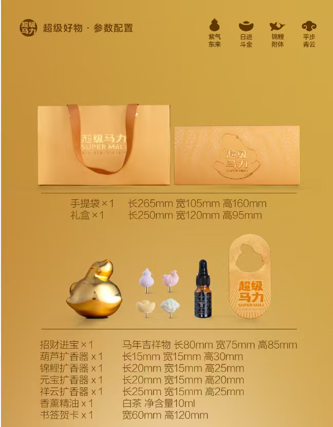 配置:招财进宝马年吉祥物(两款可选)*1 葫芦扩香器*1 锦鲤扩香器*1 元宝扩香器*1 祥云扩香器*1 香薰精油*1 书签贺卡*1