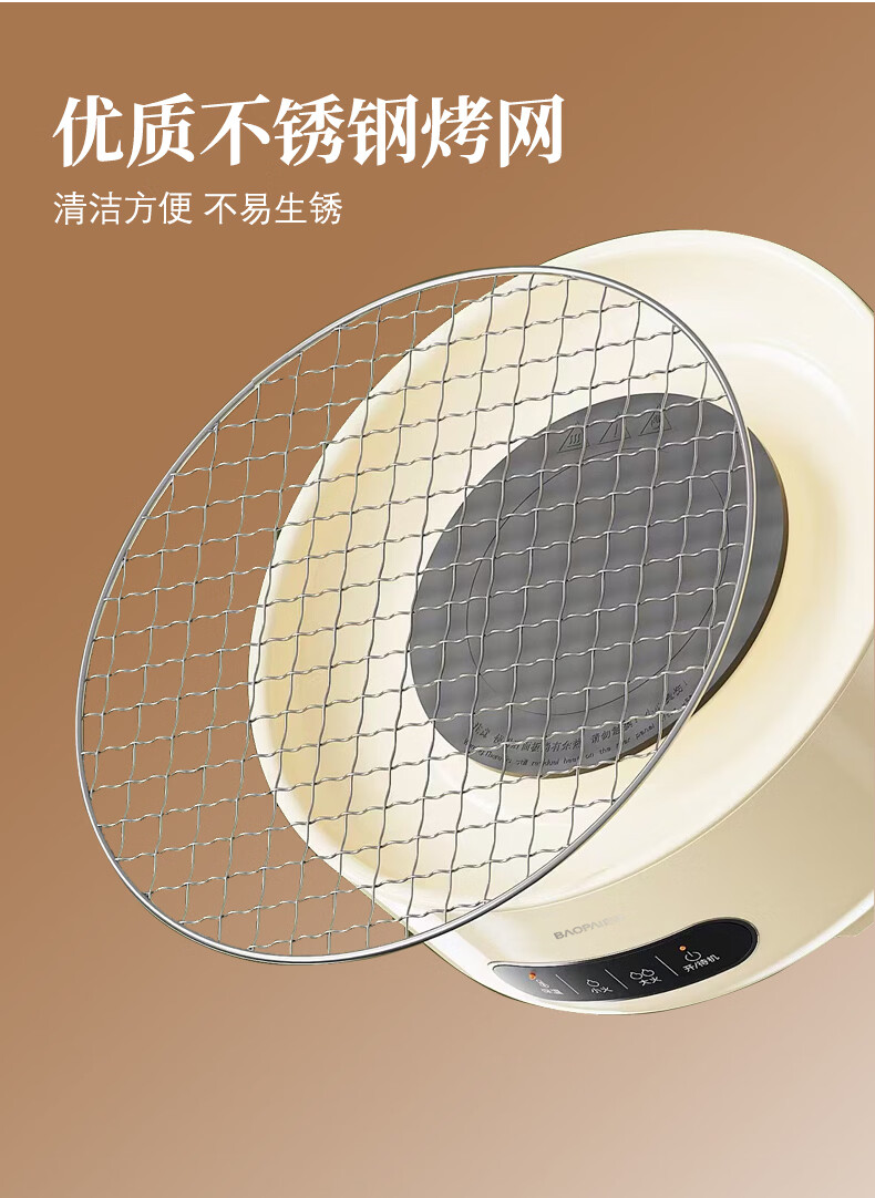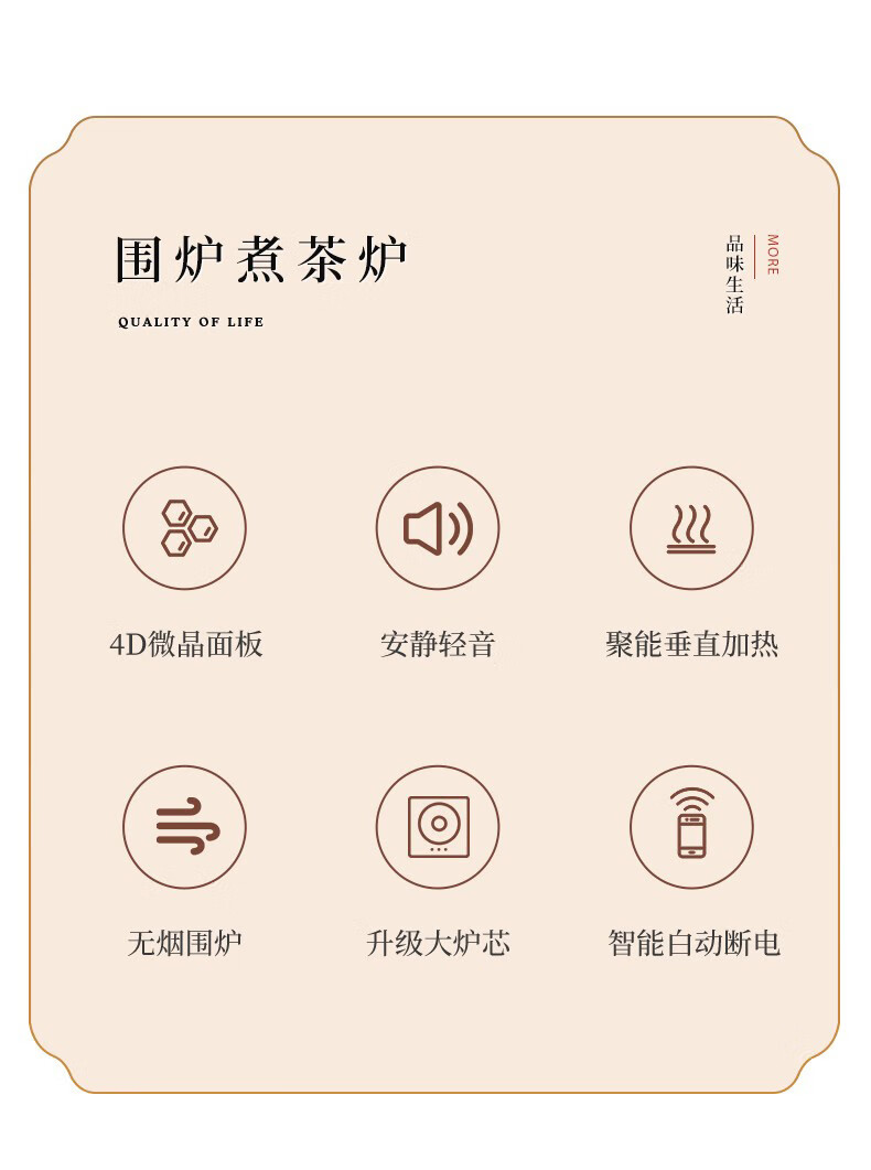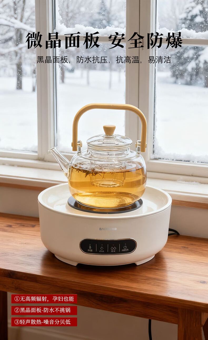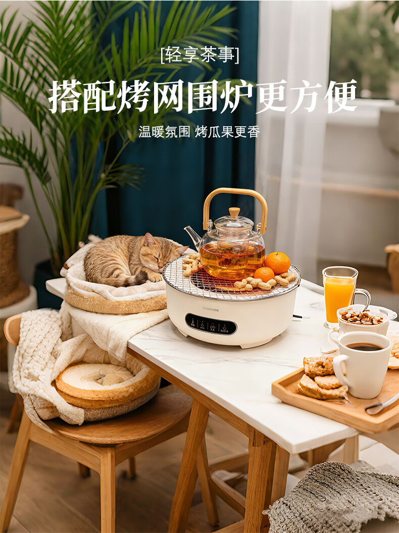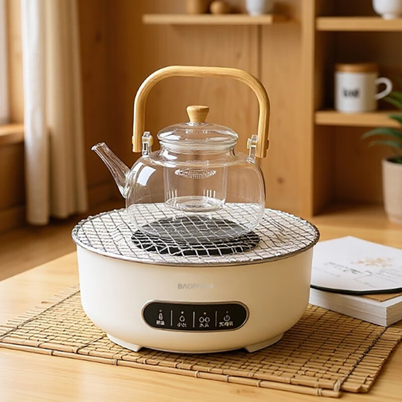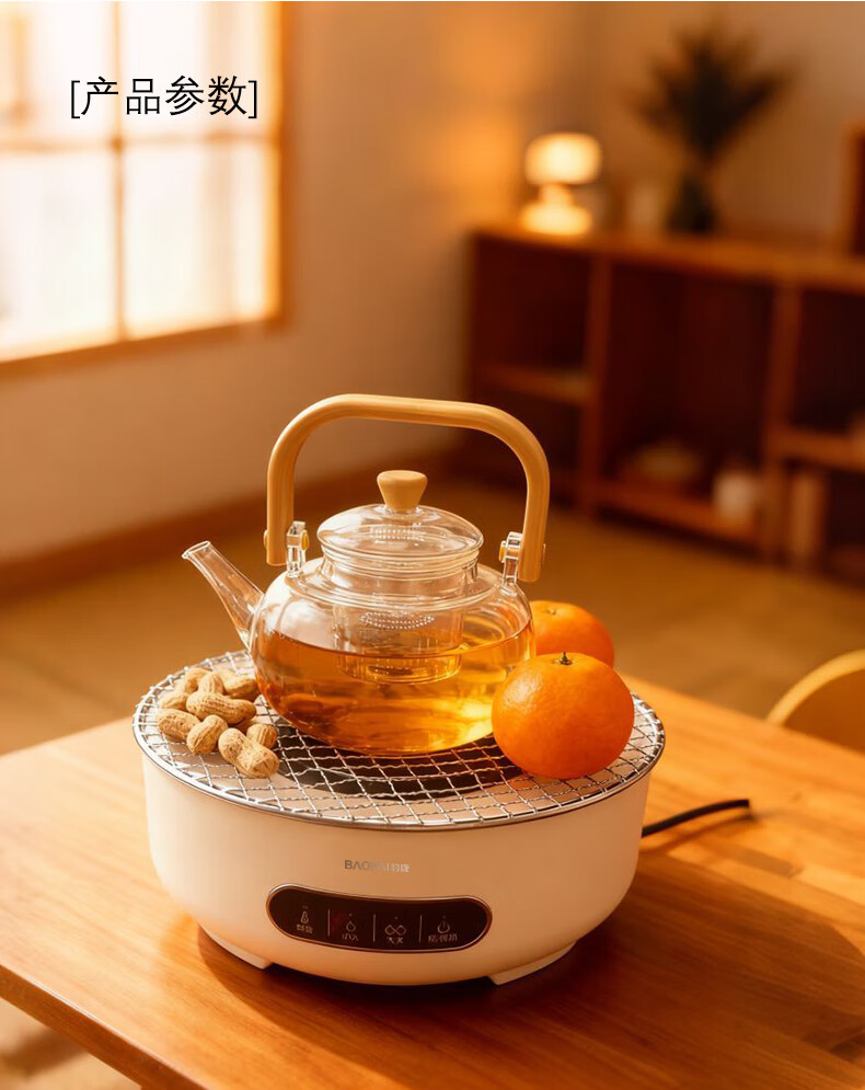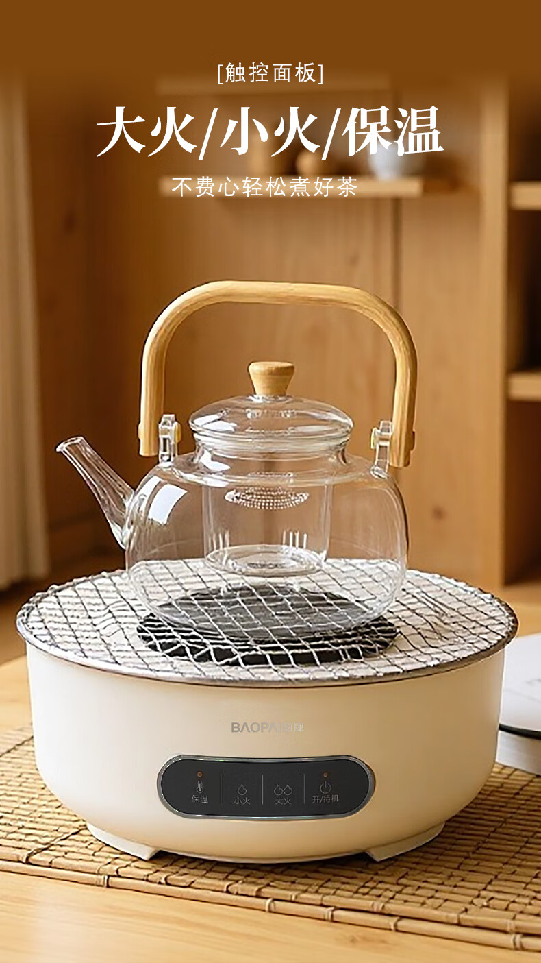 智能触屏操控,使用简单;保温、小火、大火可调;耐高温微晶面板,防爆、易清洁;食品可接触级不锈钢烤网;高硼硅玻璃煮茶壶,自带提梁把手