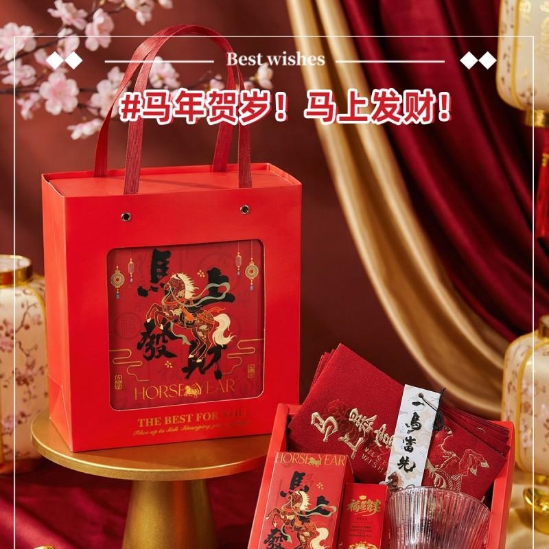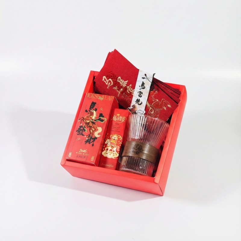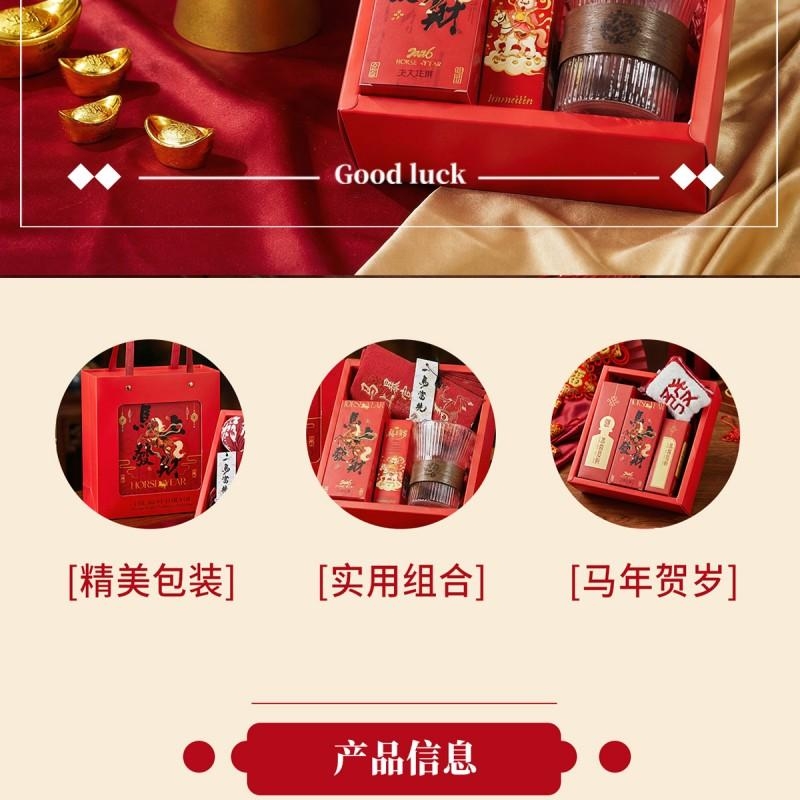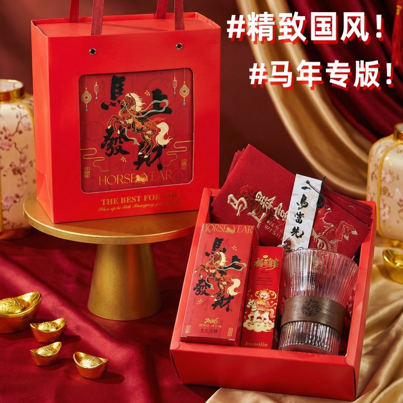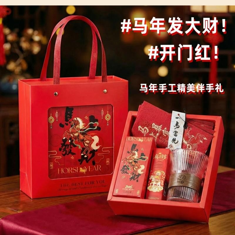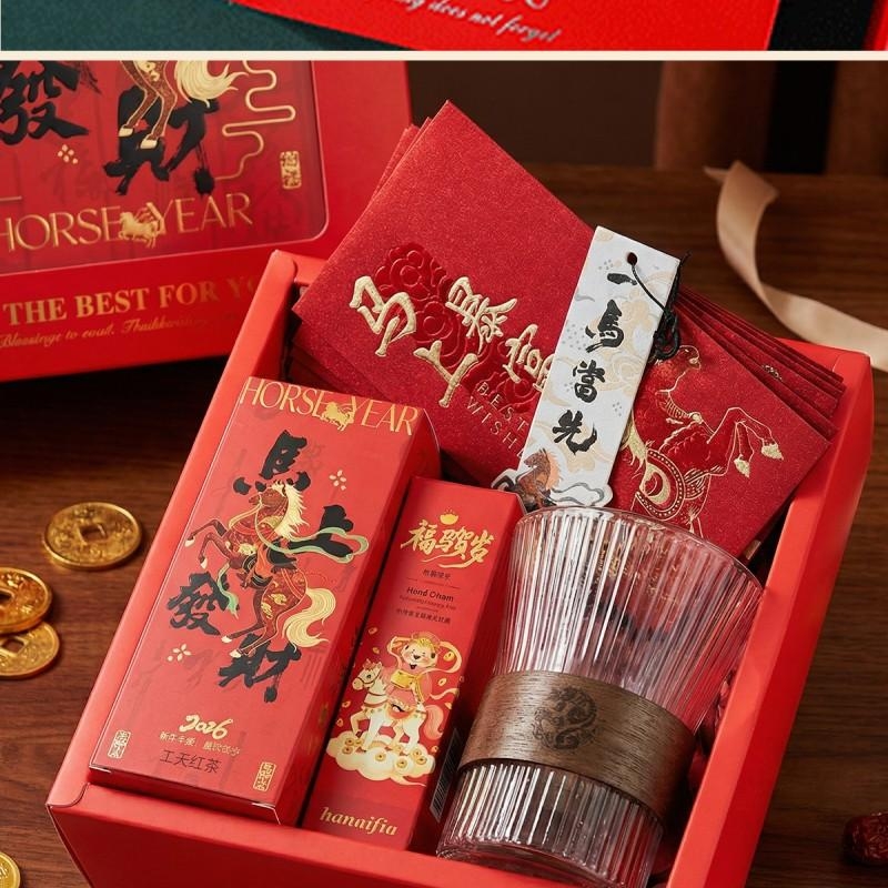 组合:马年红包*6张、玻璃杯350ml、马上发财红茶8g*2袋、福马贺岁滋润护手霜35g、一马当先香片香挂