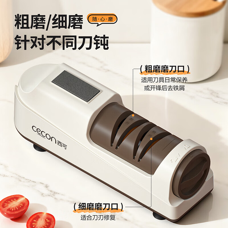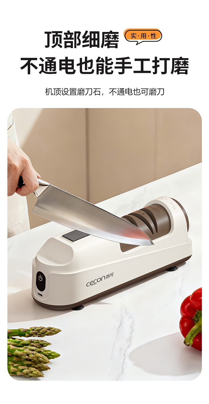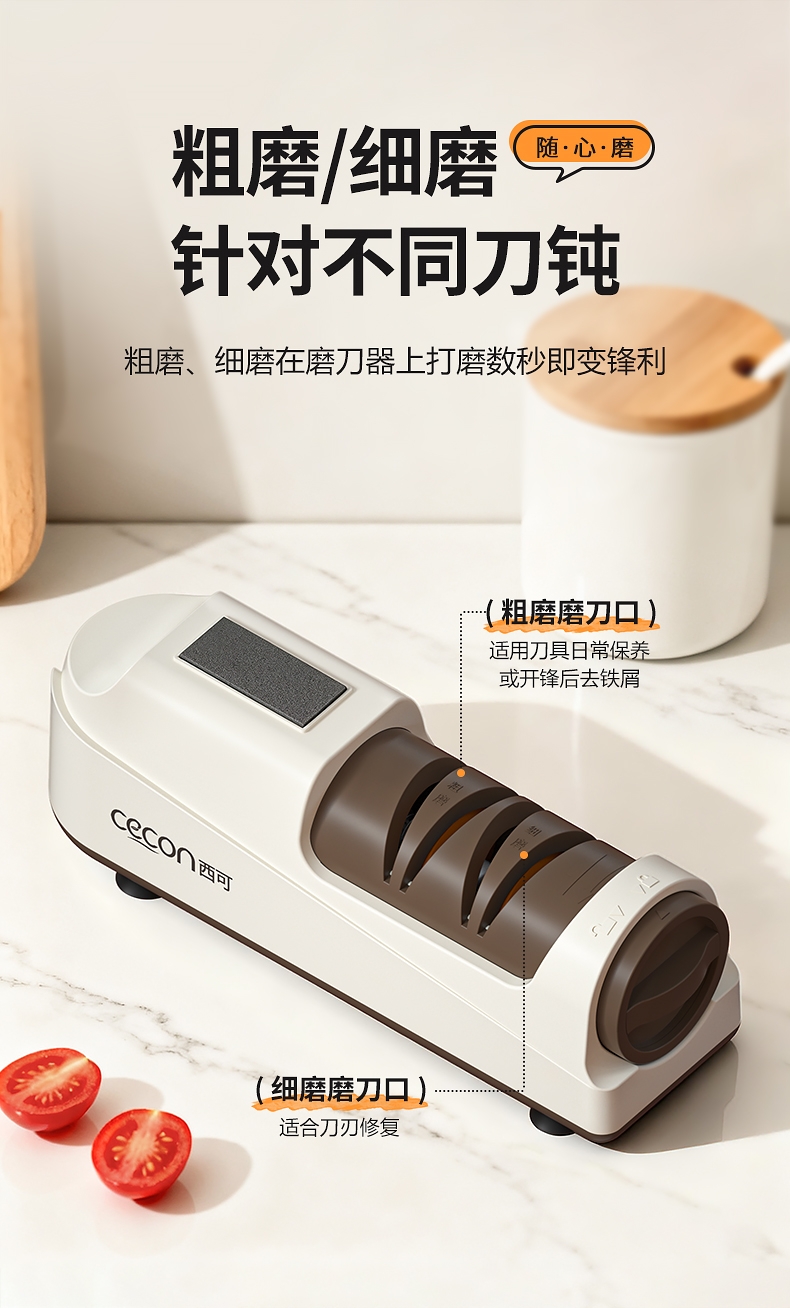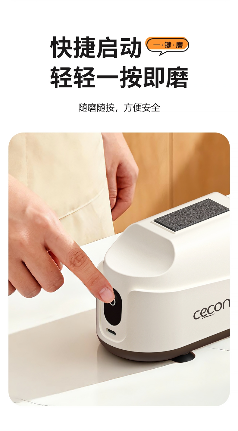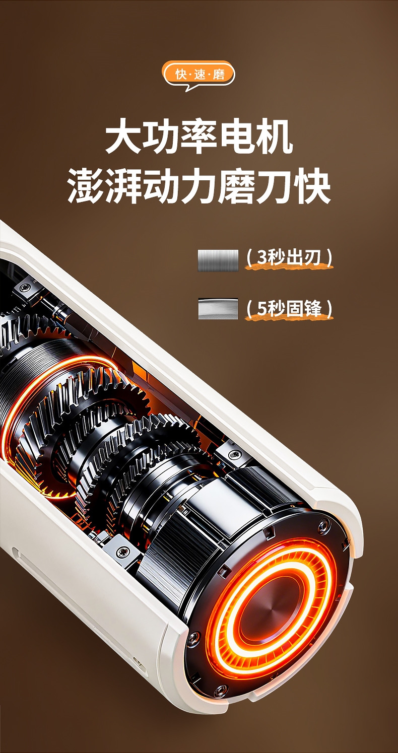 3秒速磨,高效磨新,比手磨更快、更专业;大功率纯铜电机,澎湃动力磨刀快,安全不伤手;针对不同刀钝双头精准打磨,粗磨开刃;ABS食品级材料,安全无异味;一按即磨,快捷启动,便捷Type-C充电款