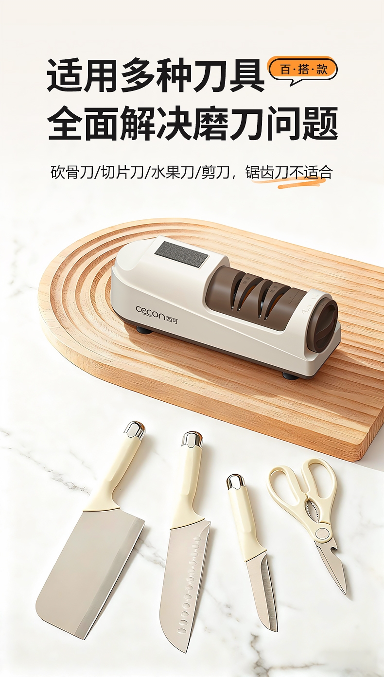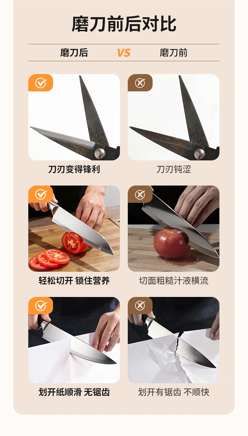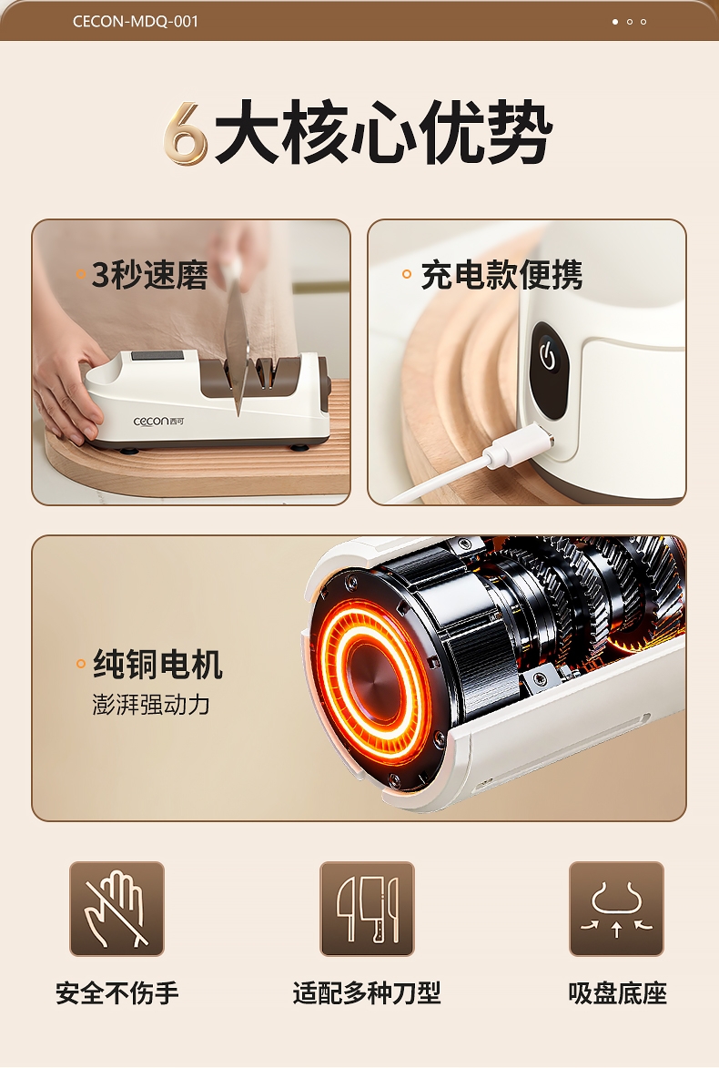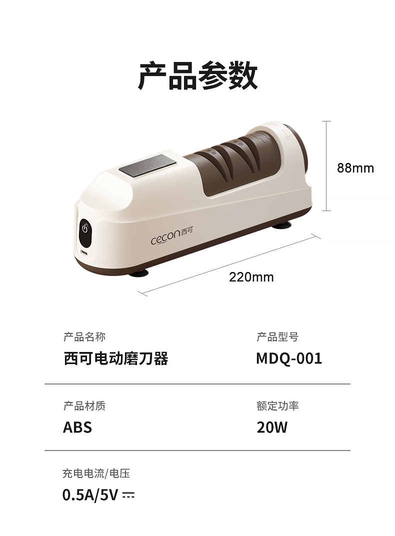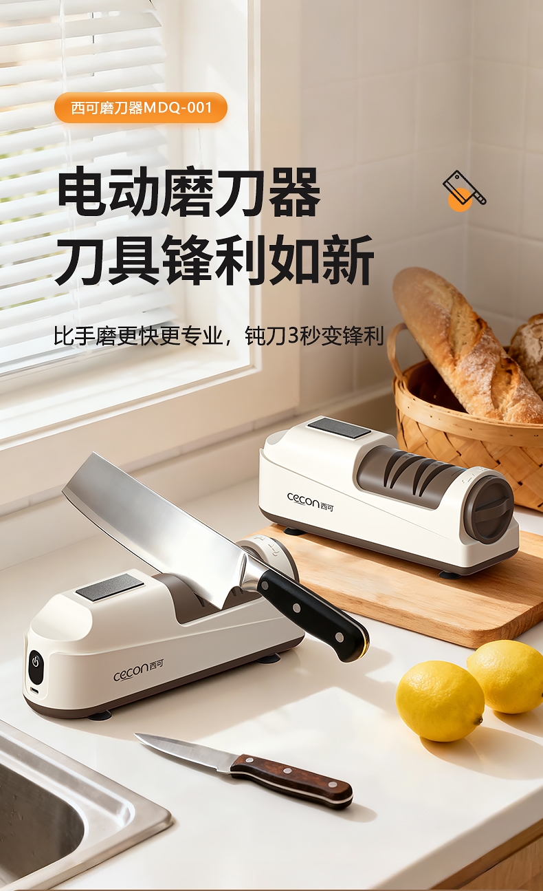 3秒速磨,高效磨新,比手磨更快、更专业;大功率纯铜电机,澎湃动力磨刀快,安全不伤手;针对不同刀钝双头精准打磨,粗磨开刃;ABS食品级材料,安全无异味;一按即磨,快捷启动,便捷Type-C充电款