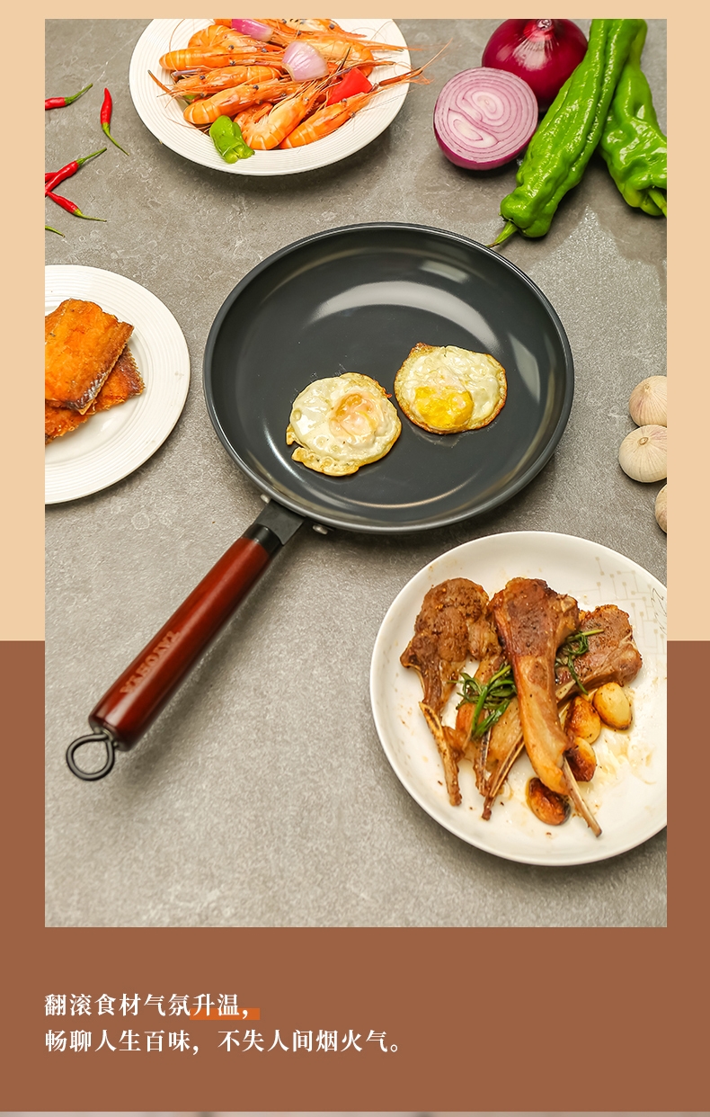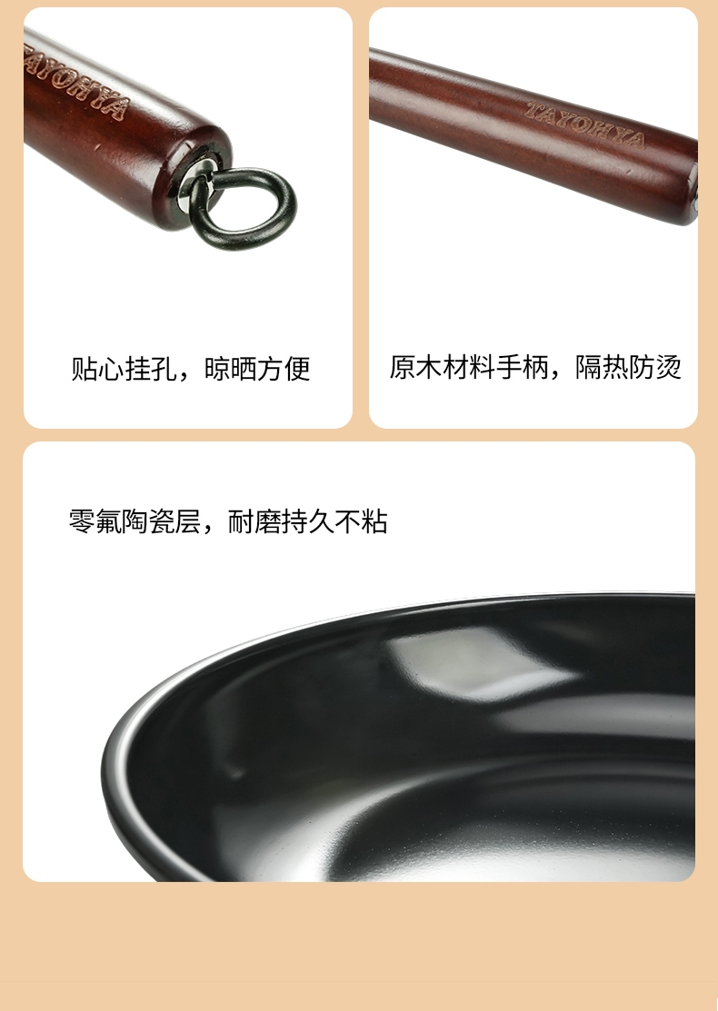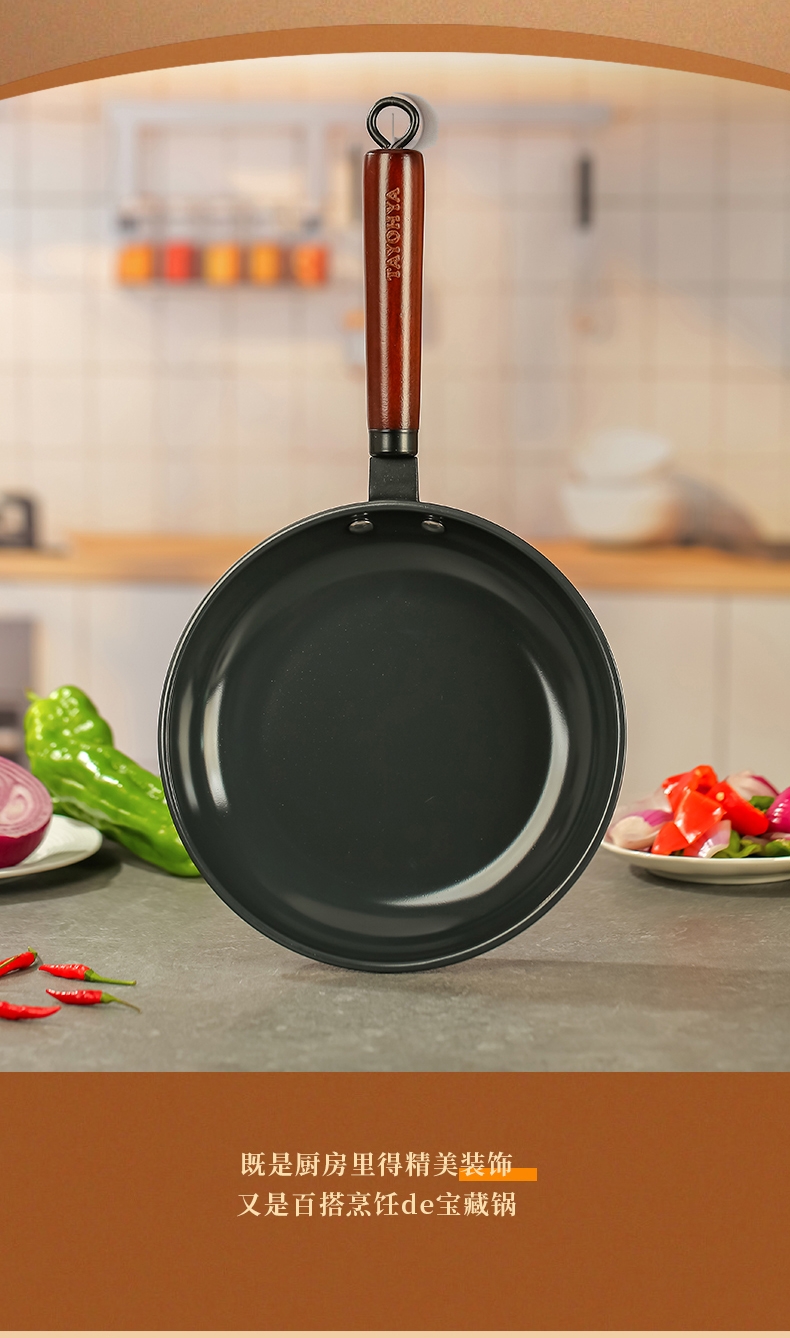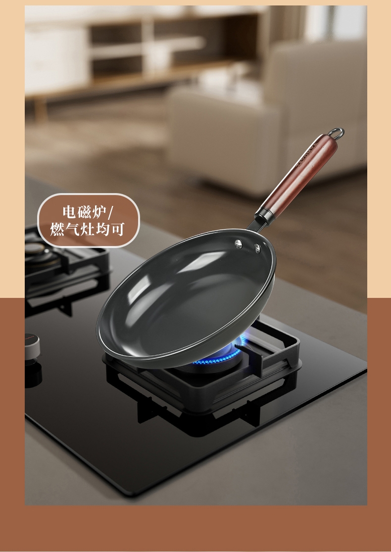内表层采用零氟超硬陶瓷层,耐磨持久不粘;锅体优质精铁板材,一次锻压成型;手柄采用原木材料,人体力学设计,古朴大方,手感极佳;拥有优良的隔热和防烫效果;24CM直径锅体,受热面积大,燃气灶、电磁炉通用
