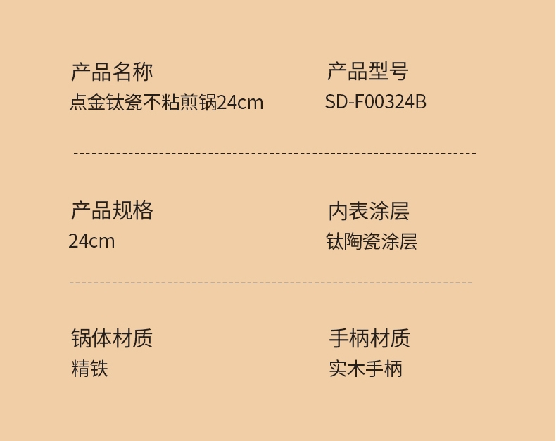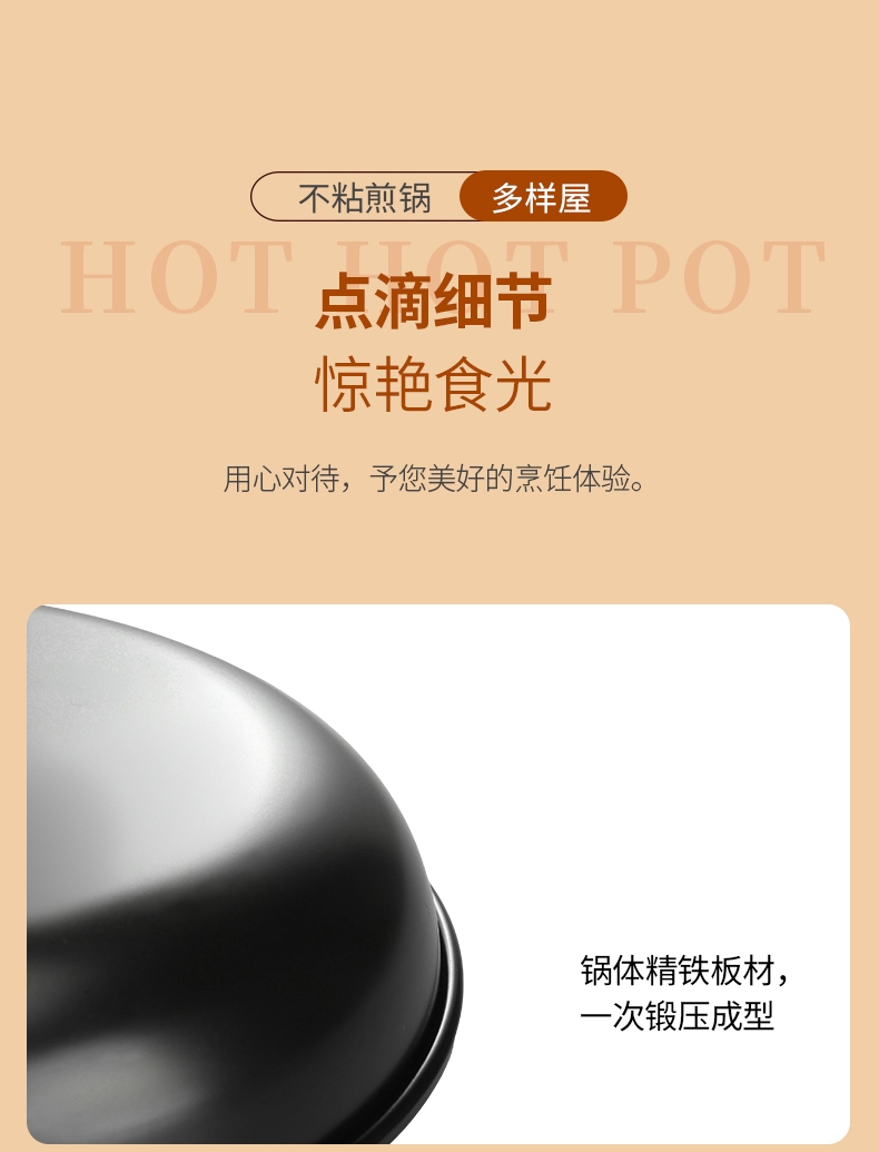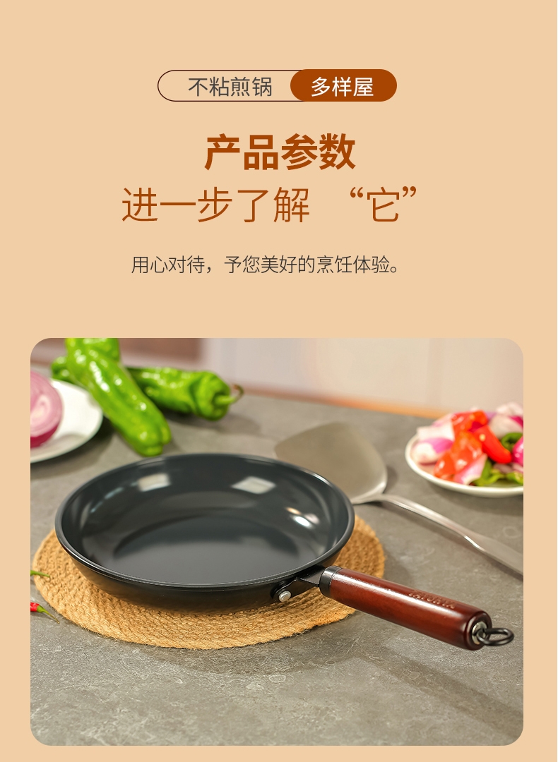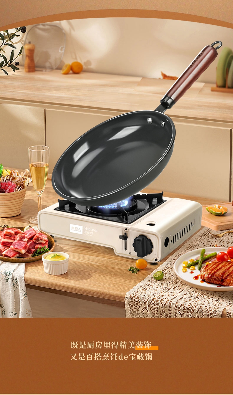 内表层采用零氟超硬陶瓷层,耐磨持久不粘;锅体优质精铁板材,一次锻压成型;手柄采用原木材料,人体力学设计,古朴大方,手感极佳;拥有优良的隔热和防烫效果;24CM直径锅体,受热面积大,燃气灶、电磁炉通用