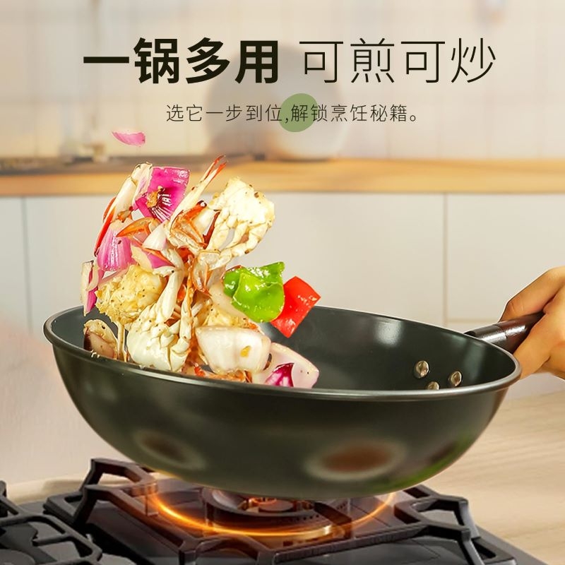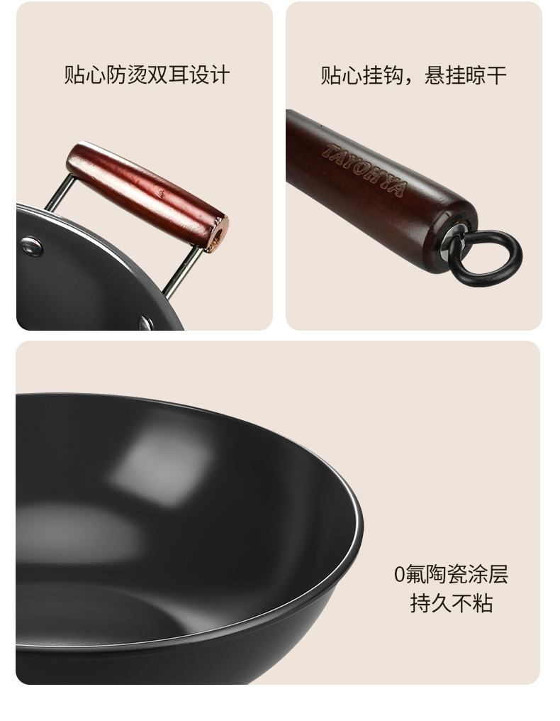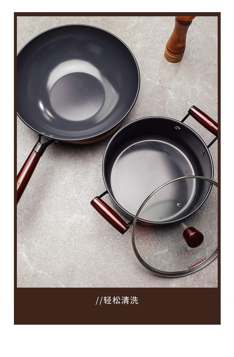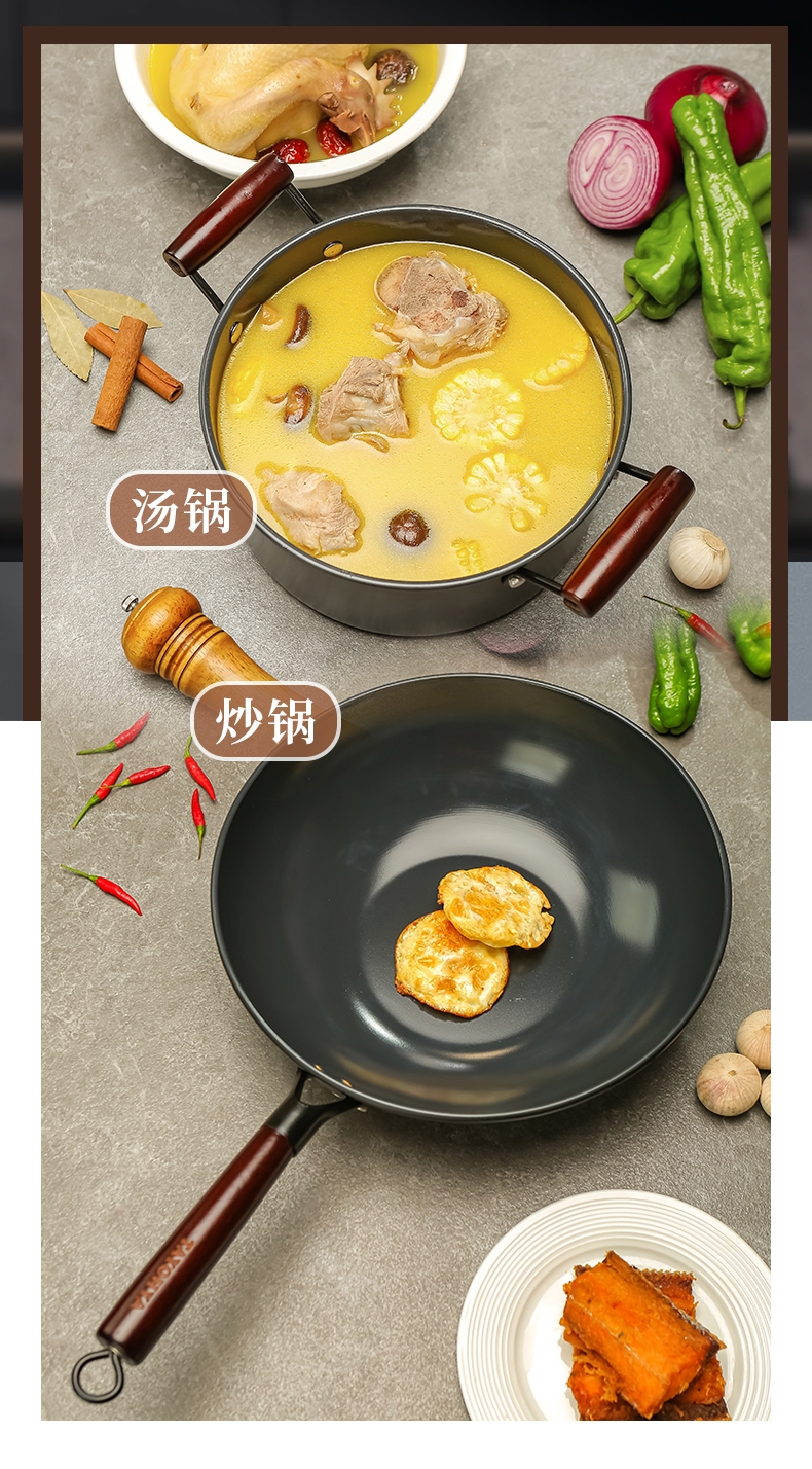 内表层采用零氟超硬陶瓷层,耐磨持久不粘;锅体优质精铁板材,一次锻压成型;手柄采用原木材料,人体力学设计,古朴大方,手感极佳;锅盖采用钢化玻璃,抗冲击性和耐高温更强,不易炸裂;燃气灶、电磁炉通用,不挑灶具