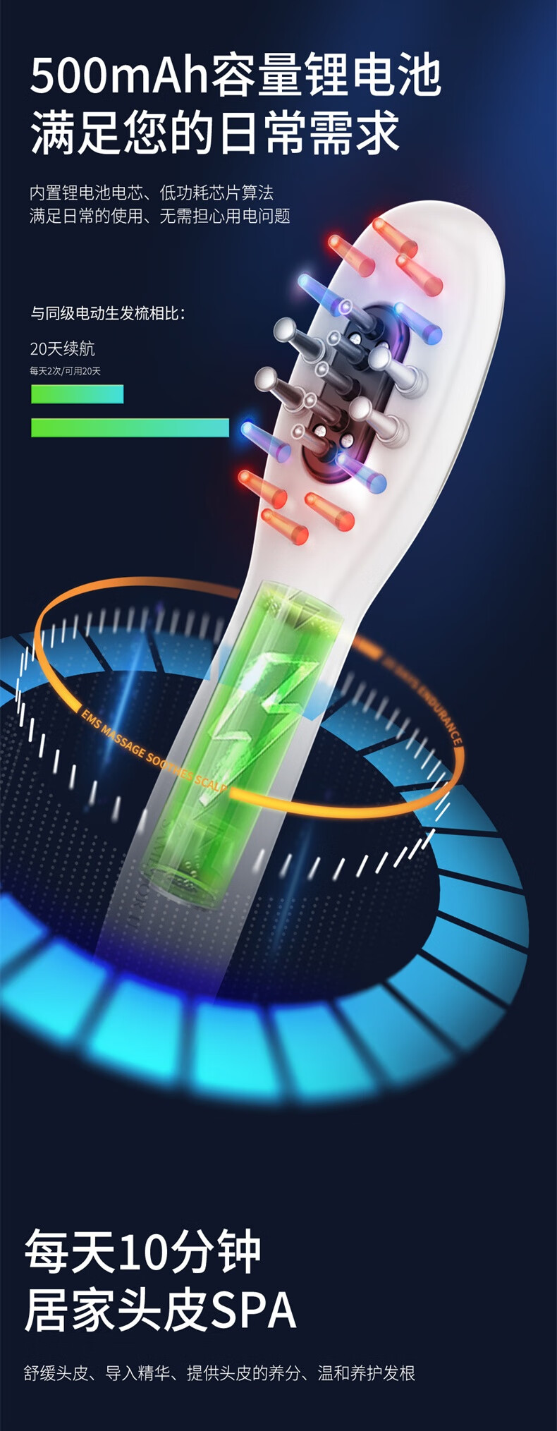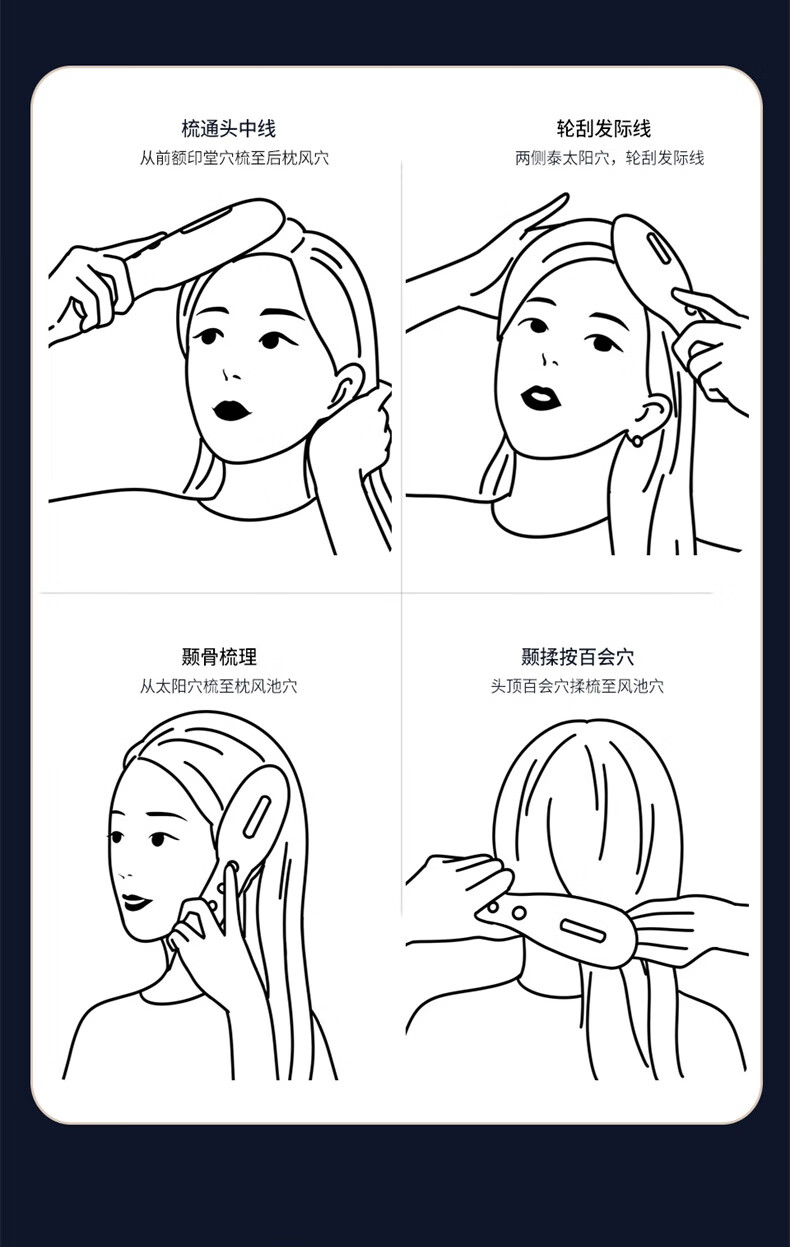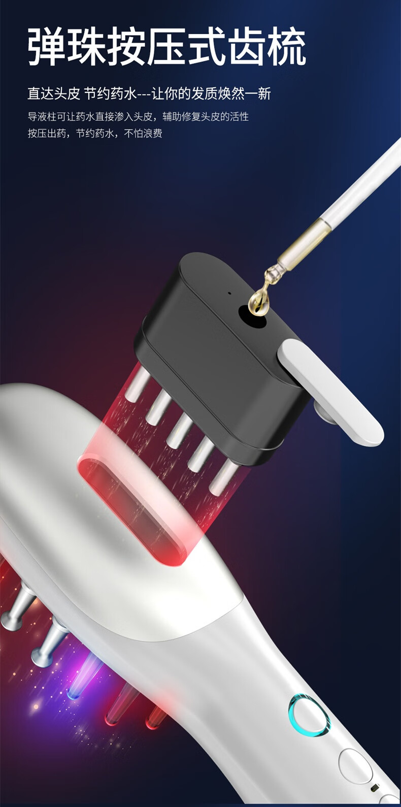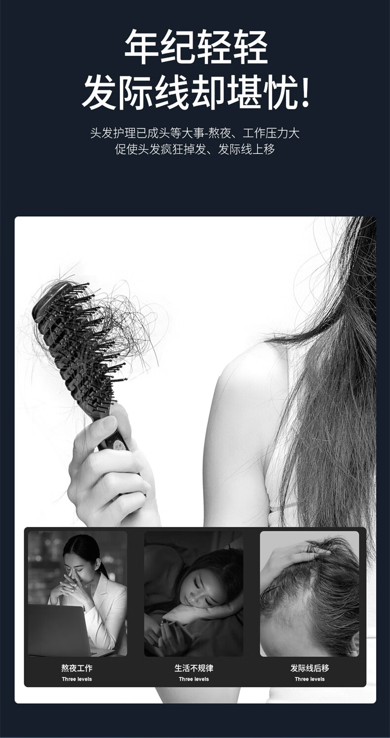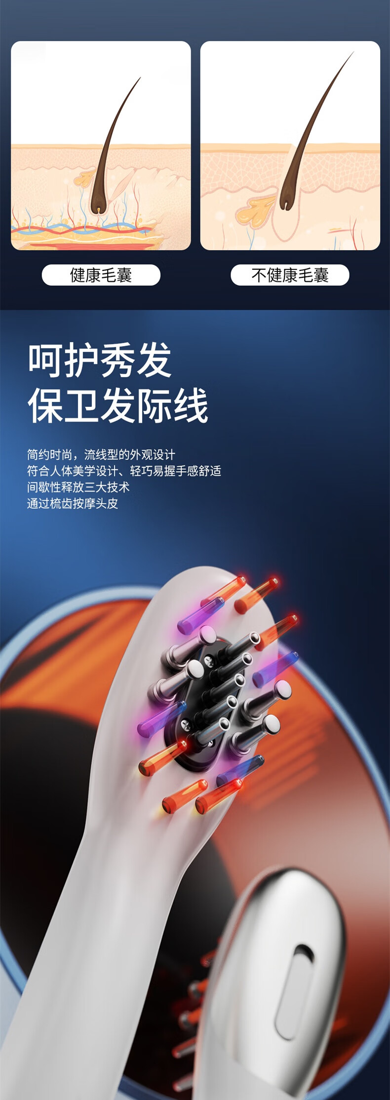 简约时尚,流线型的外观设计;符合人体美学设计、轻巧易握手感舒适;间歇性释放三大技术通过梳齿按摩头皮