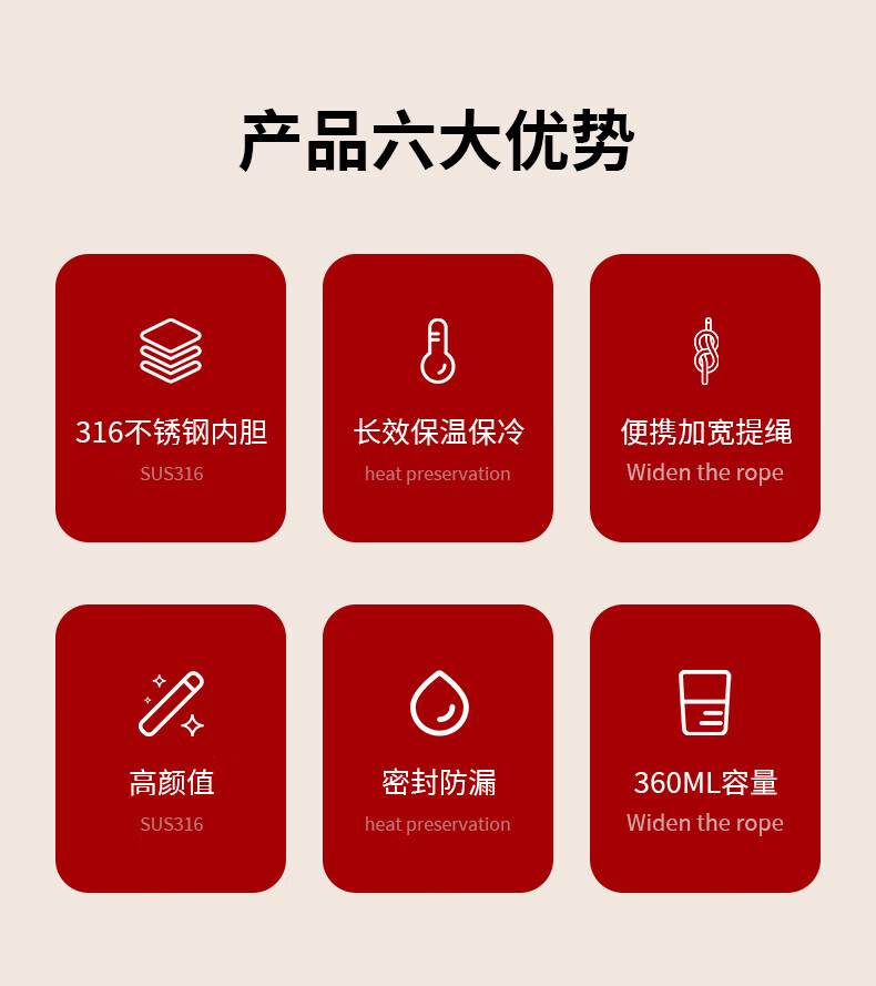 316拉伸不锈钢内胆材质,使用安心;自带温显功能,水温一目了然;强力锁温,延长控温时间