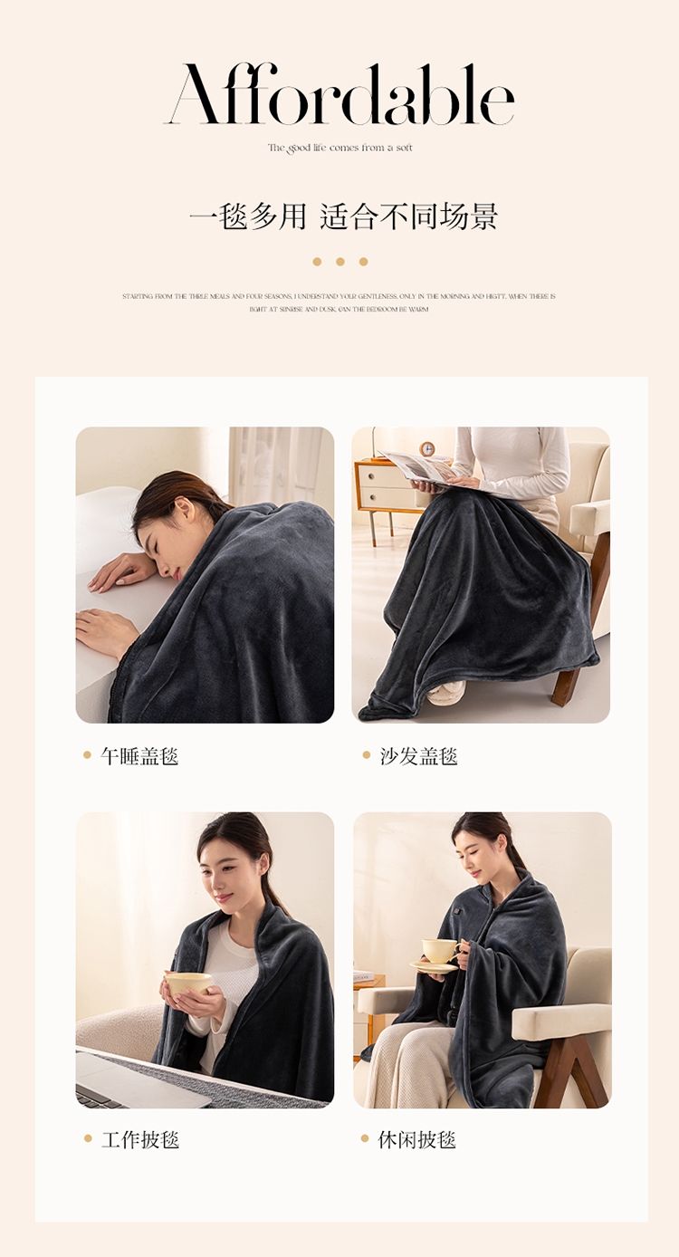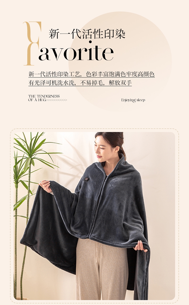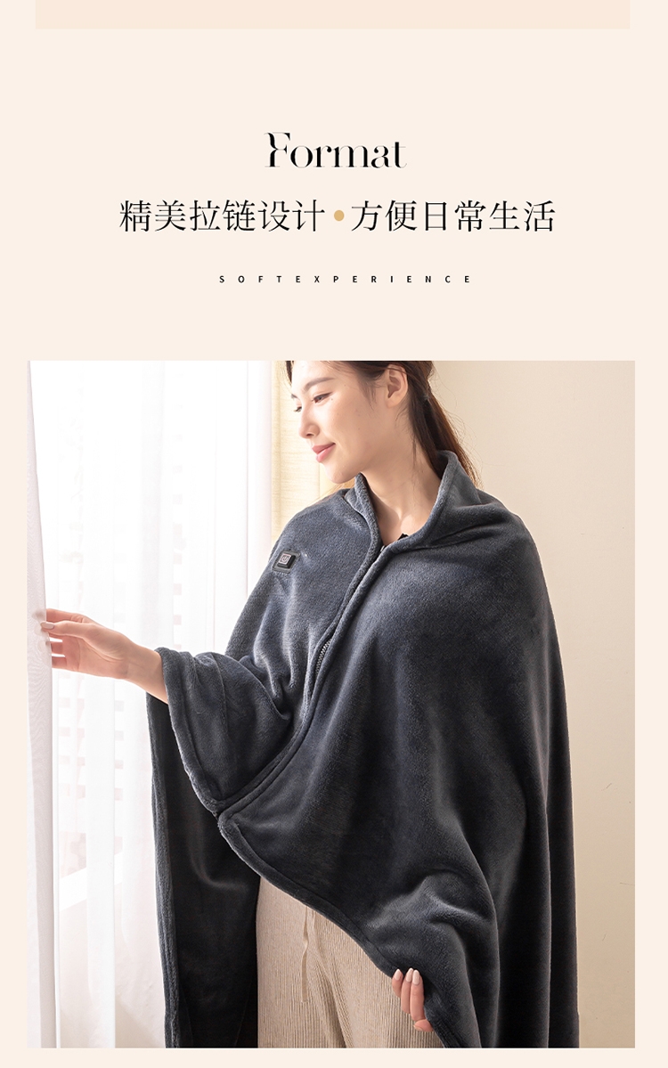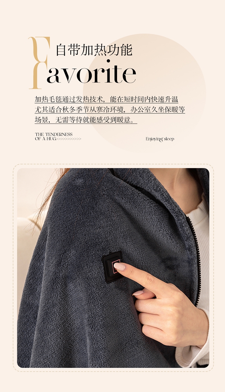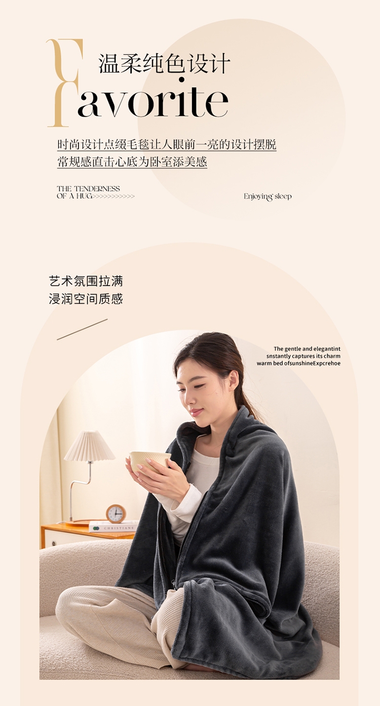 甄选牛奶绒面料 绒毛密集质感厚实、触感温润宠溺肌肤;加热毛毯通过发热技术,能在短时间内快速升温尤;USB供电,精美拉链设计·方便日常生活
